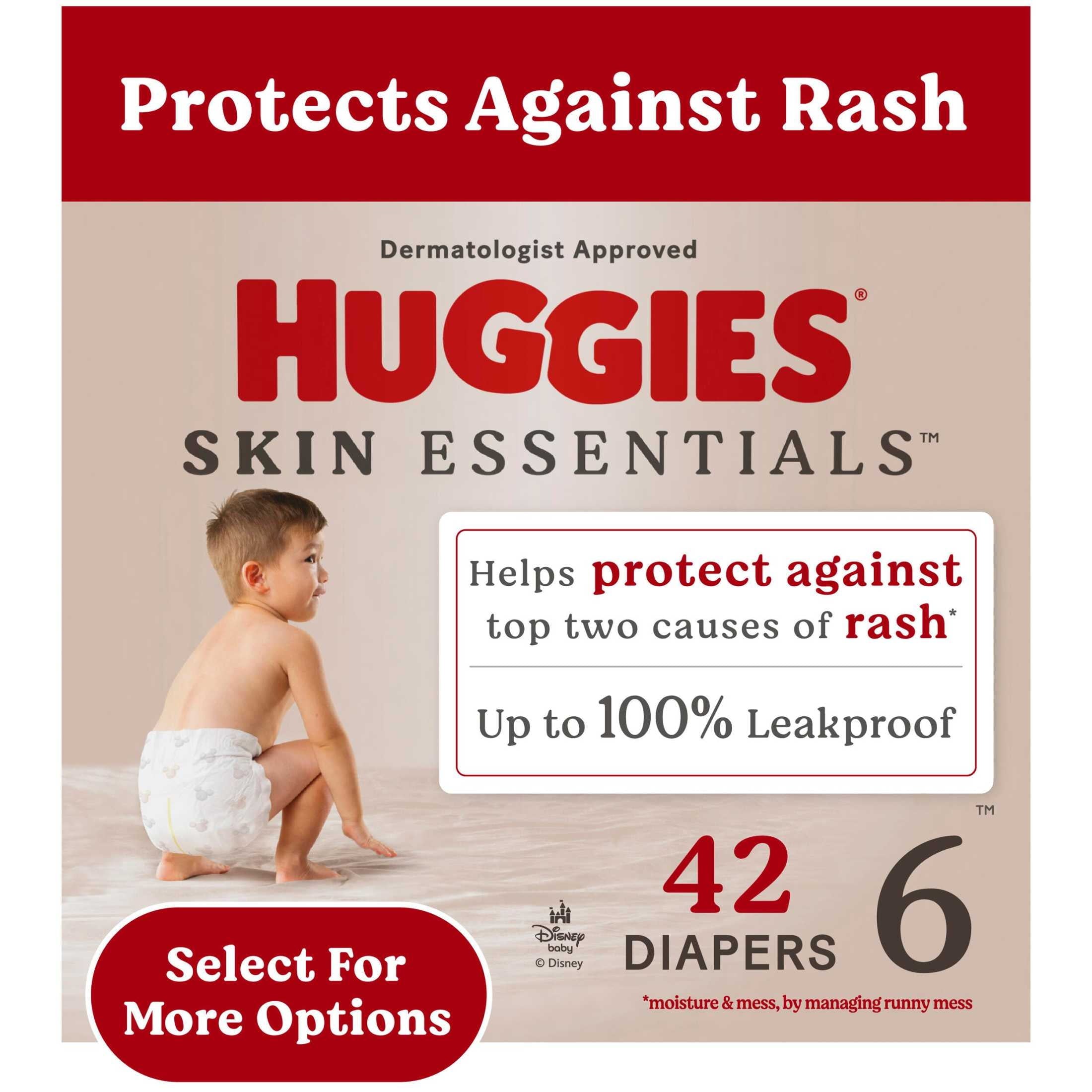 Your baby’s skin health is essential to their overall health and comfort, and Huggies Skin Essentials Baby Diapers want to help you make it a priority. Made with a SkinProtect Liner that helps lock away moisture and runny mess, Skin Essentials baby diapers help protect against the top two causes of rash.* Clinically tested safe for sensitive skin, Huggies Skin Essential newborn diapers are hypoallergenic and free of fragrance. These baby diapers are made without phthalates, parabens, elemental chorine, lotions & latex* (*natural rubber). Extremely soft for your baby’s comfort, Skin Essentials diapers feature a soft, breathable outer cover and is up to 100% leak free. Additionally, Skin Essentials diapers feature a wetness indicator that changes color when wet to alert you when the diaper needs to be changed. Huggies Skin Essentials diapers, wipes, and Pull-Ups training pants give you everything you want for your child's skin and nothing you don't. They’re dermatologist approved and designed to help keep skin clean and healthy from baby to BIG KID. These baby diapers feature Disney patterns as cute as you, baby! Huggies Skin Essential Diapers are available in size Newborn (6-9 lb.), size 1 (8-14 lb.), size 2 (12-18 lb.), size 3 (16-28 lb.), size 4 (22-37 lb.), size 5 (27+ lb.), and size 6 (35+ lb.). (*mess (by managing runny mess) and moisture)