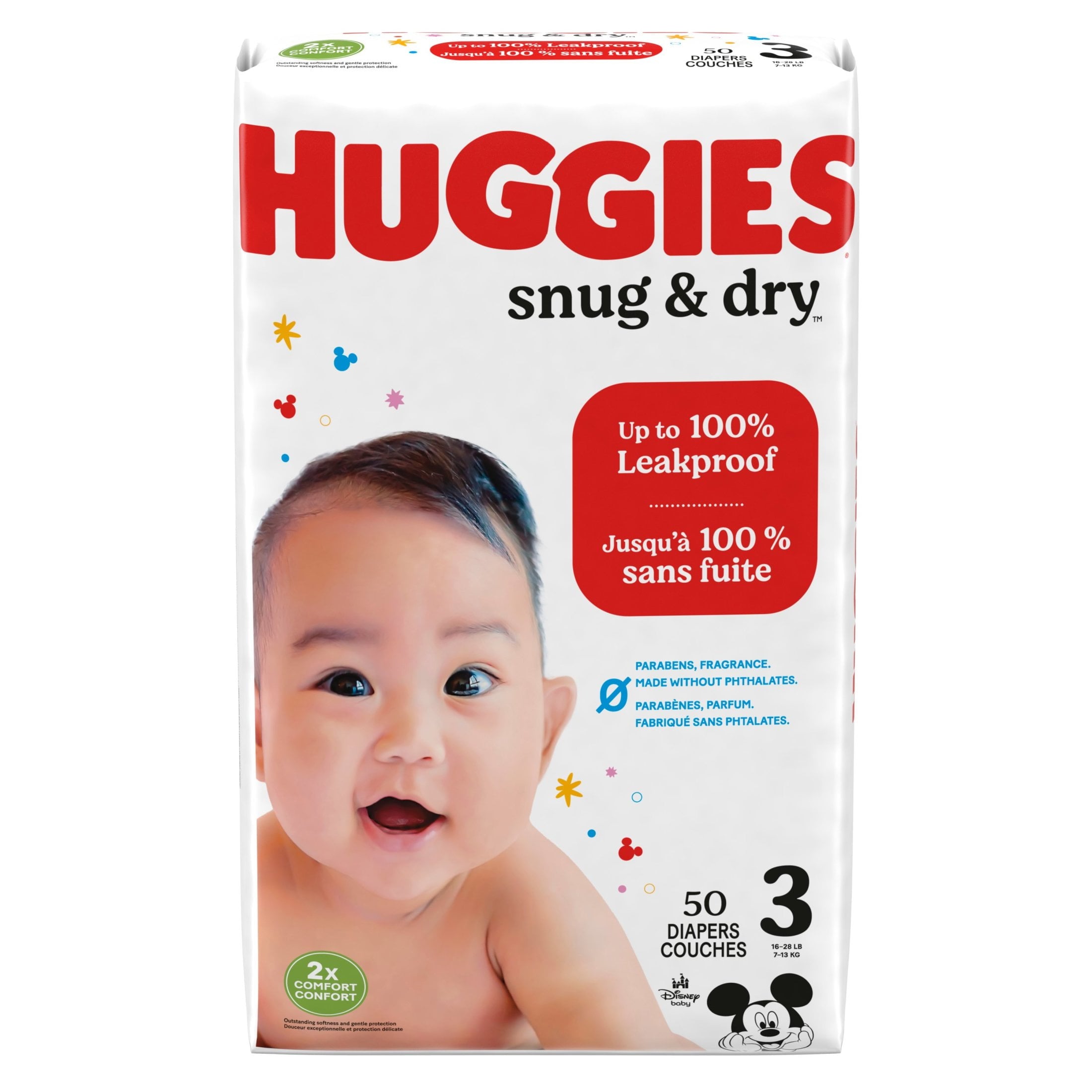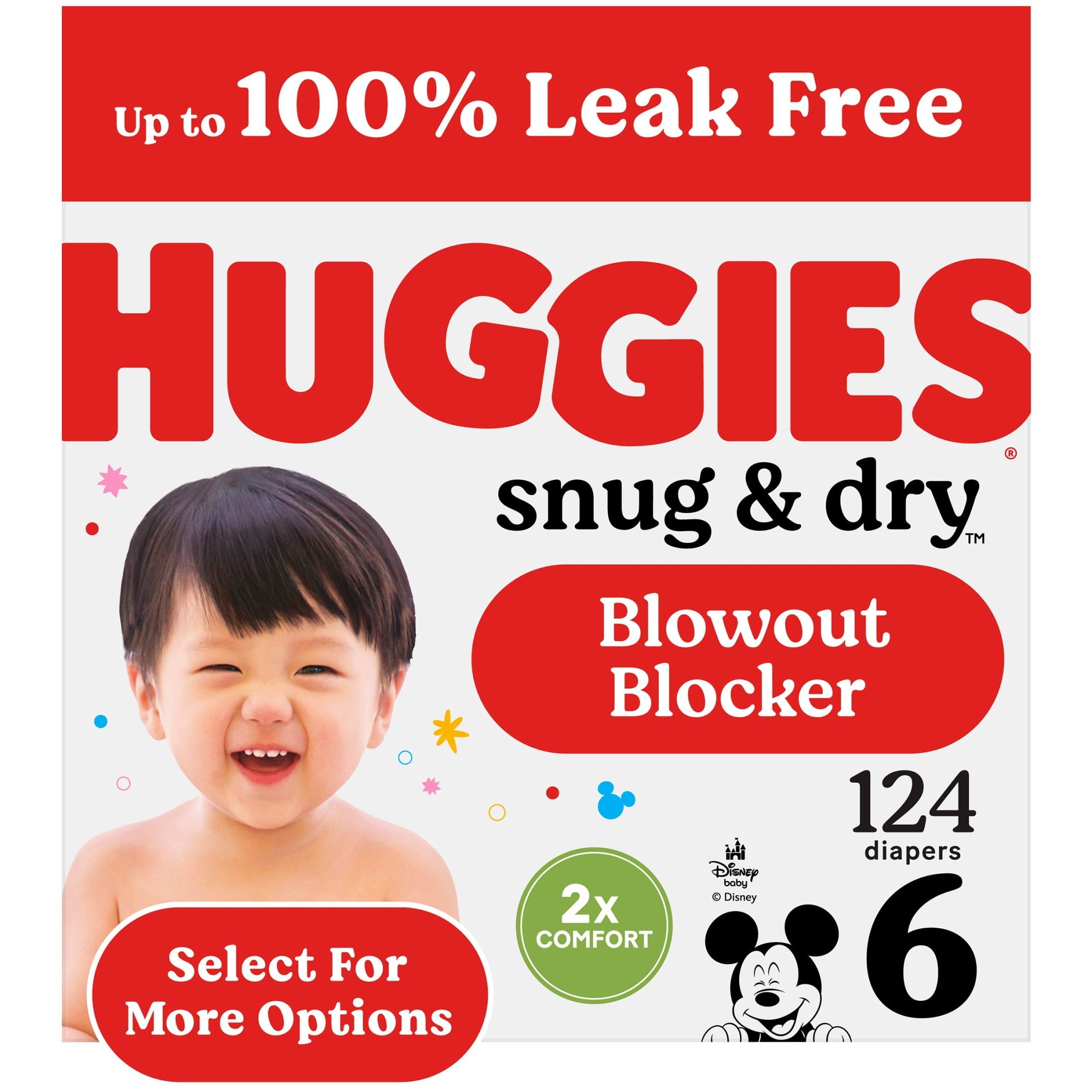 Parenting might be hard, but thanks to Huggies Snug & Dry Baby Diapers, diapering doesn’t have to be. As the only leading brand that is entirely fragrance free,* Snug & Dry newborn diapers are made to be free of fragrances, added lotions, parabens and natural rubber latex. When it comes to keeping your baby dry, Snug & Dry diapers are there for you even in messy situations. Our Snug & Dry infant diapers are up to 100% leak proof, even from blowouts. Made with the original Leak Lock blowout blocker, Snug & Dry baby diapers help protect against blowouts and ensuing messes. Additionally, these diapers are designed with a curved and stretchy fit for outstanding leakage protection. Made to help your baby live their best life, our infant diapers feature 2X comfort design to provide outstanding softness and gentle protection. An added wetness indicator changes colors when the diaper is wet, allowing you to know right when the diaper needs to be changed. Featuring exclusive Disney designs, Huggies Snug & Dry Diapers are available in size Newborn (6-9 lb.), size 1 (8-14 lb.), size 2 (12-18 lb.), size 3 (16-28 lb.), size 4 (22-37 lb.), size 5 (27+ lb.), size 6 (35+ lb.), size 7 (41+ lb.) and size 8 (46+ lb.). (*among leading national diaper brands, across all offered variants) (**among branded open diapers. Excludes preemie size.)