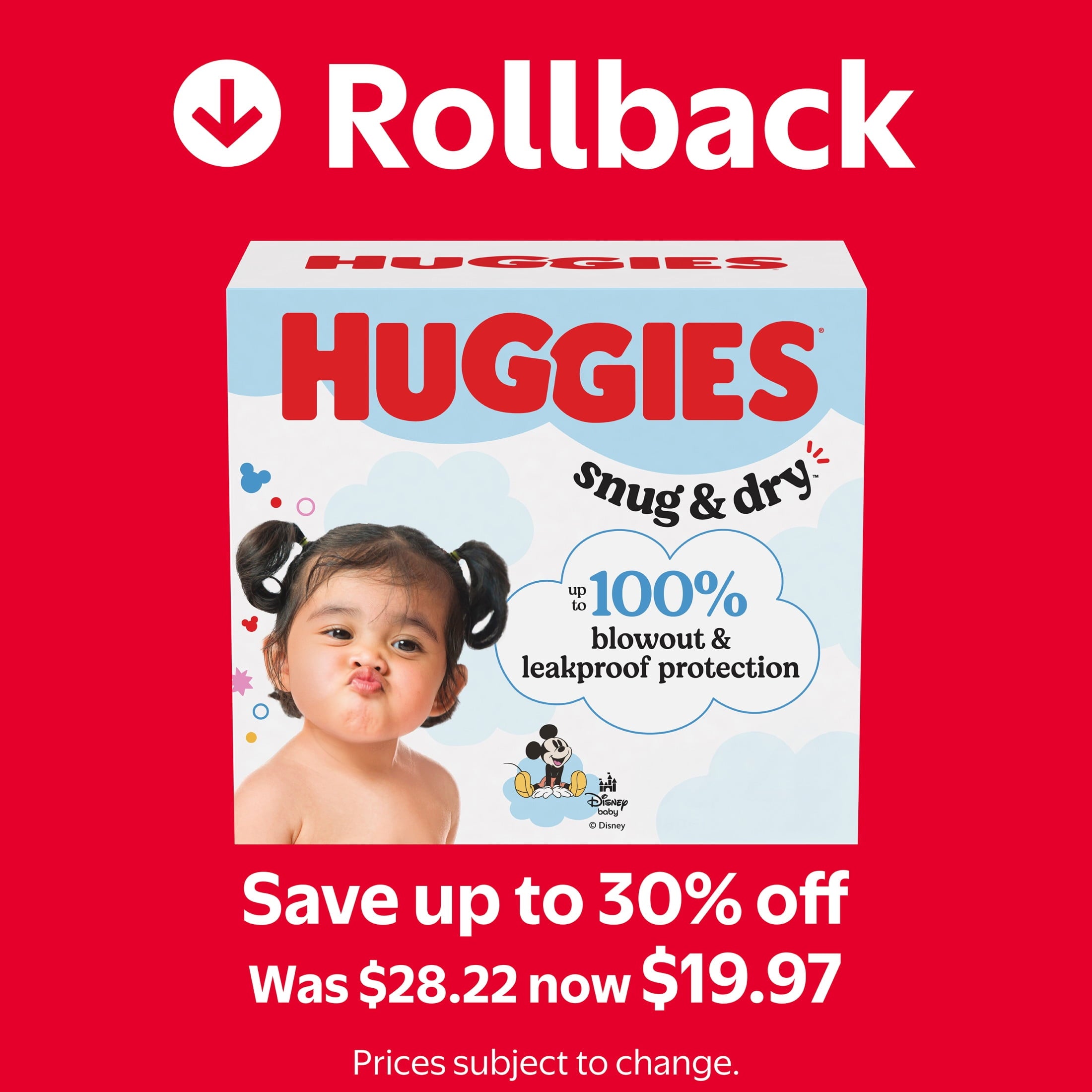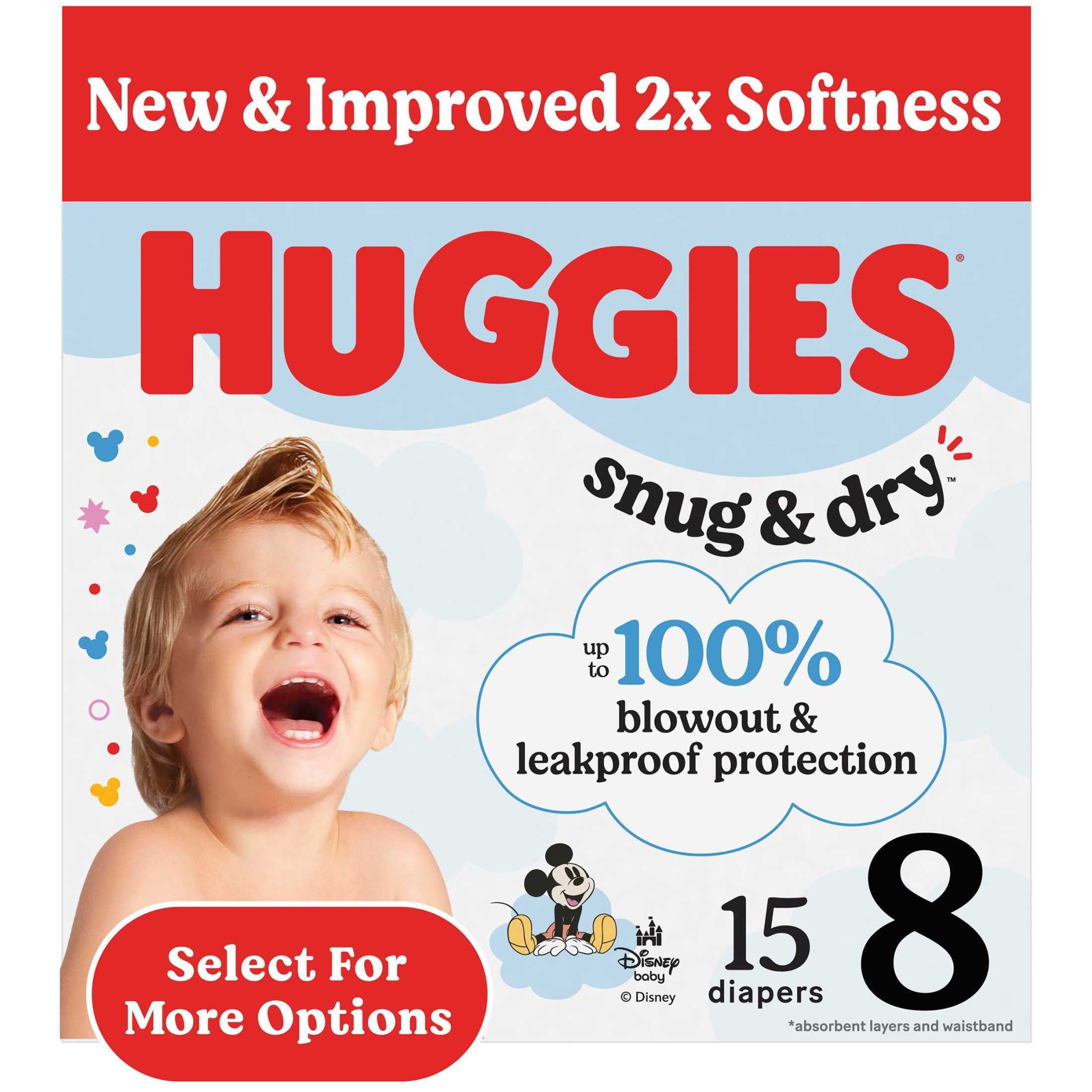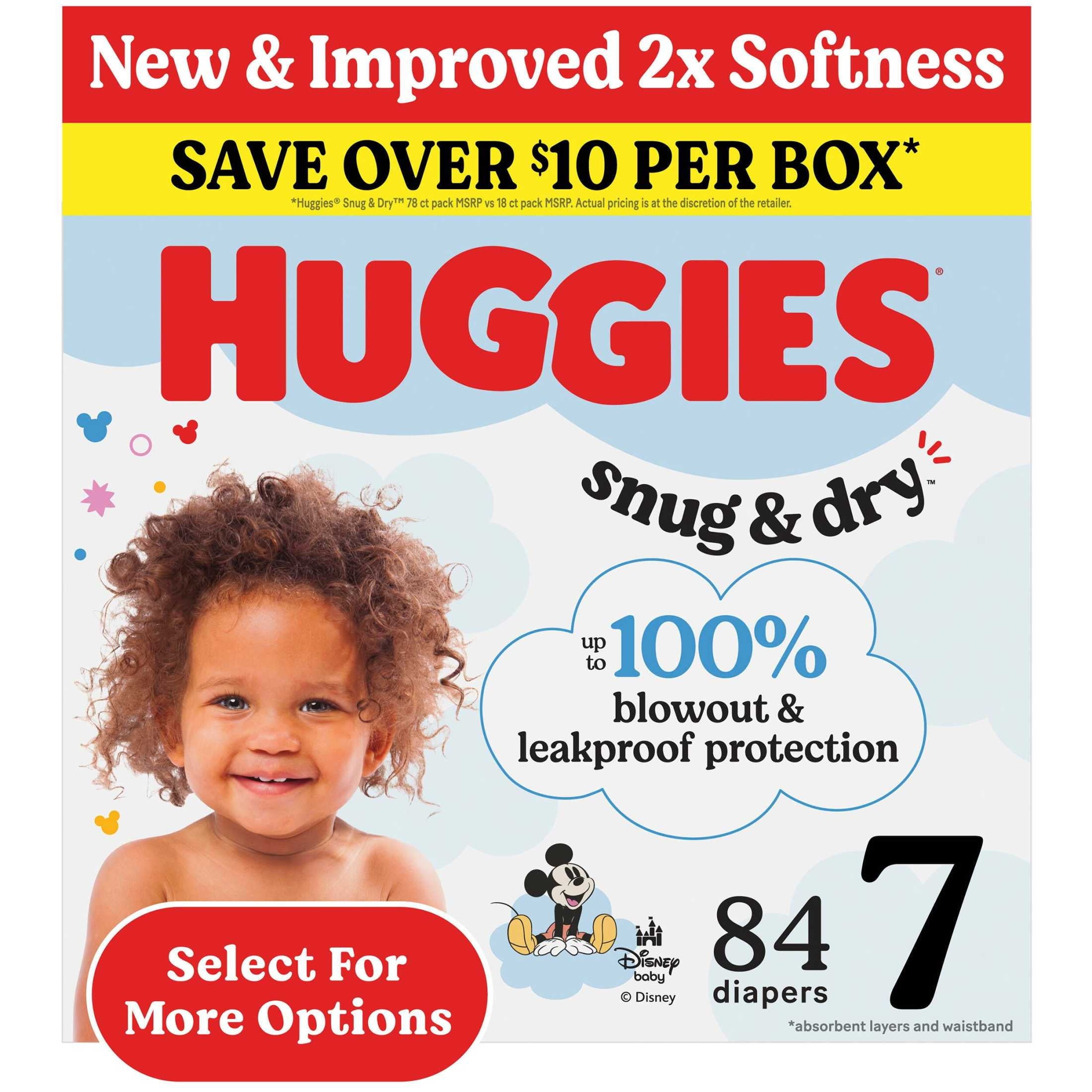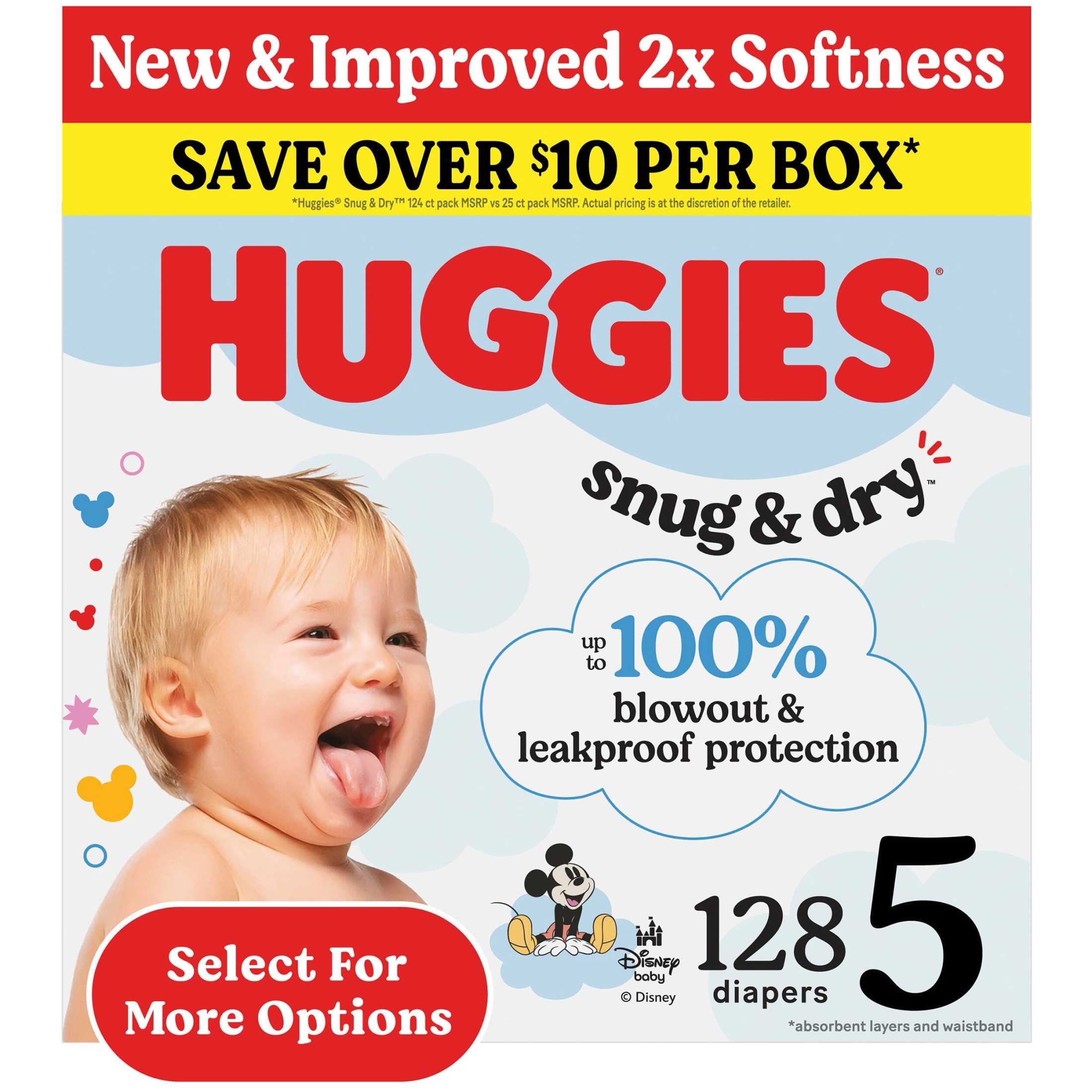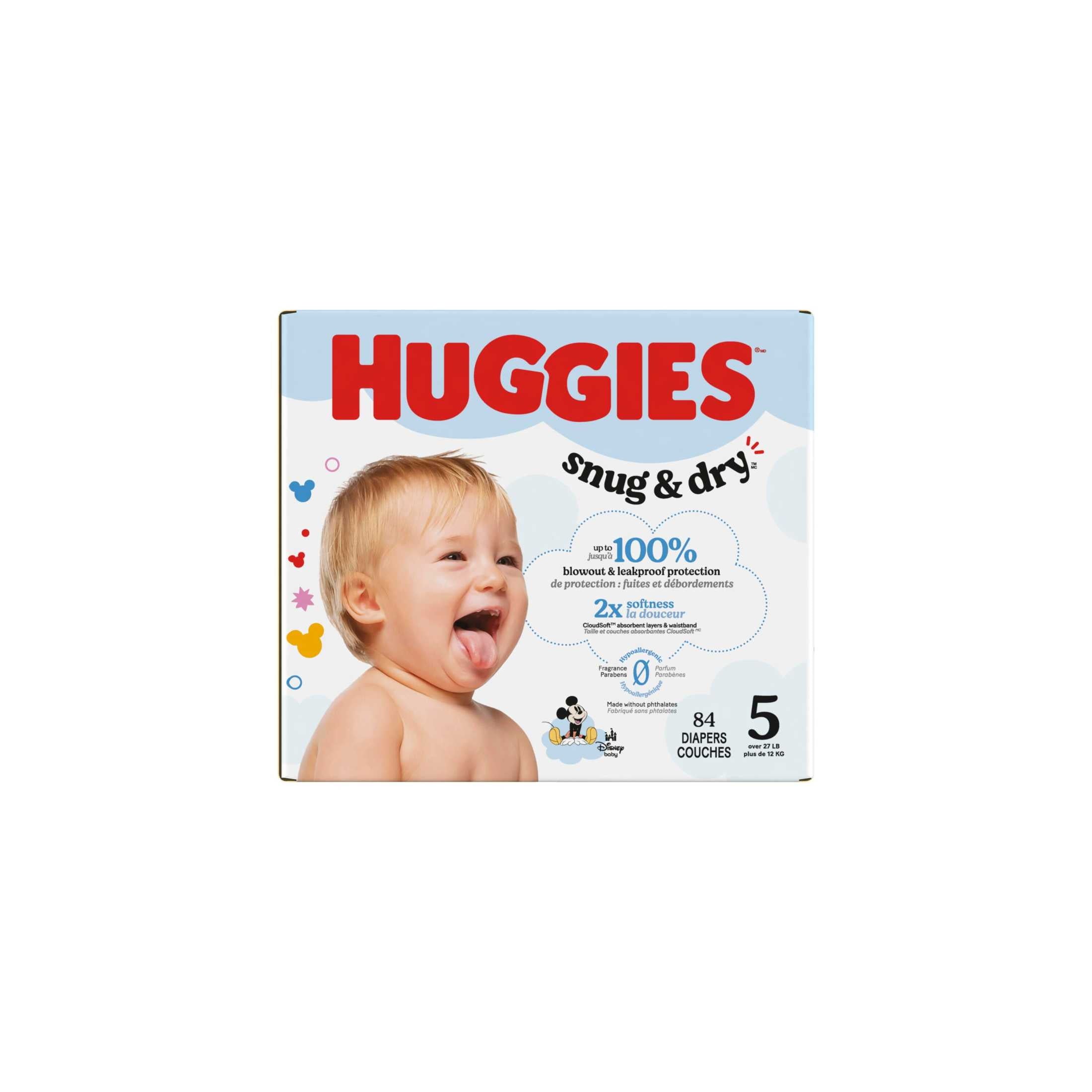 Our Snug & Dry diapers are designed with 2x softness: CloudSoft absorbent layers and waistband and a curved and stretchy fit. Softer than the leading premium diaper, more parents choose Huggies Snug & Dry baby diapers as softer.* With Snug & Dry baby diapers, you can bring up to 100% leak and blowout protection to your diapering routine. Made with the original Leak Lock blowout blocker, Snug & Dry baby diapers help provide up to 100% leak proof and blowout protection. Additionally, these diapers are designed with a curved and stretchy fit and outstanding leakage protection. As the only leading brand that is entirely fragrance free,* Snug & Dry diapers size 5 are free of fragrances and elemental chlorine. They are also made without lotions and natural rubber latex. To better alert you when a diaper change is needed, the wetness indicator on Snug & Dry disposable diapers changes color when wet. Available in exclusive Disney designs, Huggies Snug & Dry Diapers are available in size Newborn (6-9 lb.), size 1 (8-14 lb.), size 2 (12-18 lb.), size 3 (16-28 lb.), size 4 (22-37 lb.), size 5 (27+ lb.), size 6 (35+ lb.), size 7 (41+ lb.) and size 8 (46+ lb.). (*vs leading premium diaper) (**among leading national diaper brands, across all offered variants) (***among branded open diapers. Excludes preemie size.)