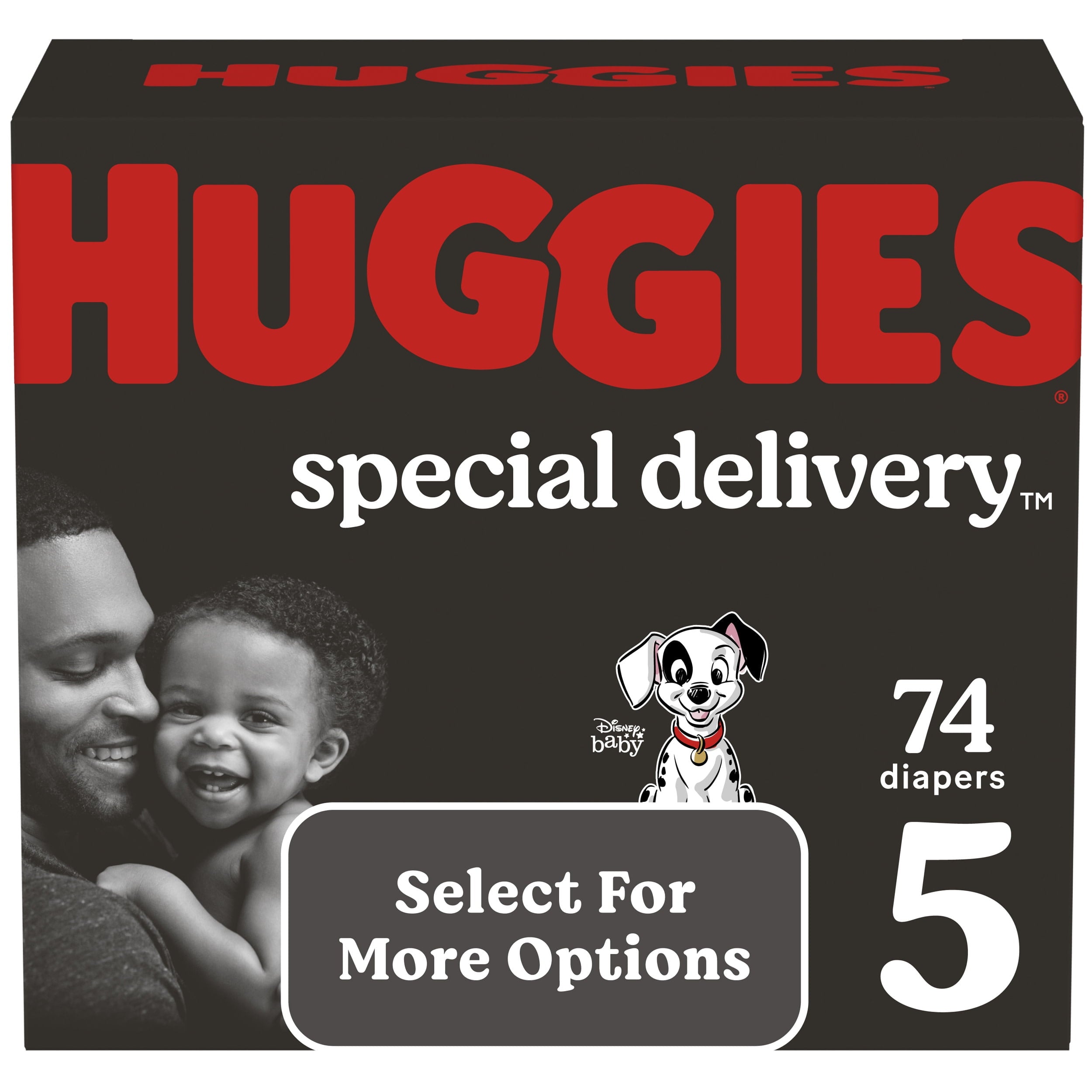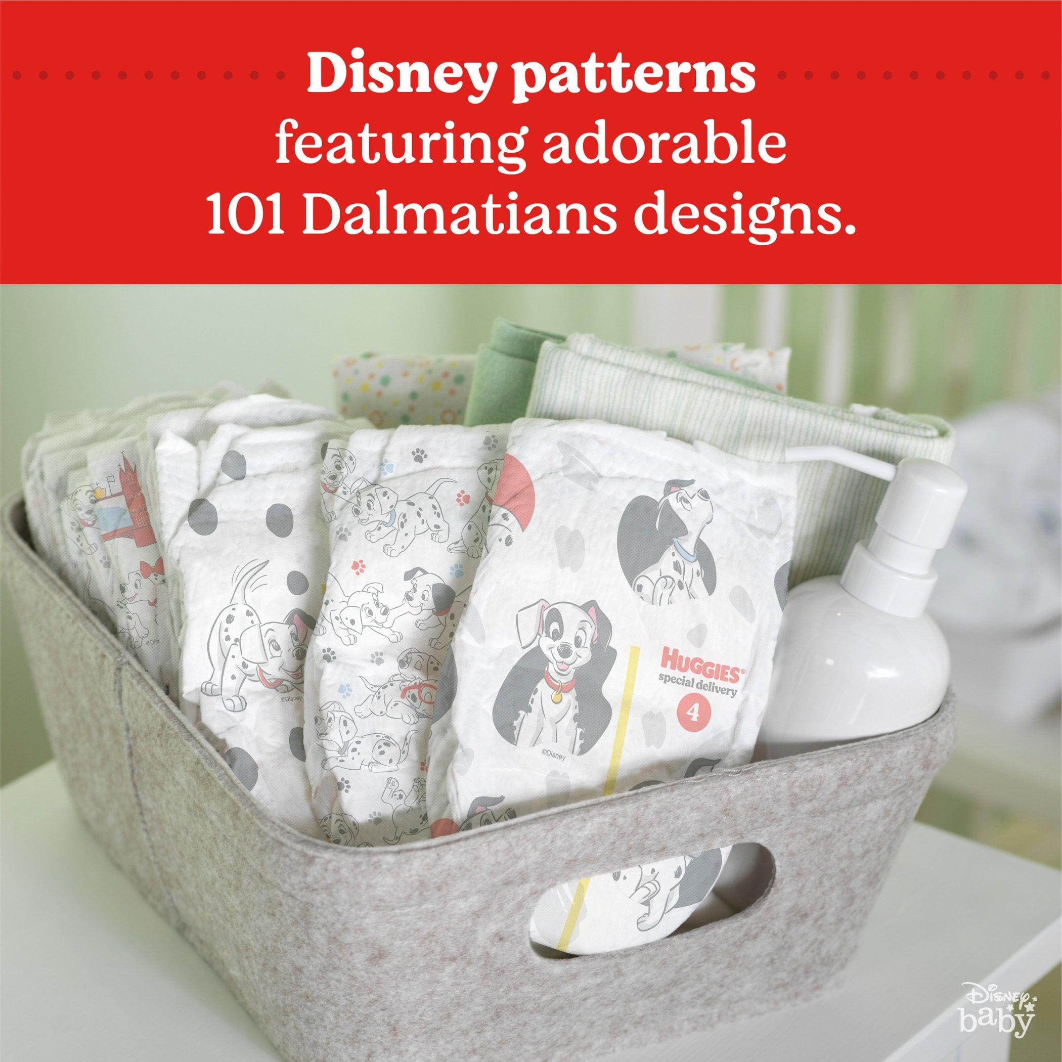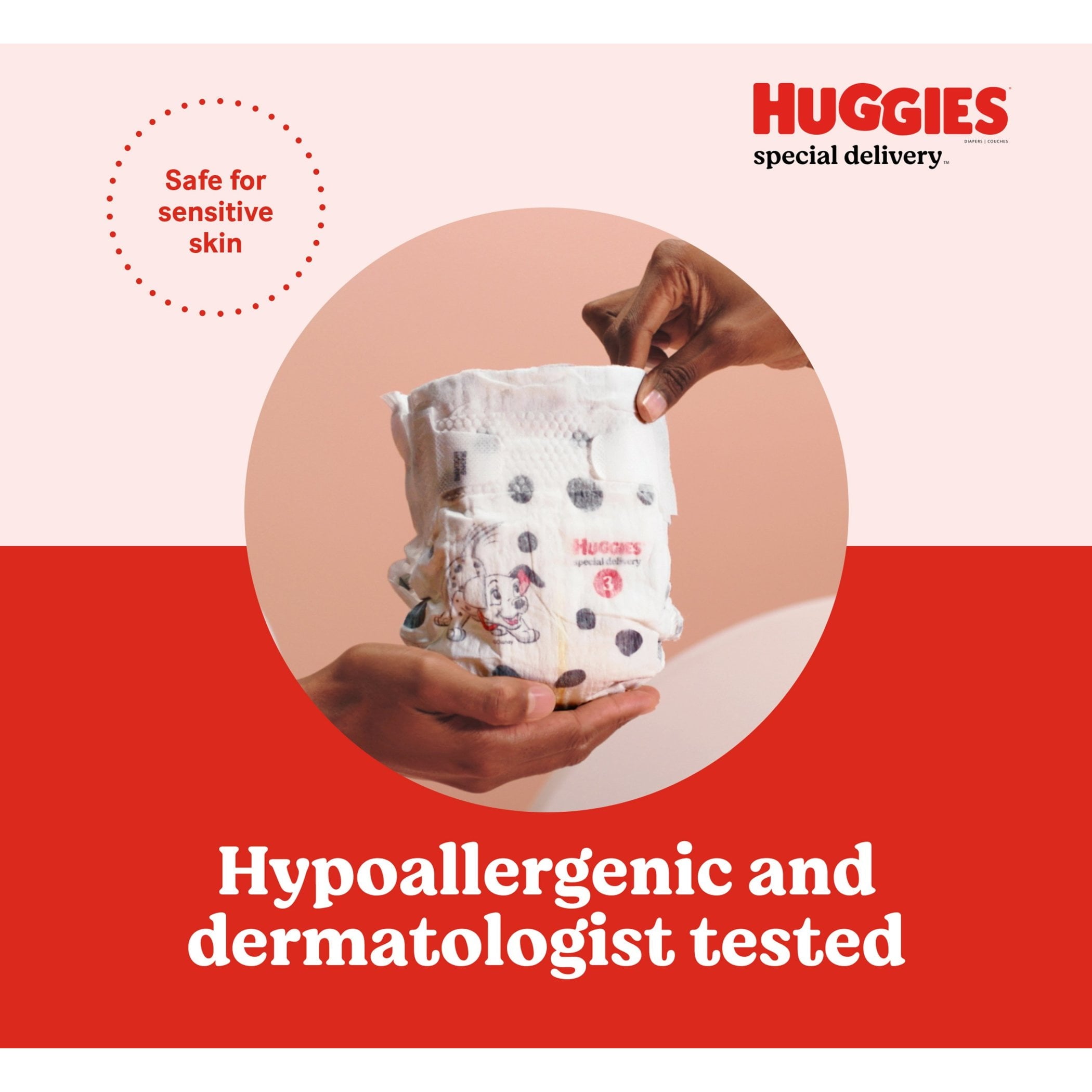 Inspired by your perfect care, Huggies Special Delivery Baby Diapers are our perfect diaper and the Softest Diapers Guaranteed*, love it or we'll refund it 100%! Special Delivery is crafted with plant-based materials**(**20%+ by weight) and no harsh ingredients. They're hypoallergenic, dermatologist-tested and free of fragrances, parabens and elemental chlorine bleach, making them safe for sensitive skin. Each baby diaper has a contoured shape and soft, flexible leg cuffs for extra comfort while keeping the mess in. A soft, back pocketed waistband also helps to prevent diaper blowouts as the diaper works to absorb and lock away moisture on contact to keep your baby's skin clean and healthy. Offering Huggies Trusted Protection with responsibly sourced materials***, Special Delivery Baby Diapers are lightweight and breathable, complete with a 100% breathable cover to provide airflow so your baby can stay dry. Plus, these disposable baby diapers feature a wetness indicator with a yellow line that turns blue when wet, easily letting you know when your baby is ready for a diaper change. Huggies Special Delivery Diapers come in exclusive 101 Dalmatians designs and are available in size Newborn (up to 10 lbs), size 1 (8-14 lbs), size 2 (12-18 lbs), size 3 (16-28 lbs), size 4 (22-37 lbs), size 5 (27+ lbs), and size 6 (35+ lbs). (***Forest Stewardship Council certified pulp)