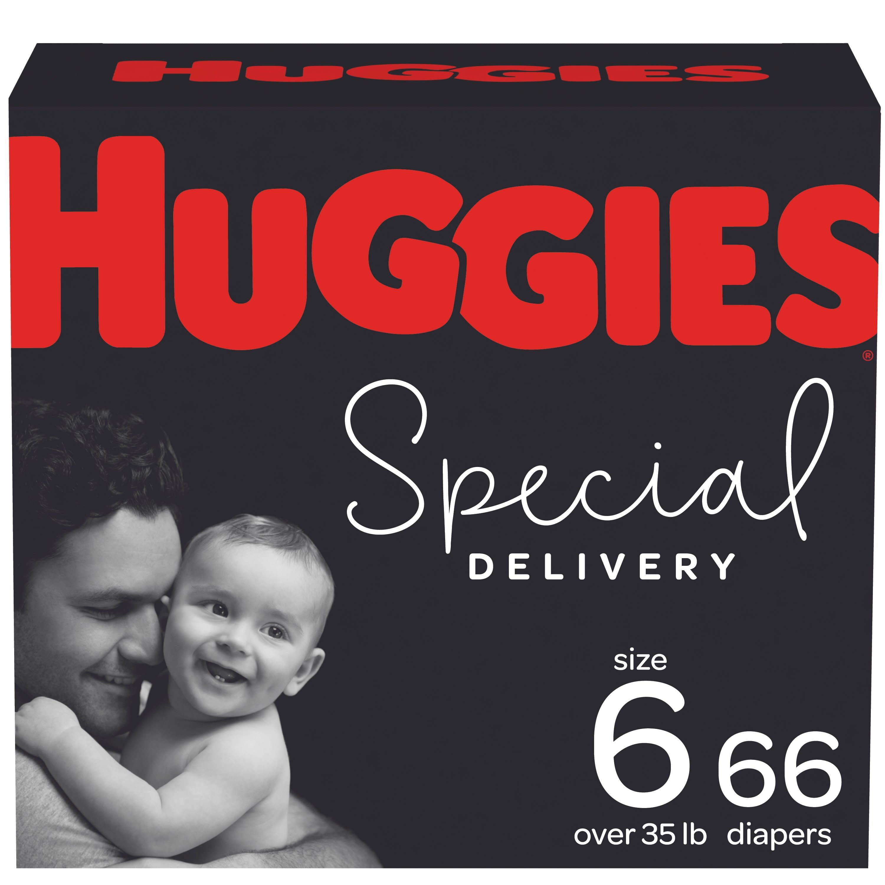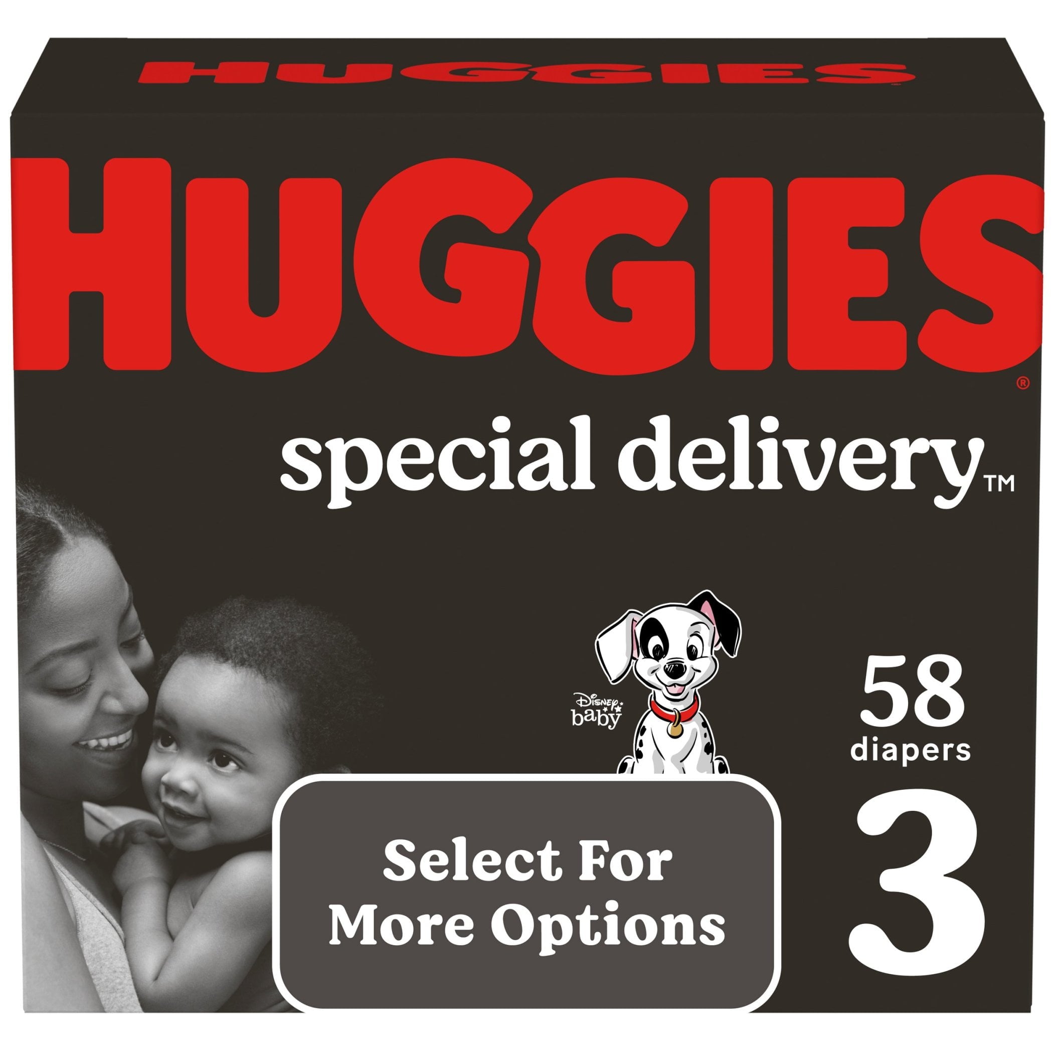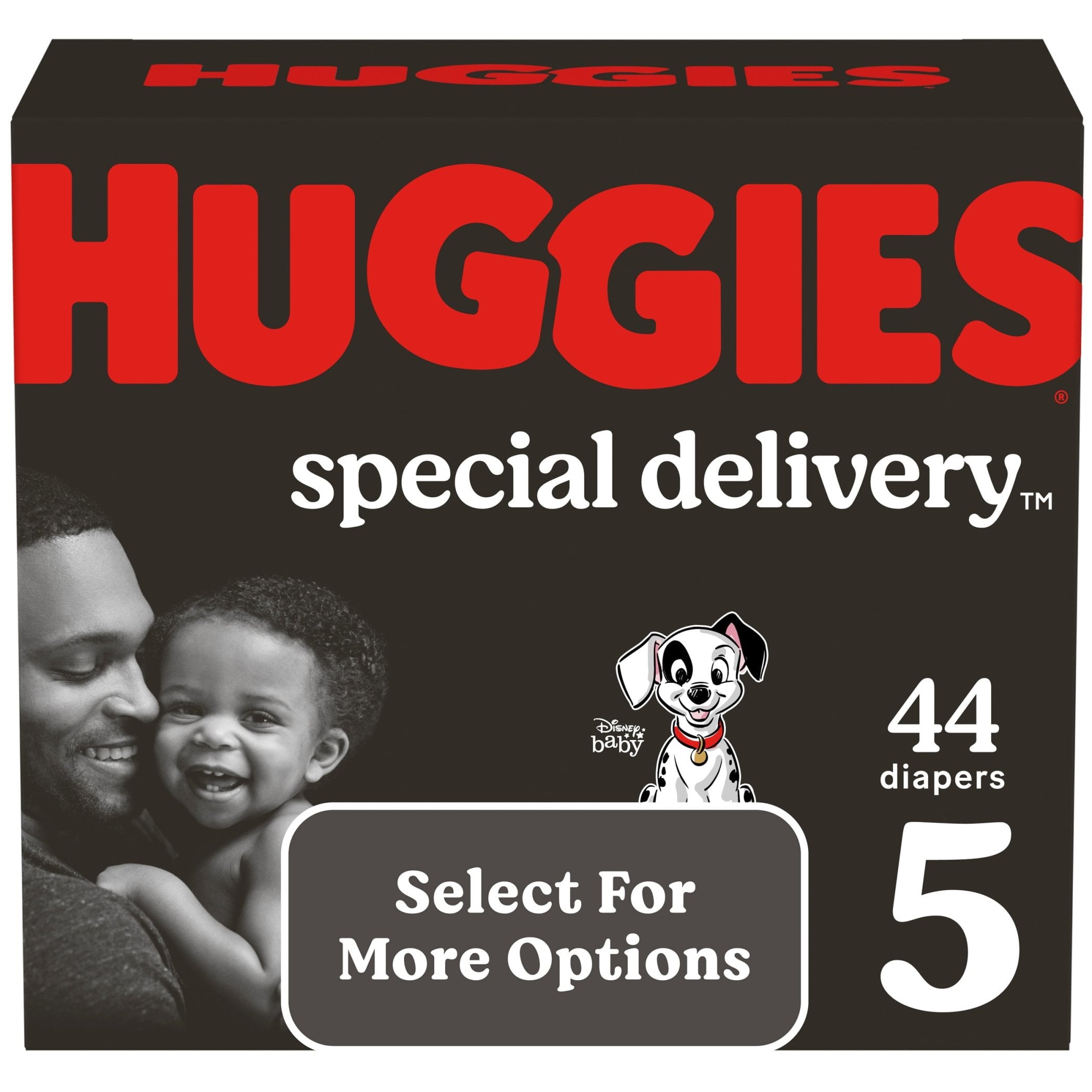 Inspired by your perfect care, Huggies Special Delivery Baby Diapers are our perfect diaper and the Softest Diapers Guaranteed*, love it or we'll refund it 100%! Special Delivery is crafted with plant-based materials**(**20%+ by weight) and no harsh ingredients. They're hypoallergenic, dermatologist-tested and free of fragrances, parabens and elemental chlorine bleach, making them safe for sensitive skin. Each baby diaper has a contoured shape and soft, flexible leg cuffs for extra comfort while keeping the mess in. A soft, back pocketed waistband also helps to prevent diaper blowouts as the diaper works to absorb and lock away moisture on contact to keep your baby's skin clean and healthy. Offering Huggies Trusted Protection with responsibly sourced materials***, Special Delivery Baby Diapers are lightweight and breathable, complete with a 100% breathable cover to provide airflow so your baby can stay dry. Plus, these disposable baby diapers feature a wetness indicator with a yellow line that turns blue when wet, easily letting you know when your baby is ready for a diaper change. Huggies Special Delivery Diapers come in exclusive 101 Dalmatians designs and are available in size Newborn (up to 10 lbs), size 1 (8-14 lbs), size 2 (12-18 lbs), size 3 (16-28 lbs), size 4 (22-37 lbs), size 5 (27+ lbs), and size 6 (35+ lbs). (***Forest Stewardship Council certified pulp)