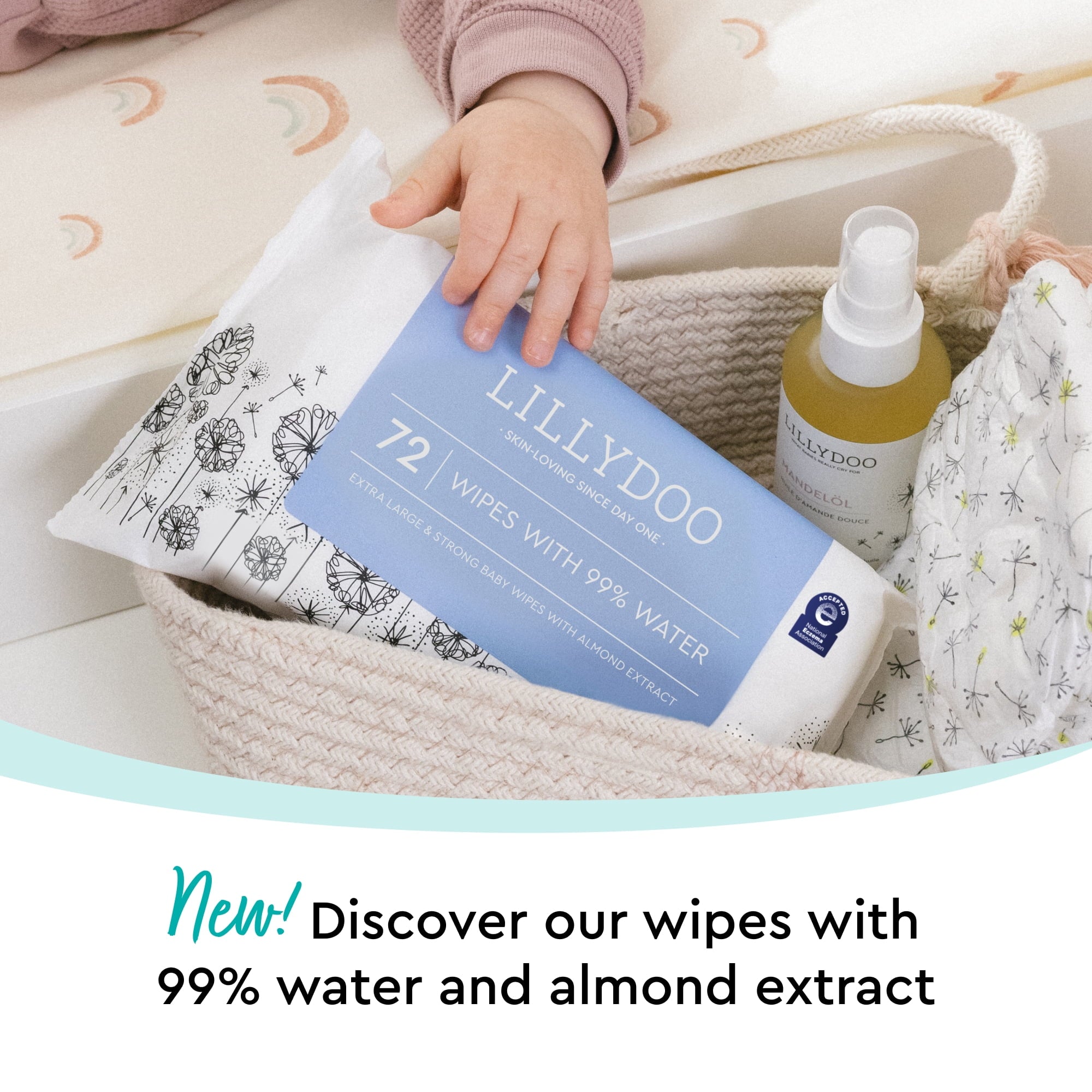 Like you, we only want the best for your little one. That’s why we create wipes that are as gentle as possible and as strong as needed—without unnecessary extras. Made with 99% water, LILLYDOO Wipes are the ideal alternative to water and cotton, offering gentle cleansing while caring for delicate skin. We've never produced a wipe that wasn't made of 100% plastic-free, plant-based material—because we believe in making choices that are both skin-friendly and sustainable. With almond extract, our wipes provide an extra touch of care while remaining fragrance-free, hypoallergenic, and dermatologically tested. They are vegan-certified and have been accepted by the National Eczema Association, ensuring they are suitable for even the most sensitive little explorers' skin. Their tear-resistant yet soft texture makes them a reliable companion for every messy moment, whether at home or on the go. Because sometimes, less is simply more.