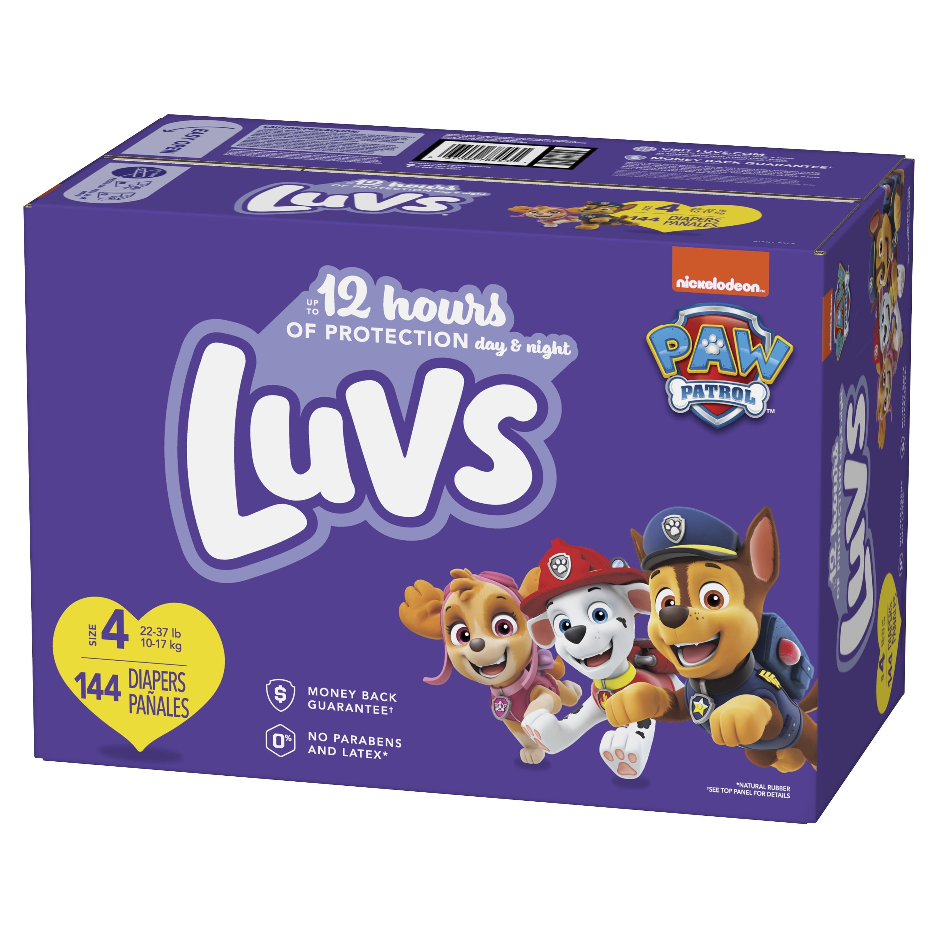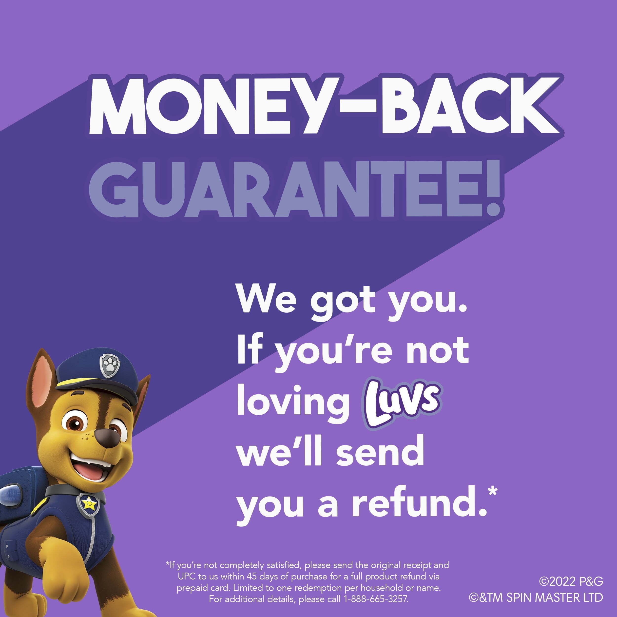 No job is too big, no pup is too small! Luvs diapers with new Paw Patrol designs have your back-and their butts. Luvs now has up to 12 hours of protection, day and night. Like Chase and Marshall would say, our highly trained paws are at your service. And diaper leaks? We're on the case with nonstop leak protection. Luvs Triple Leakguards absorb quickly to help stop diaper leaks before they happen. But our leak protection doesn't stop there. Secure cuffs and stretchy sides keep leaks locked in where they happen the most. Forget about cheap, leaky diapers and spend more time enjoying this ride known as parenting. With Luvs you know when they go, thanks to a wetness indicator that turns blue on contact with wetness. You care what your baby wears, so Luvs diapers are 100% hypoallergenic, made free of parabens and free of latex* (*natural rubber). When it comes to the ultimate diaper protection, these paws uphold the laws. Our diapers are so good, you don't need this, but Luvs does offer a money-back guarantee. If you aren't fully loving your Luvs diapers, we will gladly send you a refund. See luvsdiapers.com for terms and conditions.