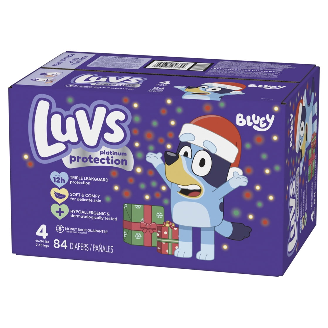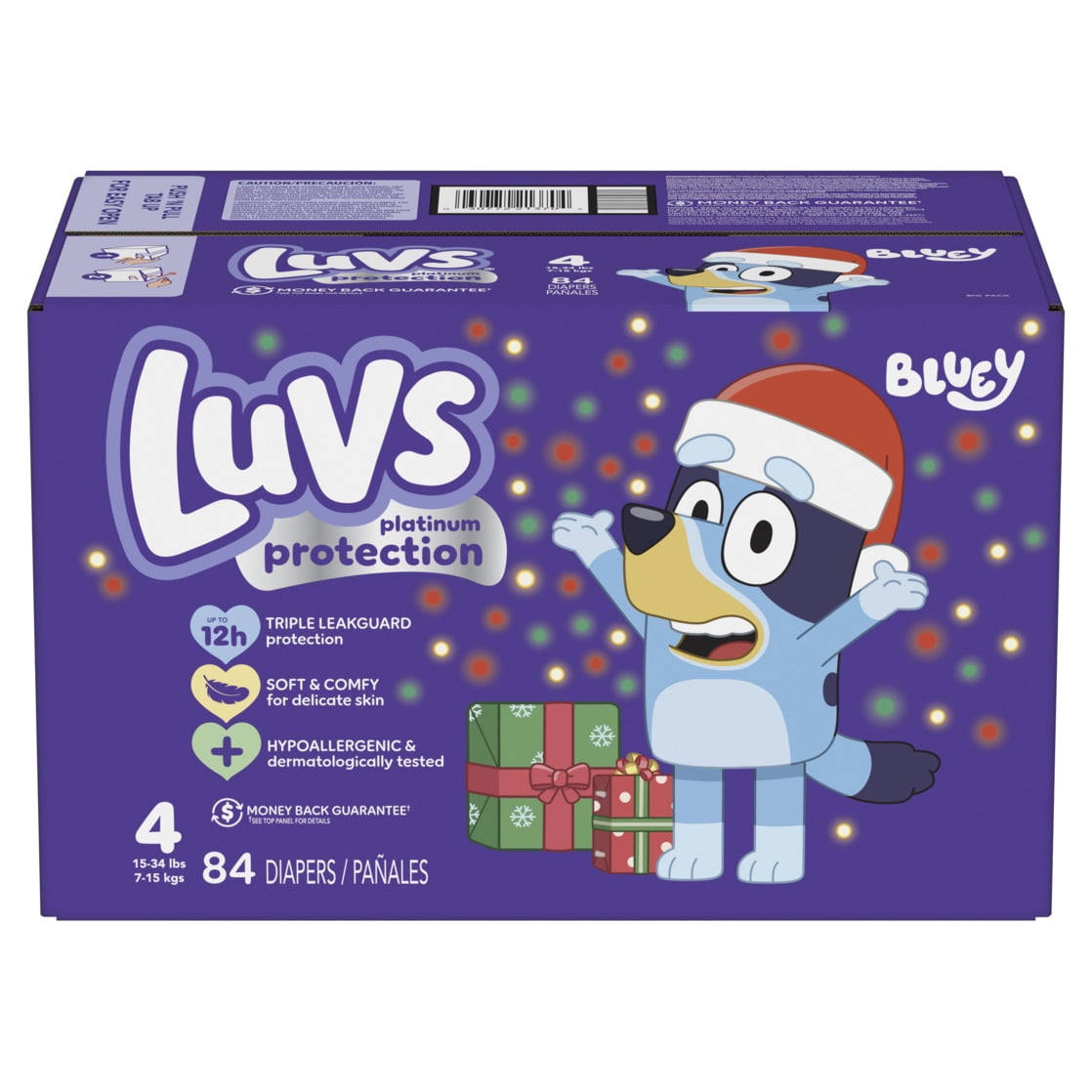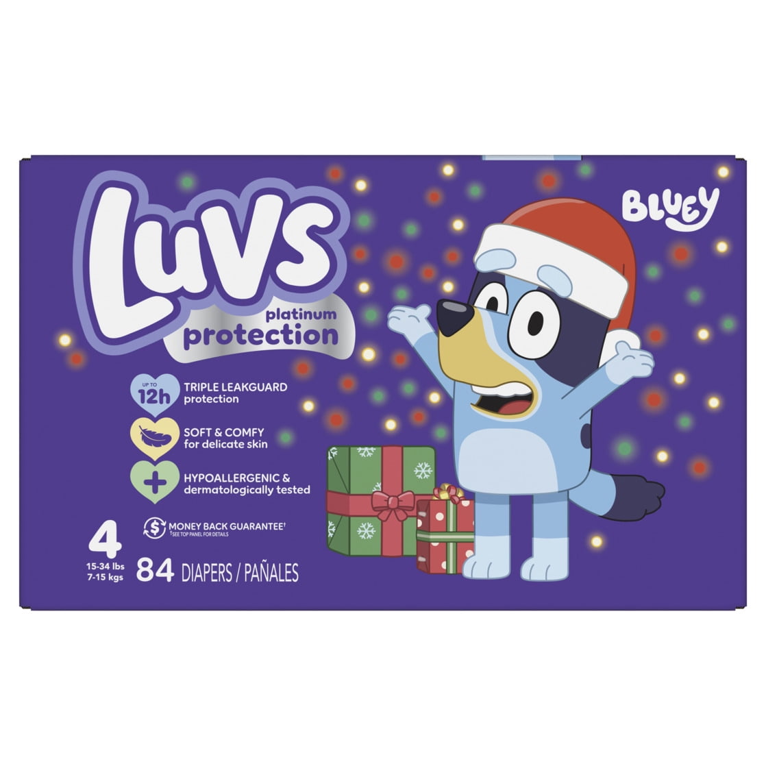 Introducing Luvs Platinum Protection diapers featuring Bluey! Luvs disposable diapers have up to 12-hours of Triple Leakguard Protection, but our leak protection doesn't stop there, the secure cuffs and stretchy sides help keep leaks locked in where they happen the most. Feel the softness and bring a new level of comfort for baby's delicate skin. Parenting can be stressful. Rest assured with worry-free Luvs Diapers and give your baby the gentle comfort he/she needs with the name brand protection that parents trust. With Luvs Platinum Protection diapers you know when they go, thanks to a wetness indicator that turns blue on contact with wetness. Plus, meet our best friend, Bluey. These adorably fun patterns give our diapers an added layer of cuteness to match your baby. Here are the highlights: Four levels of protection: Triple Leakguards, wetness indicator, secure and stretchy sides, comfy leak barrier cuffs Max softness: Soft and comfy for your baby's delicate skin It's not a mystery that babies are pretty delicate, so these diapers are dermatologically tested, hypoallergenic, and free of parabens and latex.* Any fuss? Trust us with our money back guarantee. We think you'll be wondering how you ever got by without these baby diapers, but if you're not loving Luvs for any reason, we'll send you a refund**. Luvs Platinum Protection Baby Diapers are available in sizes N-8. Size newborn (<10 lb), size 1 (8-14lb), size 2 (12-18 lb), size 3 (16-28 lb), size 4 (22-37 lb), size 5 (27+ lb), size 6 (35+ lb), and size 7 (41+ lb), size 8 (46+ lb). *Natural rubber. **If you're not completely satisfied, please send the original receipt and UPC to us within 45 days of purchase for a full product refund via prepaid card. Limited to one redemption per household or name. For additional details, please call 1-888-665-3257.
