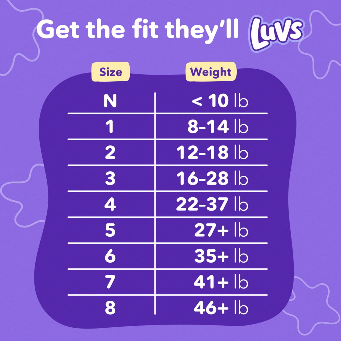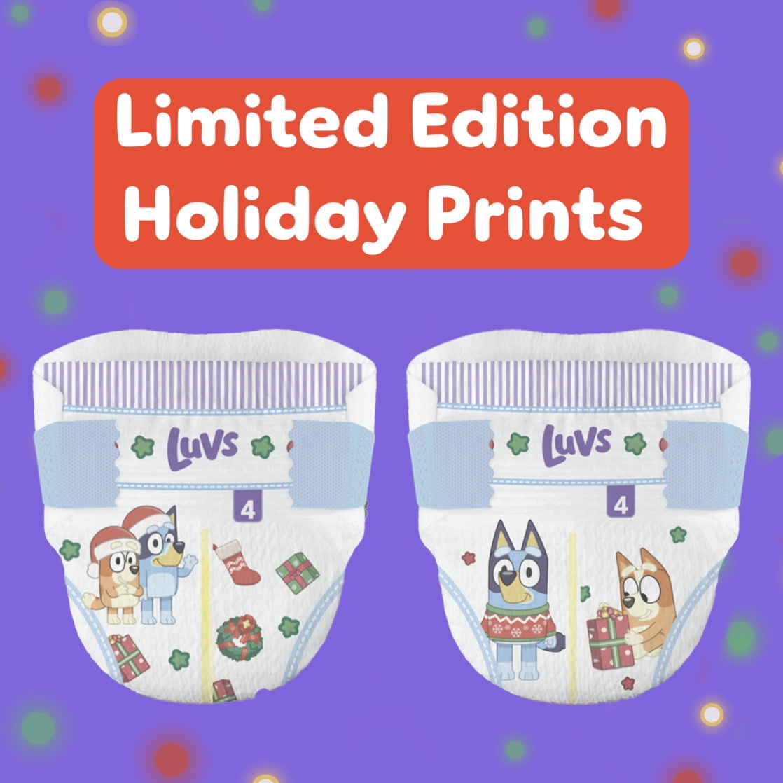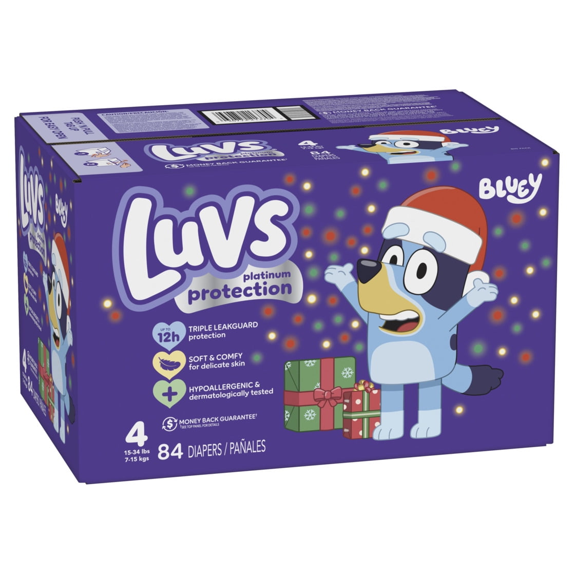 Introducing Luvs Platinum Protection diapers featuring Bluey! Luvs disposable diapers have up to 12-hours of Triple Leakguard Protection, but our leak protection doesn't stop there, the secure cuffs and stretchy sides help keep leaks locked in where they happen the most. Feel the softness and bring a new level of comfort for baby's delicate skin. Parenting can be stressful. Rest assured with worry-free Luvs Diapers and give your baby the gentle comfort he/she needs with the name brand protection that parents trust. With Luvs Platinum Protection diapers you know when they go, thanks to a wetness indicator that turns blue on contact with wetness. Plus, meet our best friend, Bluey. These adorably fun patterns give our diapers an added layer of cuteness to match your baby. Here are the highlights: Four levels of protection: Triple Leakguards, wetness indicator, secure and stretchy sides, comfy leak barrier cuffs Max softness: Soft and comfy for your baby's delicate skin It's not a mystery that babies are pretty delicate, so these diapers are dermatologically tested, hypoallergenic, and free of parabens and latex.* Any fuss? Trust us with our money back guarantee. We think you'll be wondering how you ever got by without these baby diapers, but if you're not loving Luvs for any reason, we'll send you a refund**. Luvs Platinum Protection Baby Diapers are available in sizes N-8. Size newborn (<10 lb), size 1 (8-14lb), size 2 (12-18 lb), size 3 (16-28 lb), size 4 (22-37 lb), size 5 (27+ lb), size 6 (35+ lb), and size 7 (41+ lb), size 8 (46+ lb). *Natural rubber. **If you're not completely satisfied, please send the original receipt and UPC to us within 45 days of purchase for a full product refund via prepaid card. Limited to one redemption per household or name. For additional details, please call 1-888-665-3257.