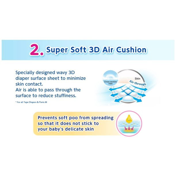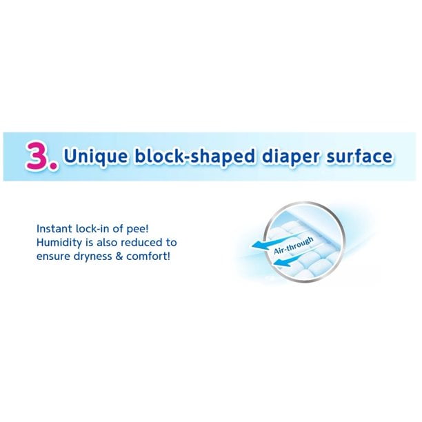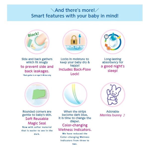 Breathability that removes moisture and stuffiness is so important! Breathable material that is gentle on the skin: Light airy wavy mesh The mesh reduces the skin contact area by half, expelling moisture and stuffiness through the gaps between the diaper and skin. Air passes through the absorbent layer. Pee is absorbed while moisture passes through. Long-lasting dryness means that you can have a peace of mind even if you are out and about or missed a night change. The recessed areas of the soft sheet effectively trap the soft poo and prevent it from dispersing. Fits perfectly around baby's legs. Stays in place even when baby kicks! You can have a peace of mind even on mornings when your baby has peed a lot overnight. Ultra soft and fluffy surface that is gentle to baby's delicate skin. The wavy surface reduces the skin contact area so that it does not stick to baby's skin. A flexible fit that changes shape to fit baby's bottom. Smooth touch. Soft fit. Soft and gentle like an underwear! Cute pastel colors and a stylish textile design that brings a smile every day. The corners are rounded and made of a soft material that is gentle and does not scratch the baby's skin. And the reusable seal is so convenient! Your baby's smile tells you that they're happy and comfortable. That's why Merries places so much importance on skin gentleness. If your baby's smile makes you smile, your baby will smile even more!