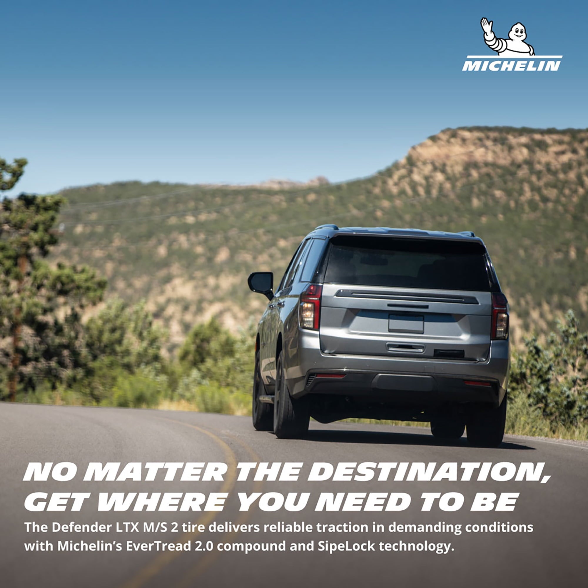 Michelin Defender LTX M/S 2 Tire The Michelin Defender LTX M/S 2 is completely redesigned to meet the needs of today's vehicles. With modern pick-up trucks and full size SUVs getting larger and more powerful, Defender® LTX® M/S 2 offers the increased tread life that today's drivers expect. The Michelin Defender LTX M/S 2 Tire offers best in class mileage delivering two extra years of treadlife compared to three leading competitive tires. When tested for treadwear, the Michelin Defender LTX M/S 2 tire lasted at least 25% longer than three leading competitive tires. When tested for treadwear, the Michelin Defender LTX M/S 2 tire lasted more than 25,000 miles longer than three leading competitive tires.
