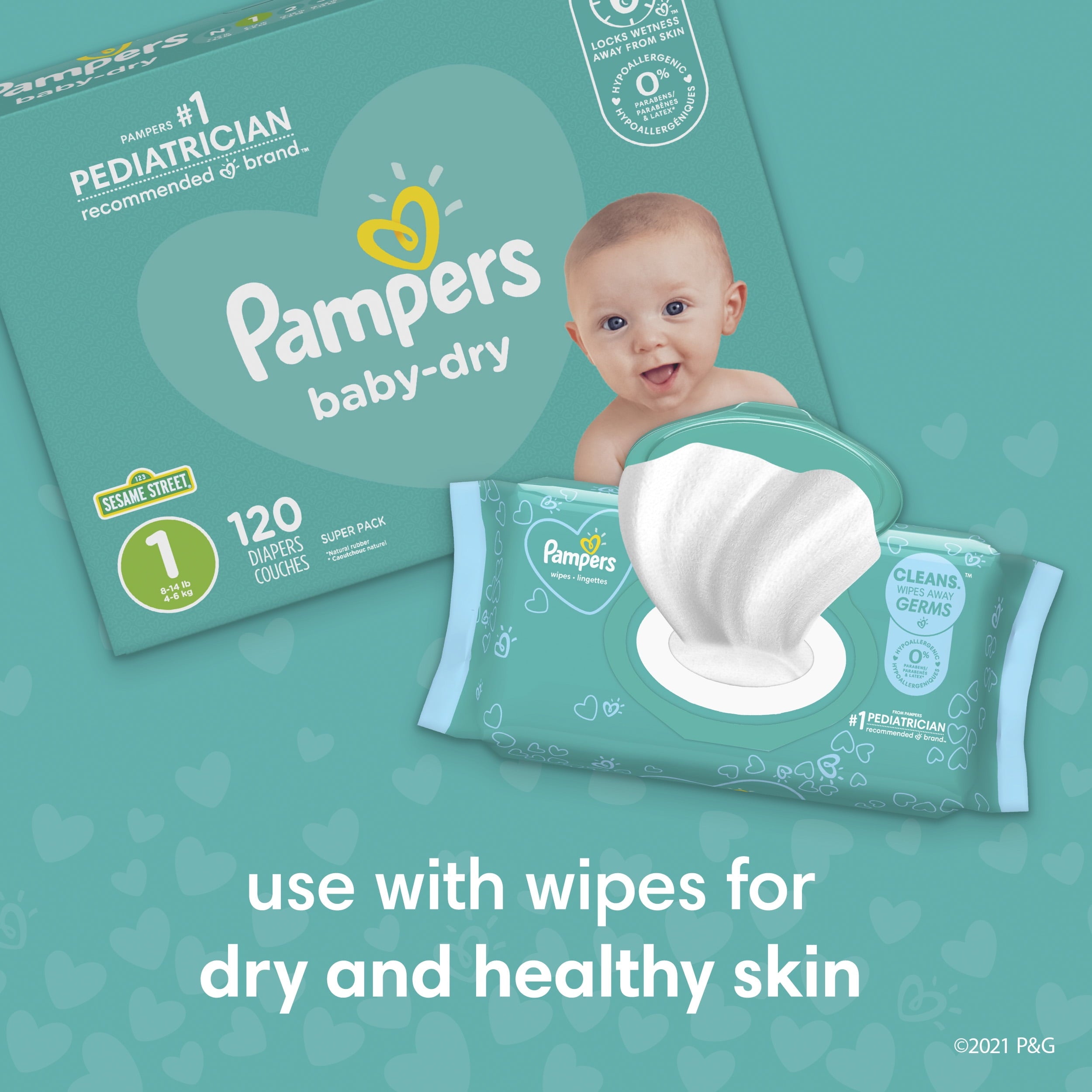 Designed to help keep skin dry and healthy, Pampers Baby-Dry diapers feature LockAway Channels to absorb wetness and lock it away from skin for up to 12 hours of dryness. Plus, new and improved Dual Leak-Guard Barriers help protect where leaks happen most for all-night sleep protection. Pampers Wetness Indicator changes color when baby is wet, so you know when it's time for a change. Gentle on baby's skin, Pampers Baby-Dry diapers are hypoallergenic and free of parabens and latex (natural rubber) and are Skin Health Alliance, dermatologist approved. For trusted protection trust Pampers, the #1 pediatrician recommended brand.