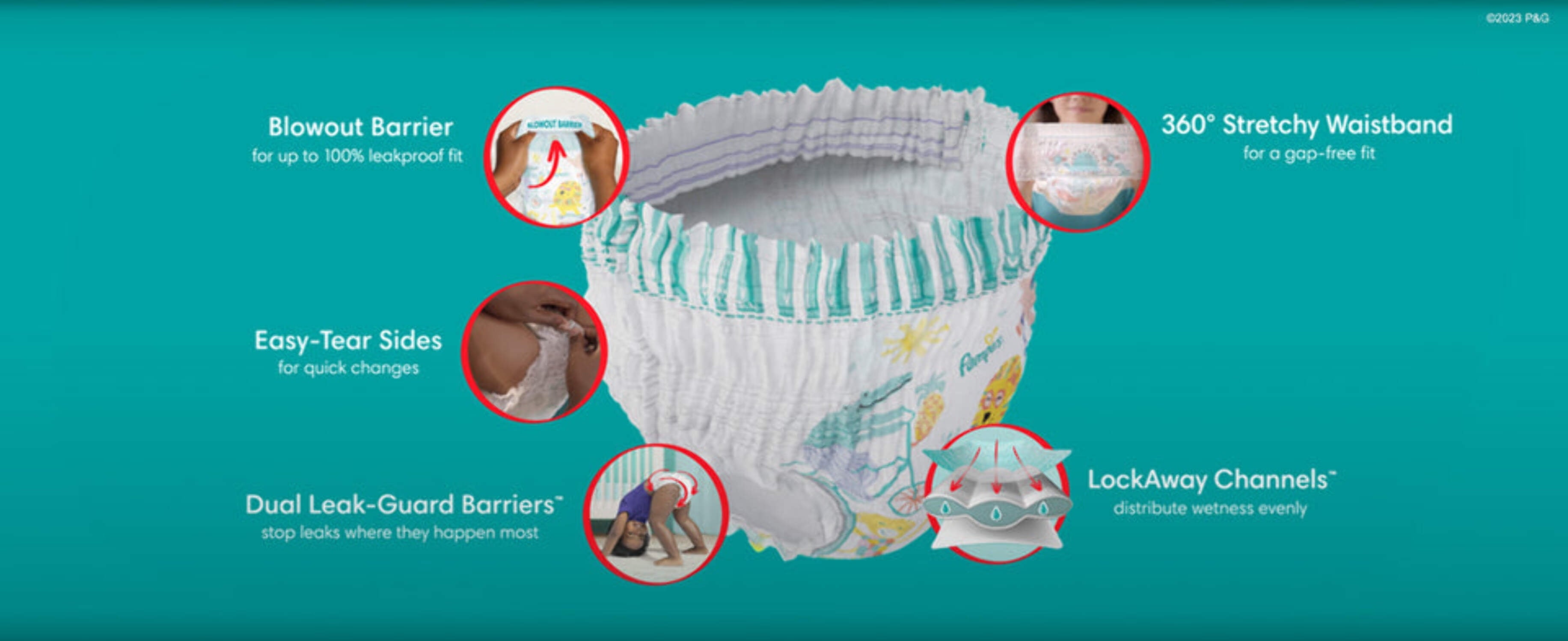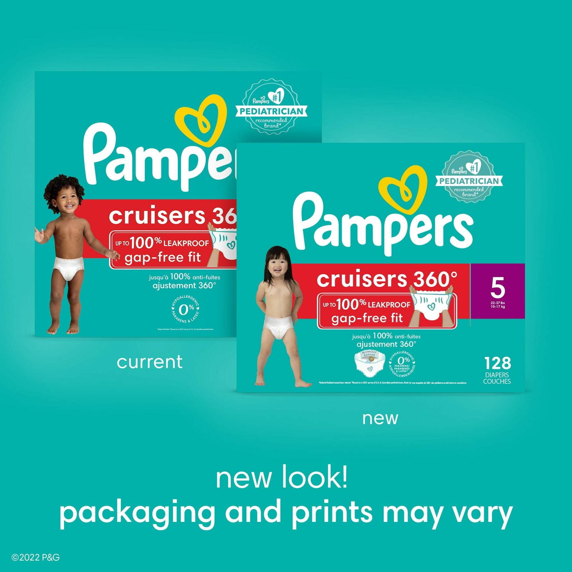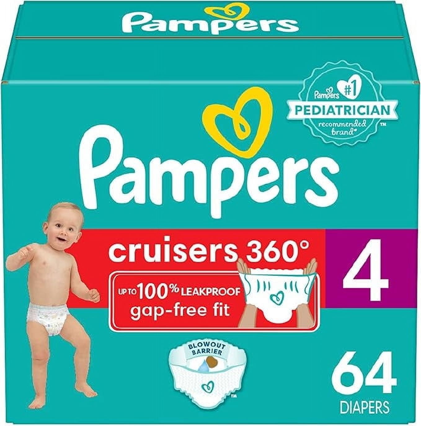 Pampers Cruisers 360 diapers are our best fit and protection for your active baby. Unlike ordinary disposable diapers that gap in the back, Pampers Cruisers 360 diapers stretch comfortably around your baby's waist and adapt to their every move for a flexible, gap-free fit that is up to 100% leakproof. Plus, they feature our Dual Leak-Guard Barriers that gently seal around your baby's legs, where leaks happen most.And forget fiddling with ordinary diaper tapes! Pampers Cruisers 360 has a 360-degree stretchy waistband designed to quickly and easily pull up onto your wiggly baby. And when a diaper change is complete, we've made disposal simple. All you need to do is RIP the Easy-Tear Sides and ROLL the diaper, then secure it with the disposal tape that comes attached to the back. Simple as that.Also, to keep your baby's delicate skin healthy, Pampers Cruisers 360 delivers breathable dryness, pulling out wetness and locking it away from skin using our exclusive LockAway Channels. Plus, Cruisers 360 is hypoallergenic-completely free of elemental chlorine bleaching, parabens and latex.* For protection that will keep your little one happy and comfy on-the-go, trust Pampers, the #1 pediatrician recommended brand.*Natural rubber