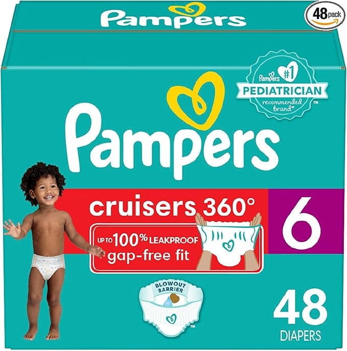 Pampers Cruisers 360 diapers are our best fit and protection for your active baby. Unlike ordinary disposable diapers that gap in the back, Pampers Cruisers 360 diapers stretch comfortably around your baby's waist and adapt to their every move for a flexible, gap-free fit that is up to 100% leakproof. Plus, they feature our Dual Leak-Guard Barriers that gently seal around your baby's legs, where leaks happen most.And forget fiddling with ordinary diaper tapes! Pampers Cruisers 360 has a 360-degree stretchy waistband designed to quickly and easily pull up onto your wiggly baby. And when a diaper change is complete, we've made disposal simple. All you need to do is RIP the Easy-Tear Sides and ROLL the diaper, then secure it with the disposal tape that comes attached to the back. Simple as that.Also, to keep your baby's delicate skin healthy, Pampers Cruisers 360 delivers breathable dryness, pulling out wetness and locking it away from skin using our exclusive LockAway Channels. Plus, Cruisers 360 is hypoallergenic-completely free of elemental chlorine bleaching, parabens and latex.* For protection that will keep your little one happy and comfy on-the-go, trust Pampers, the #1 pediatrician recommended brand.*Natural rubber