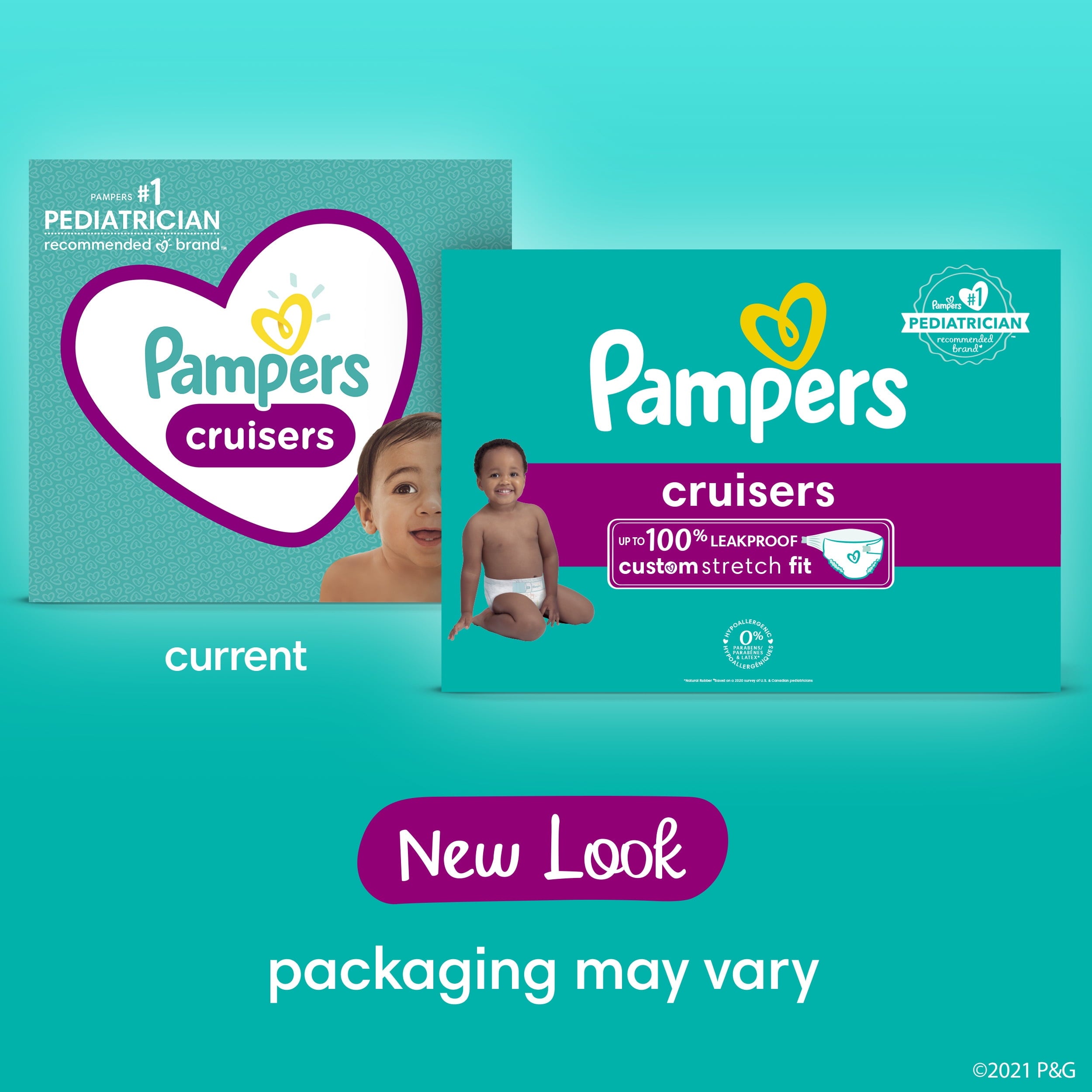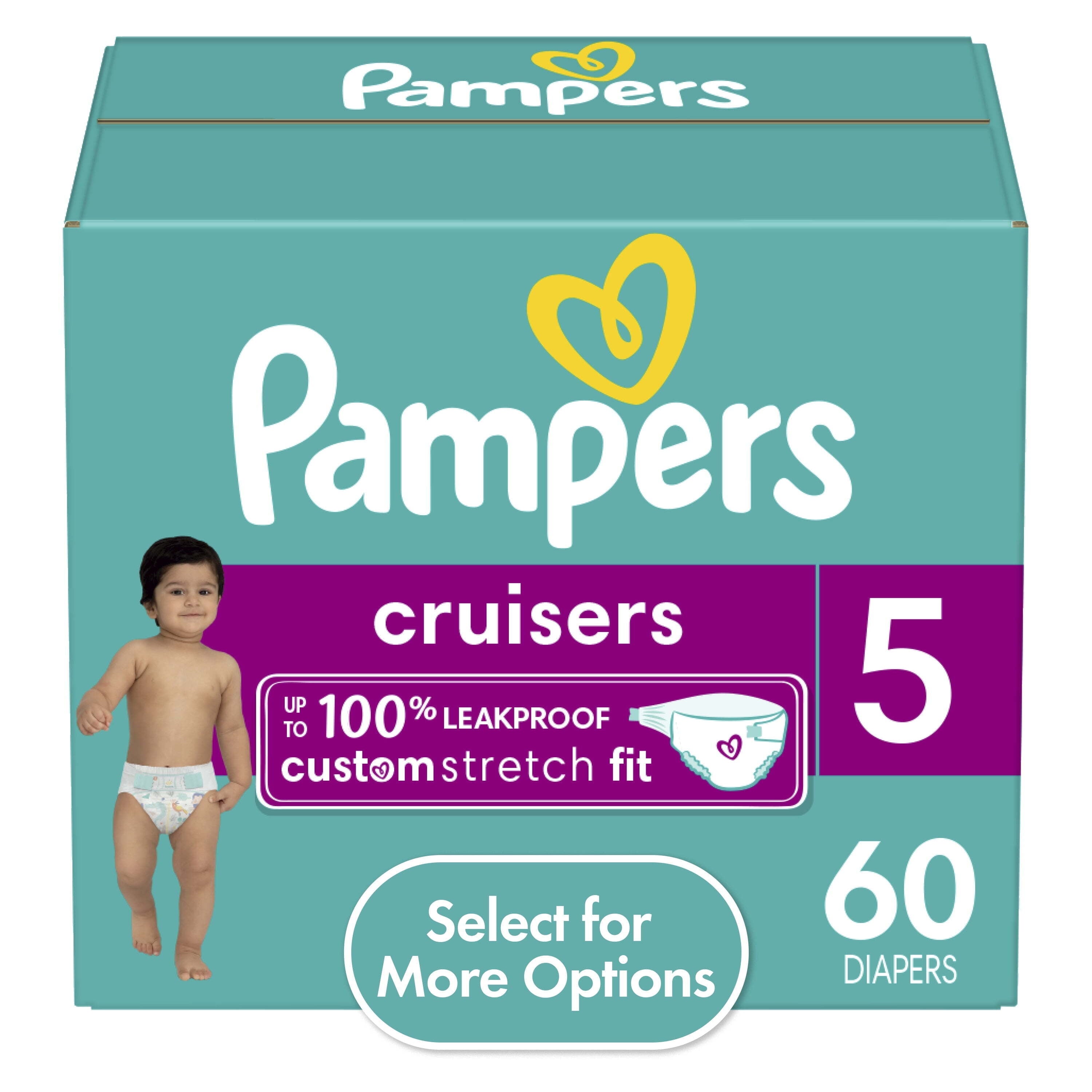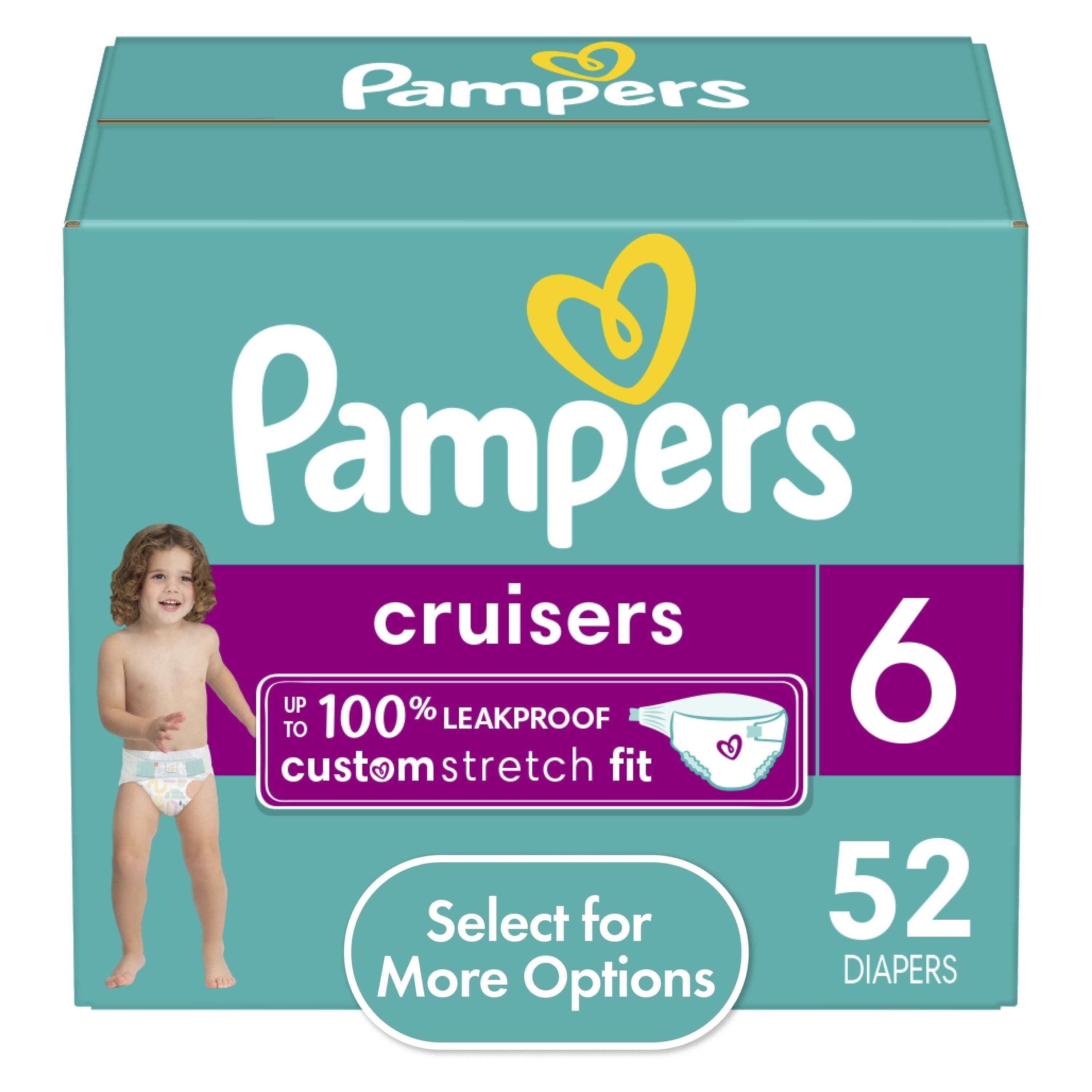Say hello to Custom Fit and reliable protection for the most active babies! Pampers Cruisers adjust to your baby's unique shape and size with our Custom Stretch Fit System, featuring 2x stretchier* sides for a comfy, long-lasting fit perfect for babies on-the-go. Plus, our easy-to-use fit guide on the front of the diaper helps you get the perfect customized fit. So, no matter how much your baby moves, their diaper will stay put. Pampers Cruisers are also specially designed to deliver up to 100% leakproof protection thanks to our Dual Leak-Guard Barriers that gently seal around your little one's legs and bottom to stop leaks where they happen most. Plus, Cruisers feature our Lock Away Channels that absorb wetness and lock it away from skin. 124 Count, Daytime Diapers, Size 4