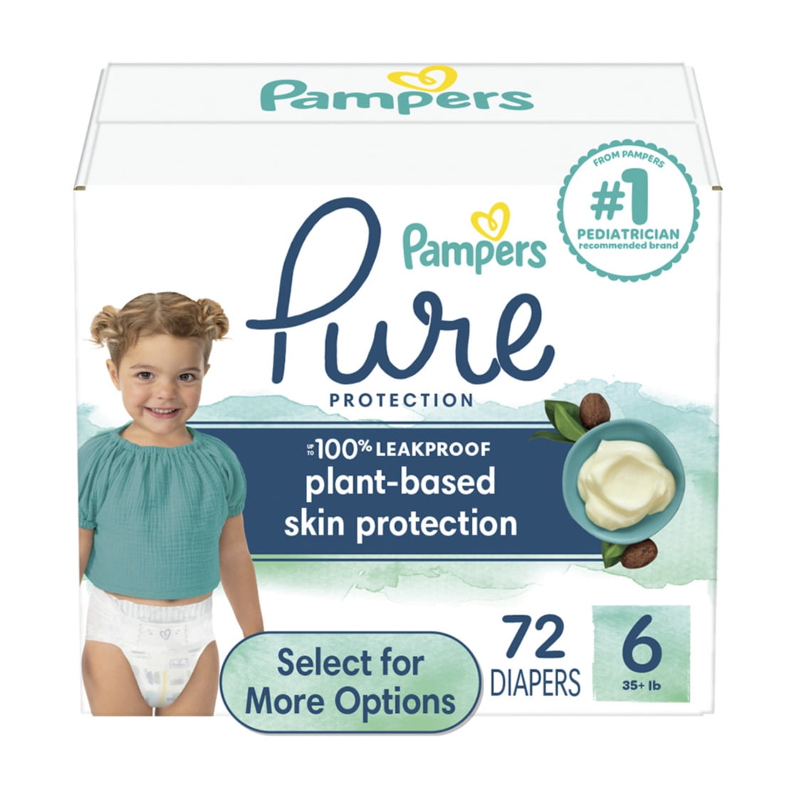 Your search for pure protection that works is over! Pampers Pure Protection diapers are designed to be gentle on the skin while providing the absorbency and leak protection you trust from Pampers. These diapers feature an absorbent liner enriched with shea butter to help nourish and protect your baby's delicate skin. The outer cover is enhanced with premium cotton*, making these diapers irresistibly soft and breathable. Pampers Pure Protection diapers are crafted to help keep skin dry and healthy. They now include a new blowout barrier that prevents up to 100% of leaks, including those challenging blowouts, so you can have peace of mind. We’ve thoughtfully chosen all our ingredients to care for your baby's precious skin, ensuring that Pampers Pure Protection diapers are as effective as they are gentle. Importantly, the ingredients we’ve chosen to leave out are just as vital. Pampers Pure Protection diapers are hypoallergenic and free of elemental chlorine, fragrance, parabens, natural rubber, and latex**. These diapers are made with sustainably sourced, premium cotton and produced using 100% certified renewable energy. In addition to their protective features, Pampers Pure Protection diapers come in designer boutique prints, making them just as precious as they are protective. For even better skin health, use Pampers Pure Protection diapers together with Pampers Aqua Pure Wipes for a complete care routine. Experience the comfort, safety, and style that Pampers Pure Protection diapers provide for your little one! *Soft outer cover contains 15% cotton. **0% PARABENS AND LATEX: Latex and natural rubber.