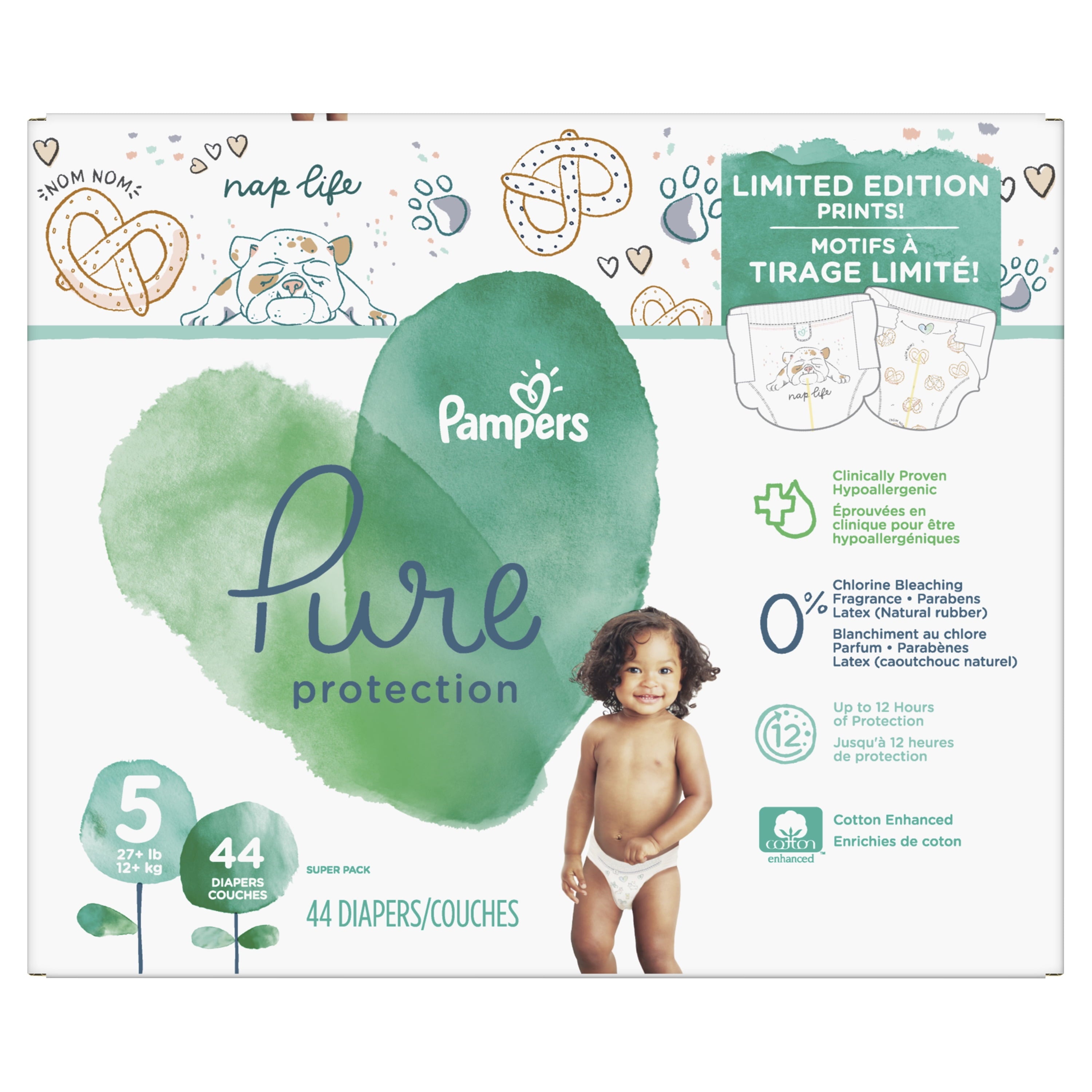 Your search for pure protection that works is over! Designed to help skin stay dry and healthy, Pampers Pure Protection diapers lock wetness away from skin for up to 12 hours for outstanding leakage protection with skin-loving care. Plus, our designer, boutique prints make Pampers Pure just as precious as they are protecting. We've thoughtfully chosen all of our ingredients to care for your baby's precious skin. Our exclusive, plant-based liner** is enriched with shea butter to help nourish and protect skin while our outercover is enhanced with premium cotton, making Pampers Pure Protection diapers irresistibly soft and breathable. But the ingredients we've chosen to leave out are just as important. That's why Pampers Pure Protection diapers are free of chlorine bleaching, fragrance, parabens, and latex* and are hypoallergenic. *Natural rubber **Plant-based and polypropylene blend The Seal of Cotton and cotton enhanced are trademarks of Cotton Incorporated. cotton enhanced soft outercover contains 15% cotton.