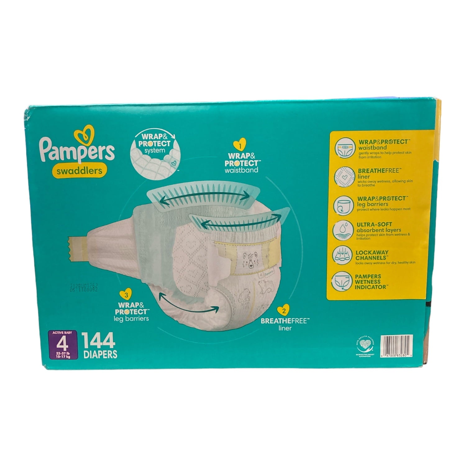 Pampers Swaddlers Diapers Size 4 (22-37 Pounds) 144 Count Made for your growing baby, Pampers Swaddlers is Pampers softest diaper EVER with outstanding absorbency! ultra-soft absorbent layers soothe and protect your baby s skin. Specially designed with your baby s skin in mind, Pampers Swaddlers exclusive BreatheFree Liner wicks wetness away from skin so baby s skin stays drier and healthier. Dual Leak-Guard Barriers along the leg cuff help protect where leaks happen most. And, Pampers Wetness Indicator shows when your baby s wet. Pampers Swaddlers are free of parabens and latex and are clinically proven for that s gentle on your baby s delicate skin. Plus, prints feature hand-drawn animals that illustrate all of the love and sweetness between baby and parent. For trusted , trust Pampers, the 1 Pediatrician Recommended Brand.