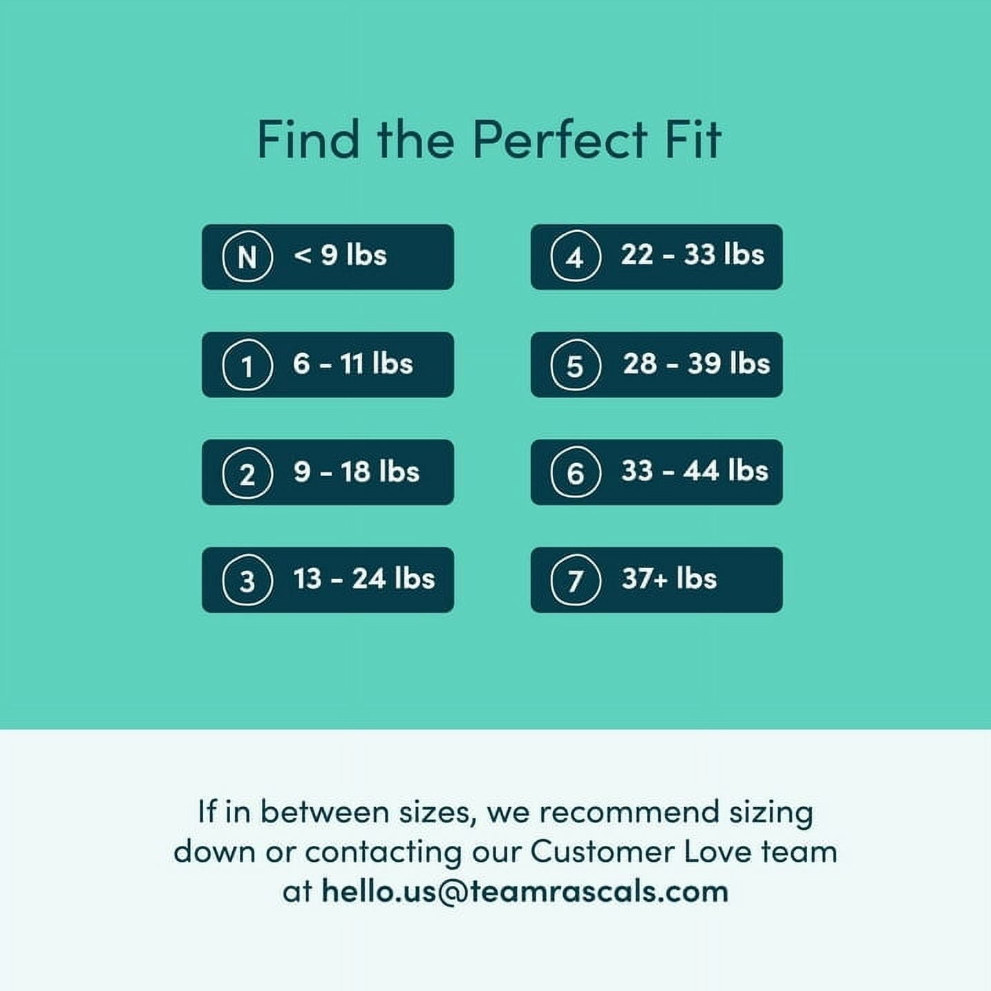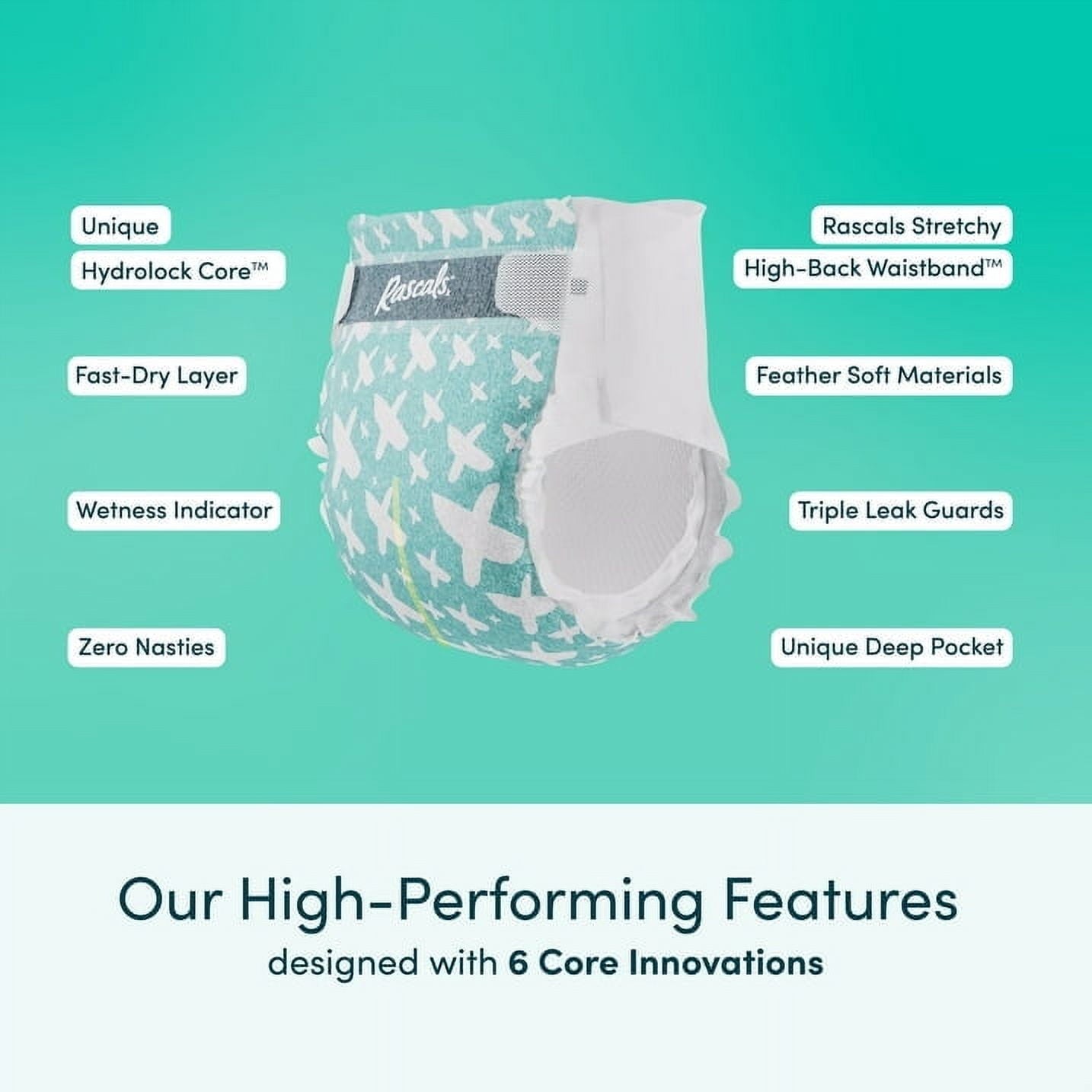 Rascals Premium Diapers are ready for every mess! Designed with 6 Core Innovations for high-performance, our unisex diapers are ultra-absorbent with up to 12 hours of leak protection, making them ideal for both daytime and overnight. Dermatologist-tested and hypoallergenic, Rascals baby diapers are dry and gentle, and safe for newborn, infant and toddler skin. Whether you’re preparing for a baby shower, birth, or pregnancy, Rascals Premium Diapers are a newborn essential and must-have for every parent. Rascals diapers are suitable for babies from 0-37+Ibs and available in size newborn, size 1, size 2, size 3, size 4, size 5, size 6, size 7. Perfect for nighttime, our size range ensures the perfect fit for every stage of your little one's growth. Our Unique Hydrolock Core™ absorbs liquid with 4 layers of protection to help keep leaks contained, and our Stretchy High-Back Waistband™ offers a snug comfortable fit. Designed with AirSpun™ Technology for a breathable and feather-soft feel on skin, our baby diapers are made with Zero Nasties for safe and gentle protection. Don’t just take our word for it, Rascals products are loved by millions of parents worldwide, with over 210,000+ 5-star reviews.* Try Rascals Premium Diapers! Ready for every mess. *Based on all reviews of Rascals diapers, training pants, and wipes across websites globally, including incentivized and organic reviews.