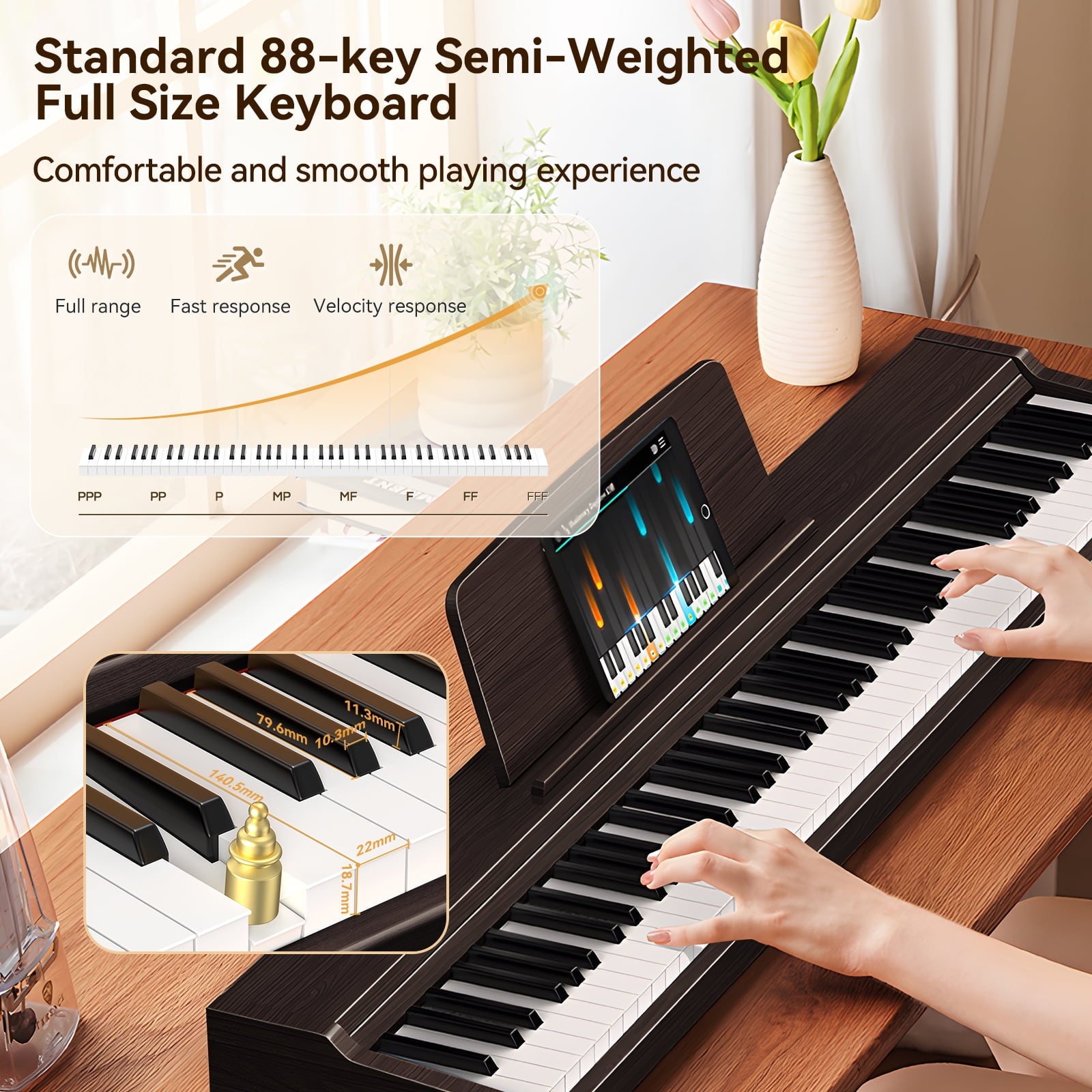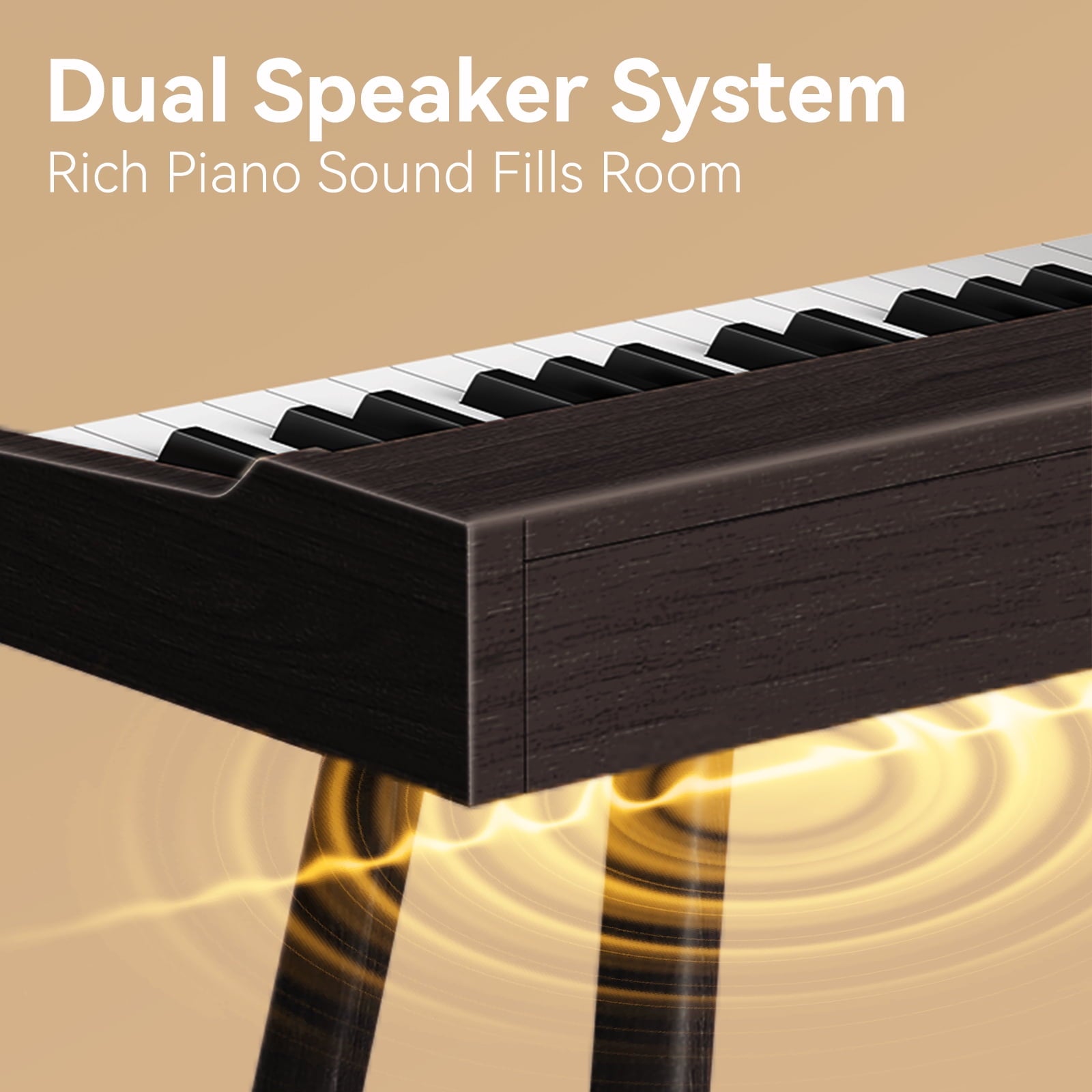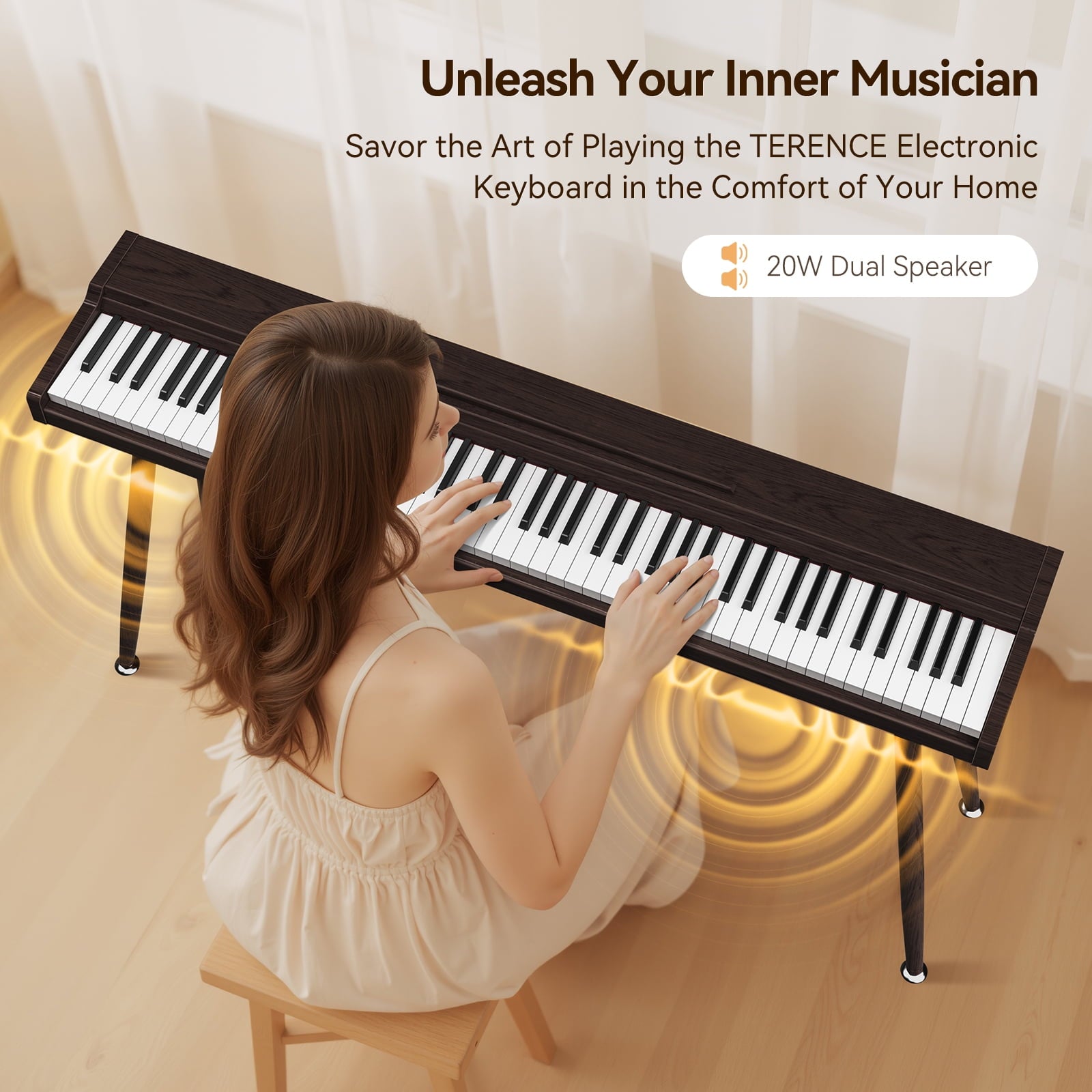 TERENCE 88-Key Digital Piano 88-Key Weighted Hammer Action Keyboard Simulates the feel of an acoustic piano, suitable for beginners, advanced players, and professionals. Semi-weighted keys with velocity sensitivity for dynamic tone variation based on playing intensity. High-Quality Sound System Equipped with DREAM sound chip for authentic piano tones. Built-in 20W stereo speakers (10W x 2) for rich, clear audio output. Dual-Player Mode & Silent Practice One-touch Dual Mode splits the keyboard into two 44-key zones for duets (teacher/student, parent/child) with independent volume control. 3.5mm headphone jack enables silent practice, ideal for late-night sessions. Bluetooth & MIDI Connectivity Dual-mode Bluetooth supports audio playback (via piano speakers) and connectivity with learning apps. USB-MIDI port for seamless integration with music software, recording, and low-latency performance. Eco-Friendly Wooden Design & Compact Size Sleek wooden cabinet that blends into any home, studio, or bedroom. Anti-yellowing keys + sustainable materials for long-lasting use. Dimensions: Without stand: 48.4 in (L) × 9.8 in (W) × 3.5 in (H) / (123 cm × 25 cm × 9 cm) With stand: 48.4 in (L) × 9.8 in (W) × 29.1 in (H) / (123 cm × 25 cm × 74 cm) Triple Pedal System & Professional Expansion Includes sustain, soft, and sostenuto pedals (like an acoustic piano) for expressive playing. Supports external devices: microphone (for singing), headphones, audio output, and MIDI peripherals. Complete Accessories Included Comes with wooden stand, triple pedals, headphone jack, audio input, and USB-MIDI connectivity. Key Advantage: A versatile digital piano offering professional performance, interactive learning, and quiet practice—ideal for all skill levels.