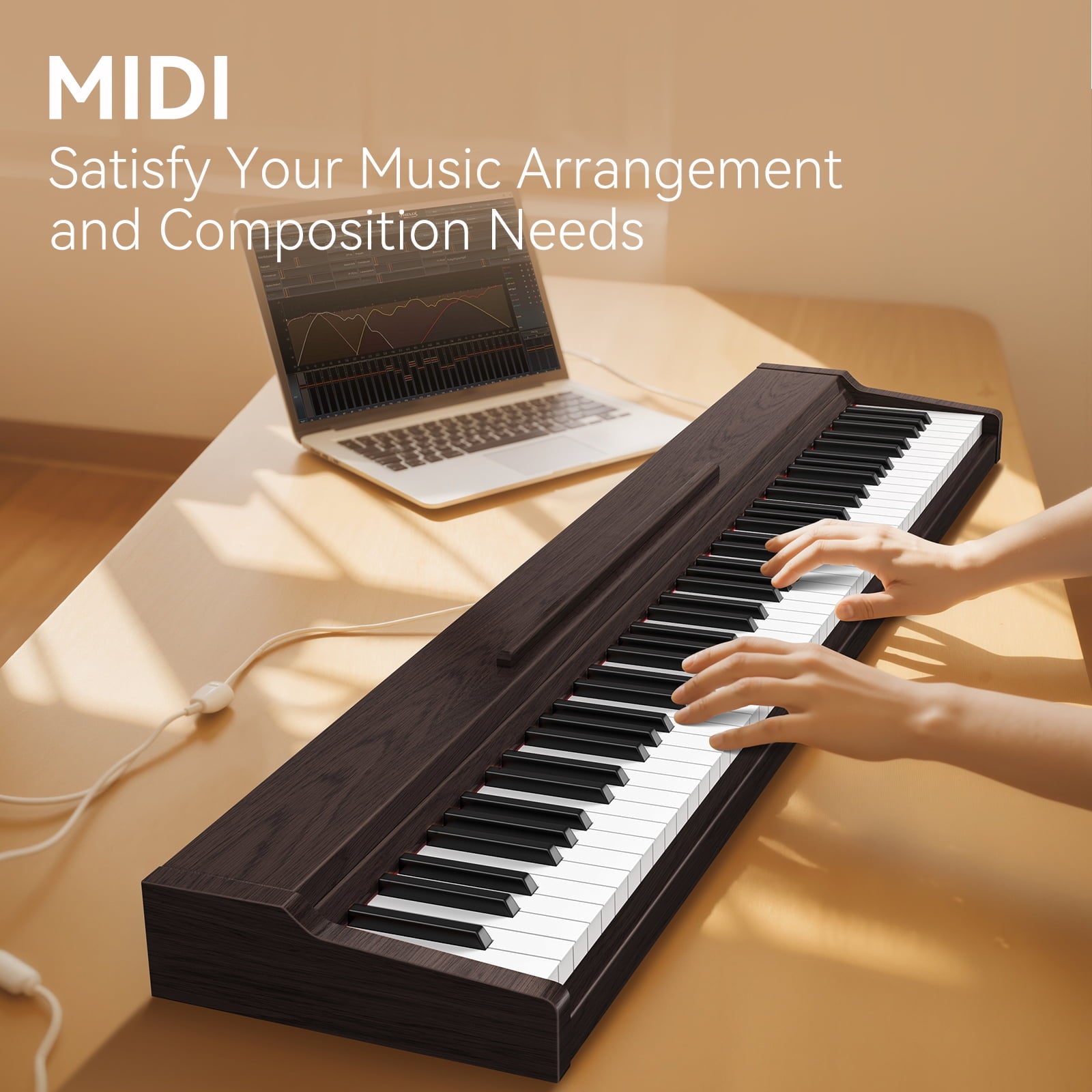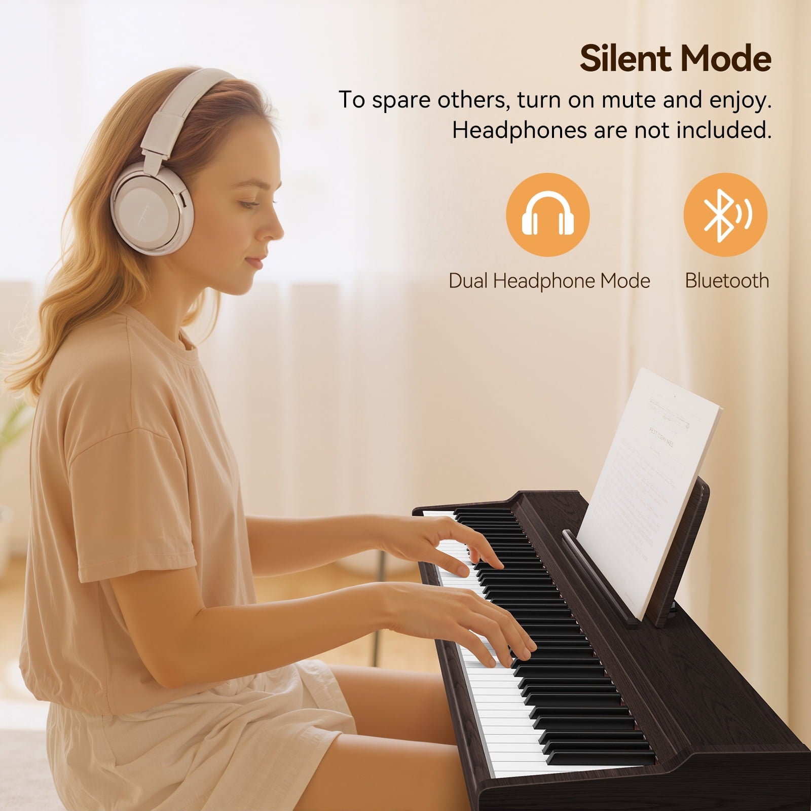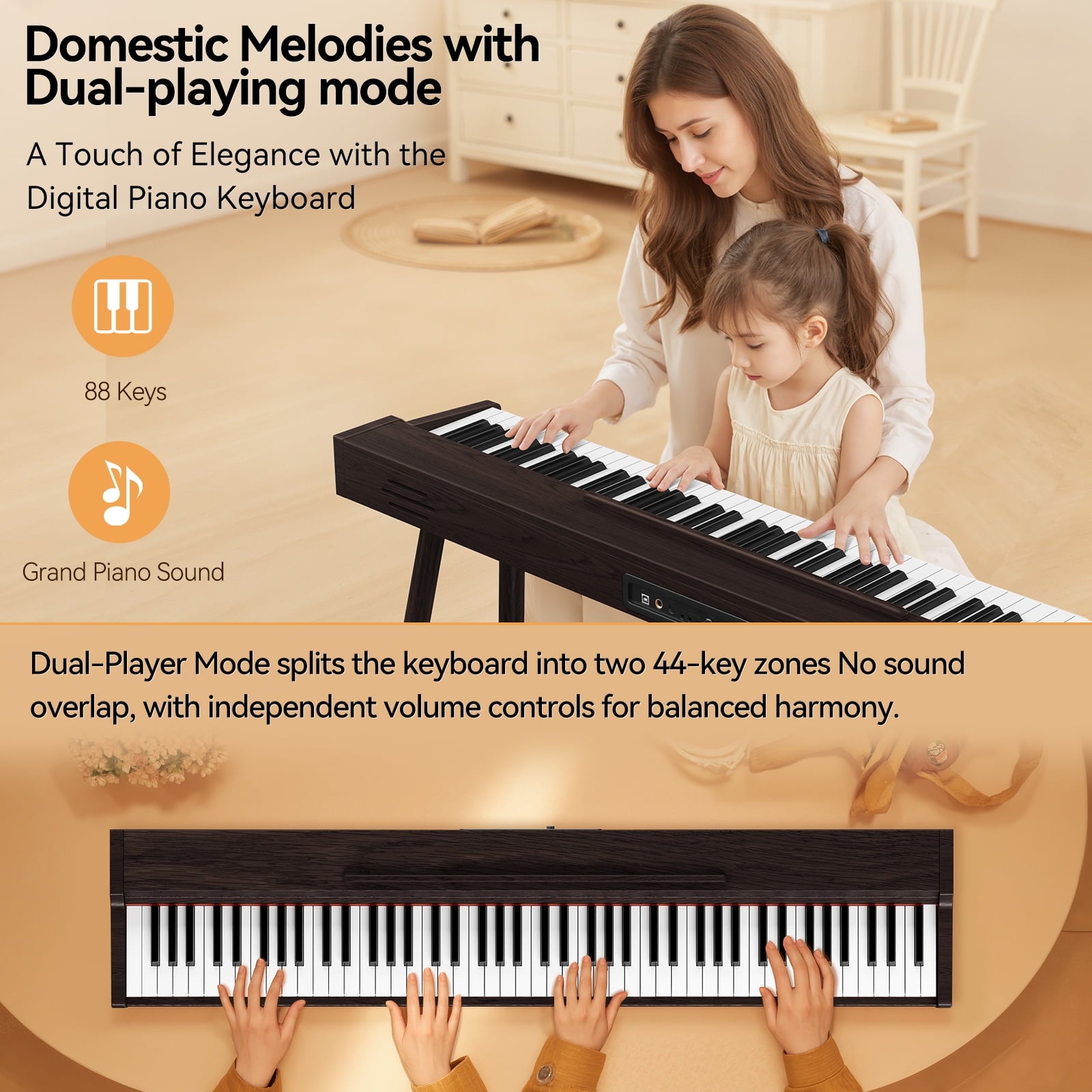 TERENCE 88-Key Digital Piano 88-Key Weighted Hammer Action Keyboard Simulates the feel of an acoustic piano, suitable for beginners, advanced players, and professionals. Semi-weighted keys with velocity sensitivity for dynamic tone variation based on playing intensity. High-Quality Sound System Equipped with DREAM sound chip for authentic piano tones. Built-in 20W stereo speakers (10W x 2) for rich, clear audio output. Dual-Player Mode & Silent Practice One-touch Dual Mode splits the keyboard into two 44-key zones for duets (teacher/student, parent/child) with independent volume control. 3.5mm headphone jack enables silent practice, ideal for late-night sessions. Bluetooth & MIDI Connectivity Dual-mode Bluetooth supports audio playback (via piano speakers) and connectivity with learning apps. USB-MIDI port for seamless integration with music software, recording, and low-latency performance. Eco-Friendly Wooden Design & Compact Size Sleek wooden cabinet that blends into any home, studio, or bedroom. Anti-yellowing keys + sustainable materials for long-lasting use. Dimensions: Without stand: 48.4 in (L) × 9.8 in (W) × 3.5 in (H) / (123 cm × 25 cm × 9 cm) With stand: 48.4 in (L) × 9.8 in (W) × 29.1 in (H) / (123 cm × 25 cm × 74 cm) Triple Pedal System & Professional Expansion Includes sustain, soft, and sostenuto pedals (like an acoustic piano) for expressive playing. Supports external devices: microphone (for singing), headphones, audio output, and MIDI peripherals. Complete Accessories Included Comes with wooden stand, triple pedals, headphone jack, audio input, and USB-MIDI connectivity. Key Advantage: A versatile digital piano offering professional performance, interactive learning, and quiet practice—ideal for all skill levels.