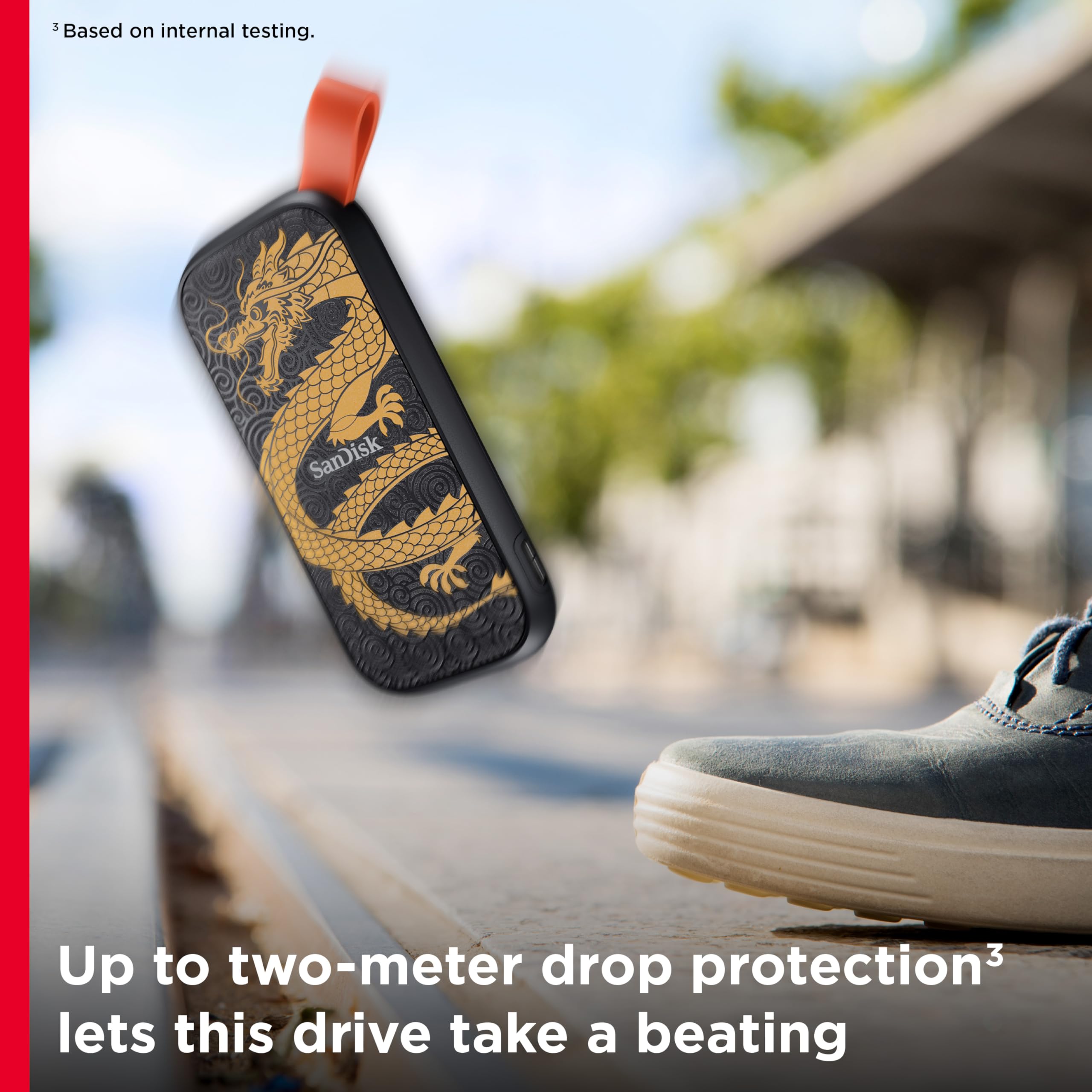 With the SanDisk Portable SSD featuring up to 800MB/s read speeds you can store your content and memories on a fast drive that fits seamlessly into your mobile lifestyle. Up to two-meter drop protection plus a tough rubber hook for securing the drive give you the peace of mind to take it with you wherever,whenever. From a brand trusted by professional photographers, the SanDisk Portable SSD provides fast solid-state performance in a rugged but affordable storage solution. (Write speeds lower. Based on internal testing; performance may be lower depending on host device, interface, usage conditions and other factors.1MB=1,000,000 bytes.)