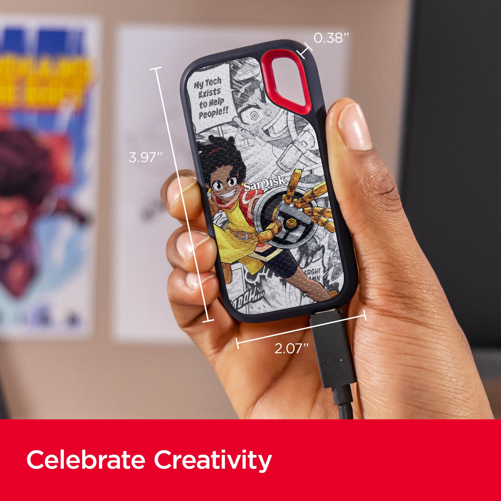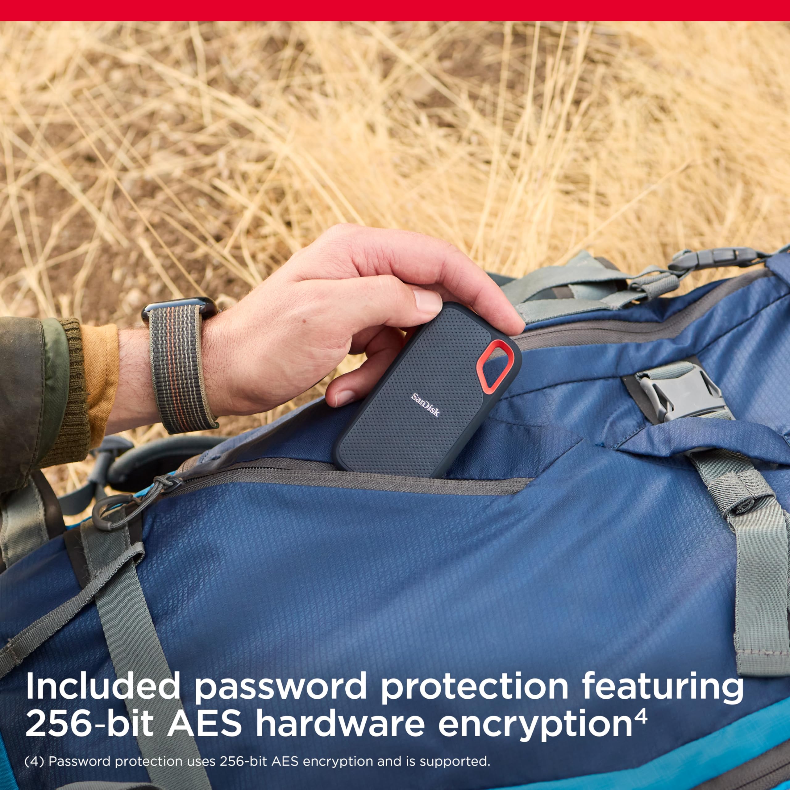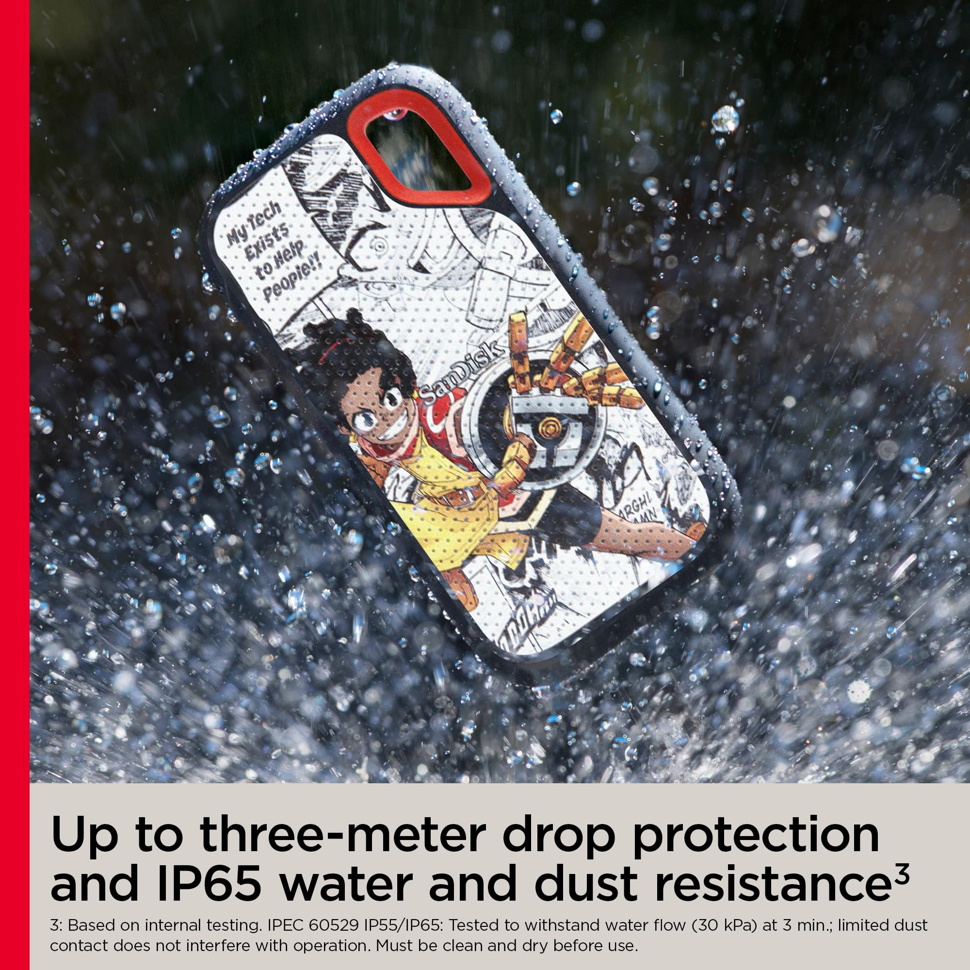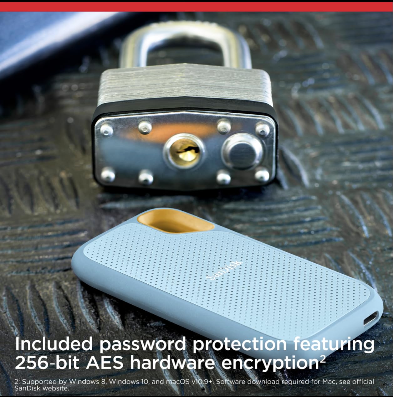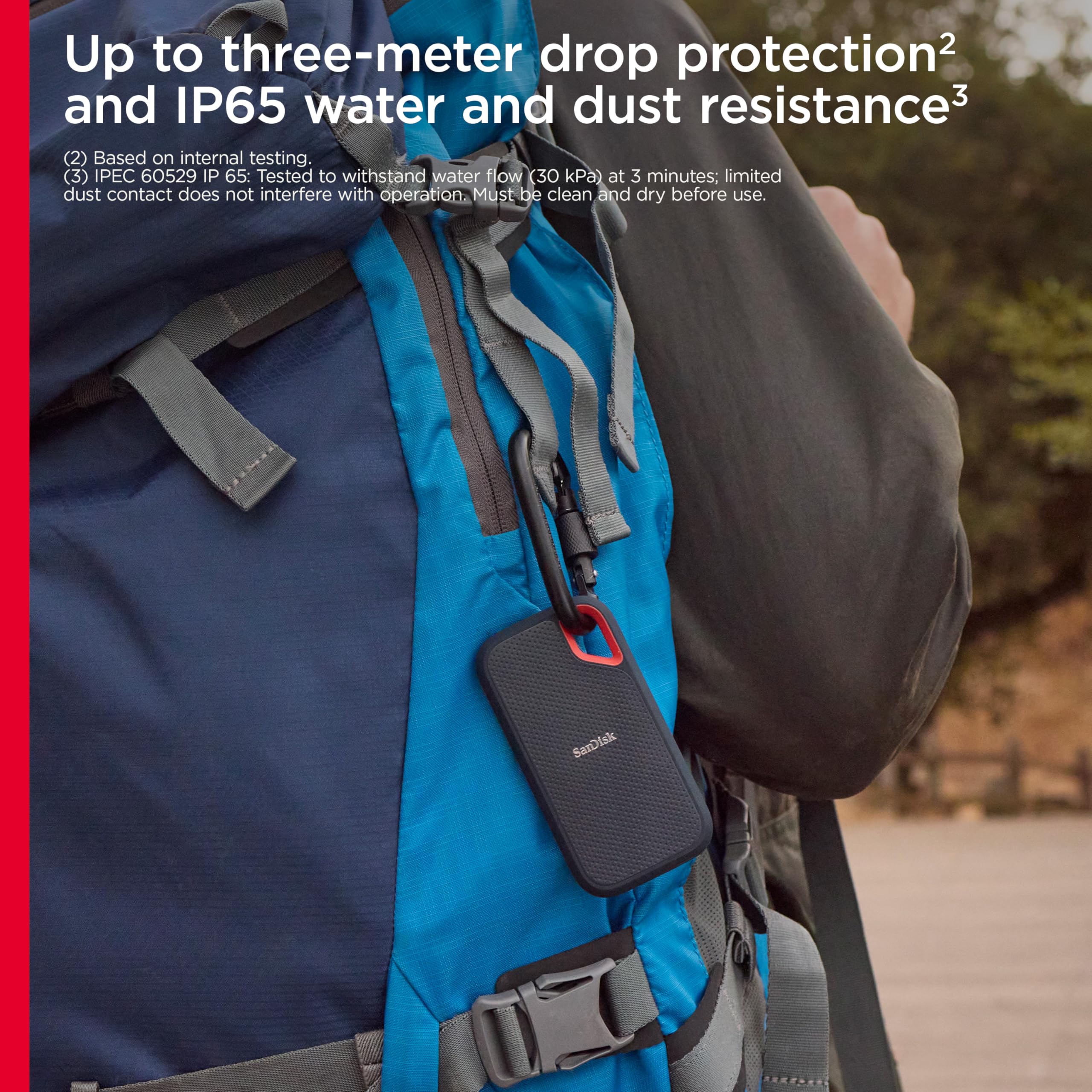 Your life’s an adventure. To capture and keep its best moments, you need fast, high-capacity storage that accelerates every move. 1050MB/s read and 1000MB/s write speeds let you store your content and creations on a fast drive that fits seamlessly into your active lifestyle. Up to two-meter drop protection (3), with IP55 water and dust resistance (3), a Carabiner loop for securing the drive. From the brand trusted by professional photographers, the SanDisk Extreme Portable SSD provides fast solid state performance in a tough, reliable storage solution. 1GB = 1,000,000,000 bytes, 1TB = 1,000,000,000,000 bytes. Actual user capacity less. Up to 1050MB/s read speed, up to 1000MB/s write speed. Engineered with proprietary technology to reach speeds beyond UHS-I 104MB/s, requires compatible devices capable of reaching such speed. Based on internal testing; Performance may be lower depending on host device, interface, usage conditions and other factors. 1MB=1,000,000 bytes. (1) See official SanDisk website. (2) Password protection uses 256-bit AES encryption and is supported by Windows 8, Windows 10 and macOS v10.9+ (Software download required for Mac, see official SanDisk website.) (3) Based on internal testing. IPEC 60529 IP 55: Tested to withstand water flow (30 kPa) at 3 min; Limited dust contact does not interfere with the operation. Must be clean and dry before use.