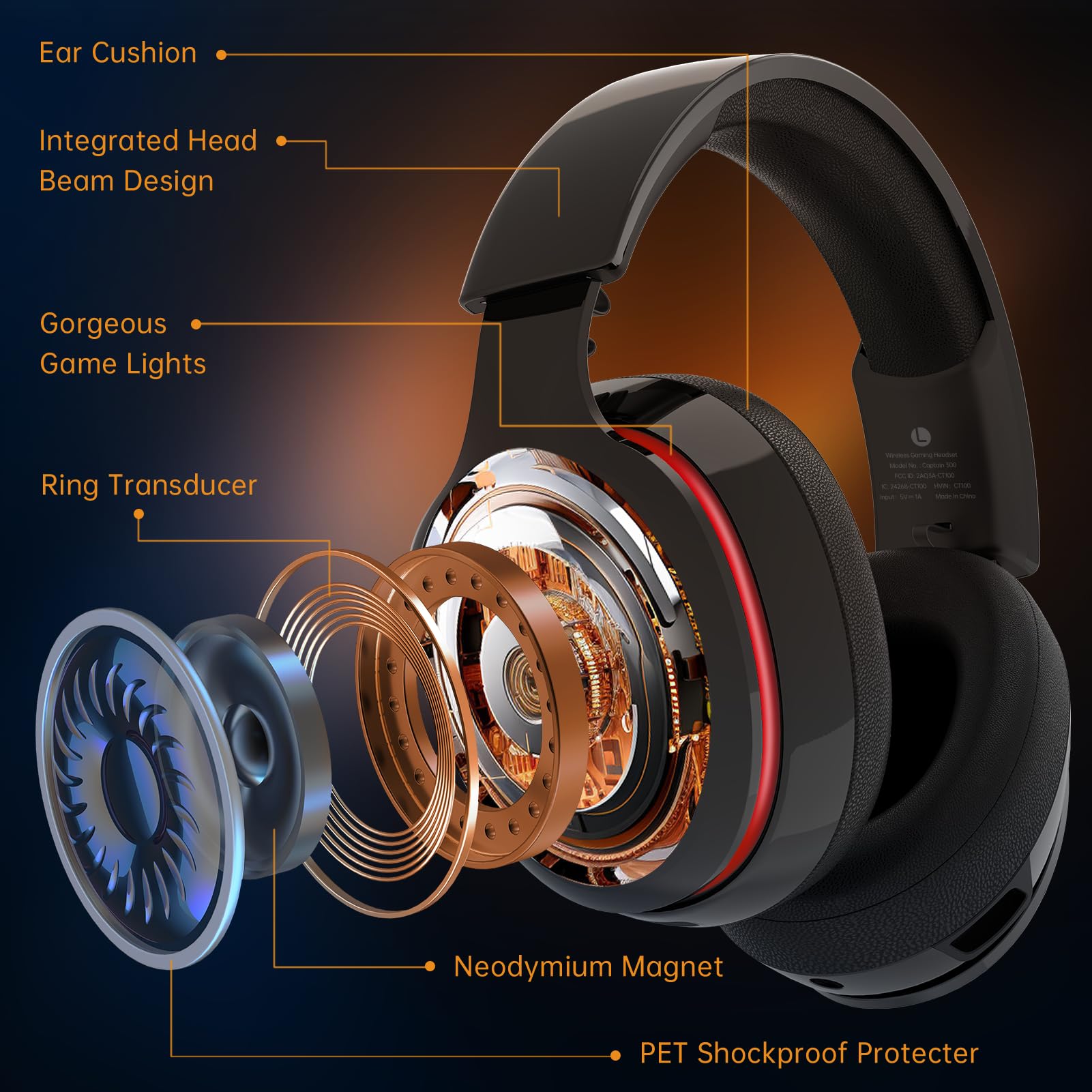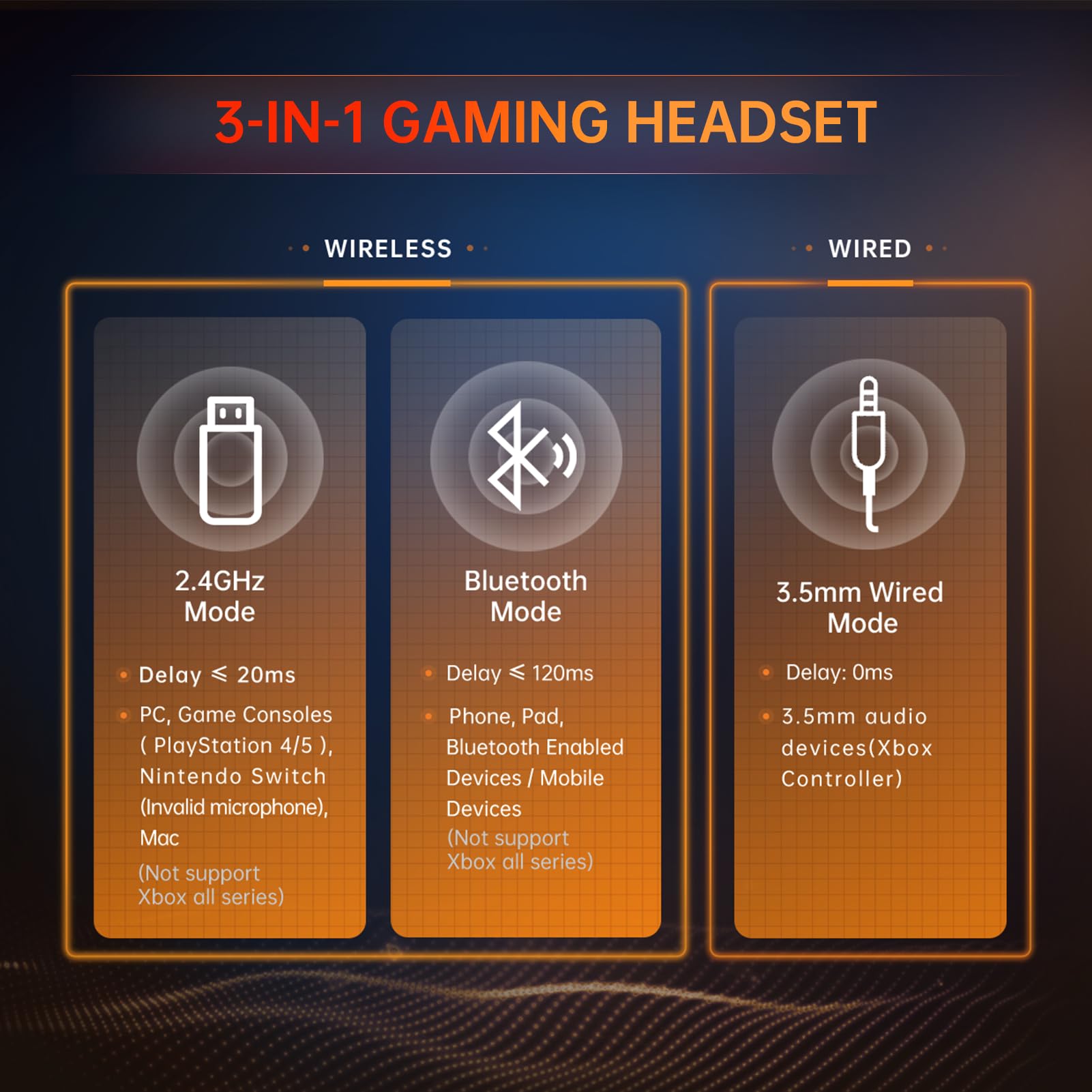 3-in-1 Connection Ways & Multi-platform Compatibility: Captain 300 wireless pc headset supports low latency, lossless 2.4GHz USB dongle and the latest Bluetooth 5.2 stable connection, while supporting 3.5mm wired connection mode. Unique 3 in 1 connection design (equipped with both USB dongle and 3.5mm jack cable) make this wireless headset widely compatible with PS5, PS4, PC, Mac, phone, pad, switch(Invalid Microphone); Xbox series ONLY compatible with 3.5mm wired mode.