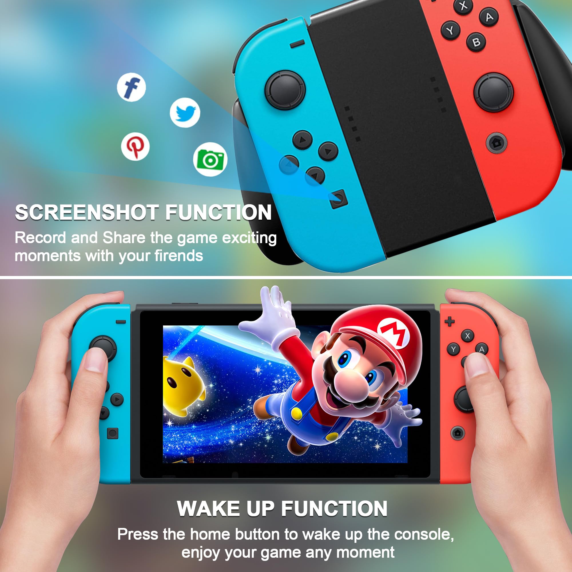 Quick Access Features for Better Gameplay:Switch lite wireless controller one-touch wake-up function instantly activates your Switch console without tedious operations.switch oled controller capture and save your favorite moments in Animal Crossing or intense battles in Super Smash Bros. with a single press, then easily share with friends on social media. Simple, efficient, and designed for gamers.