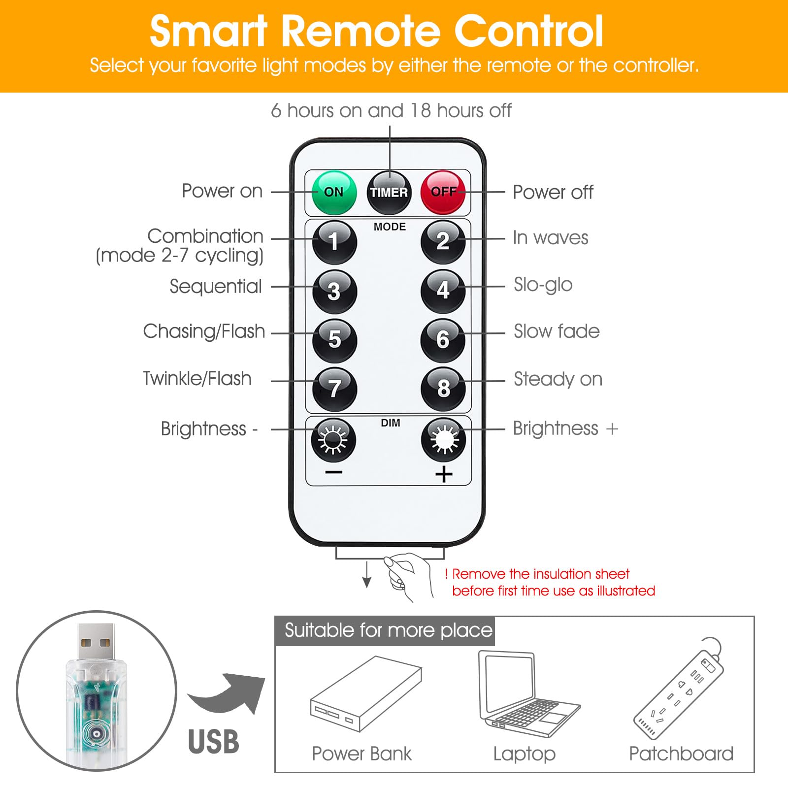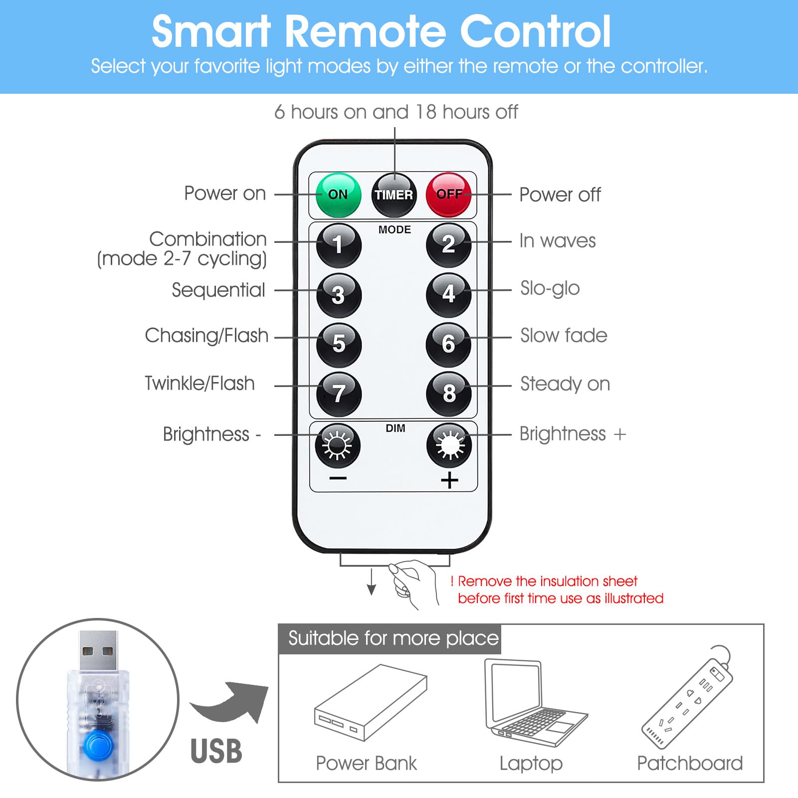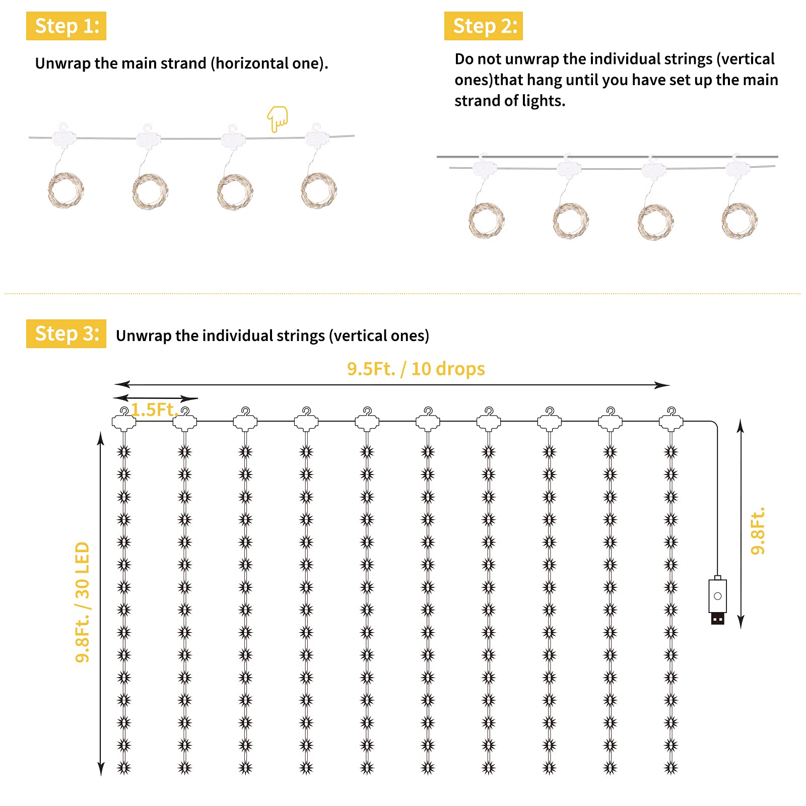 • [ USB Powered ] - Plug in with our USB charger, suitable for more places to get powered even in camping or barbecue. Or Powered by power bank, laptop, cellphone adapter and more.Start and enjoy the curtain lights anywhere you love.