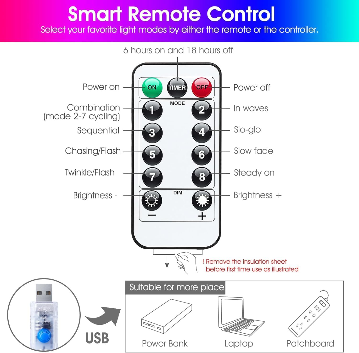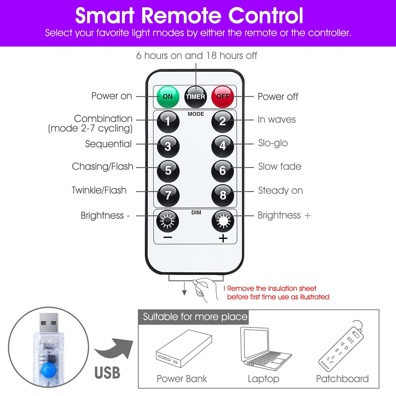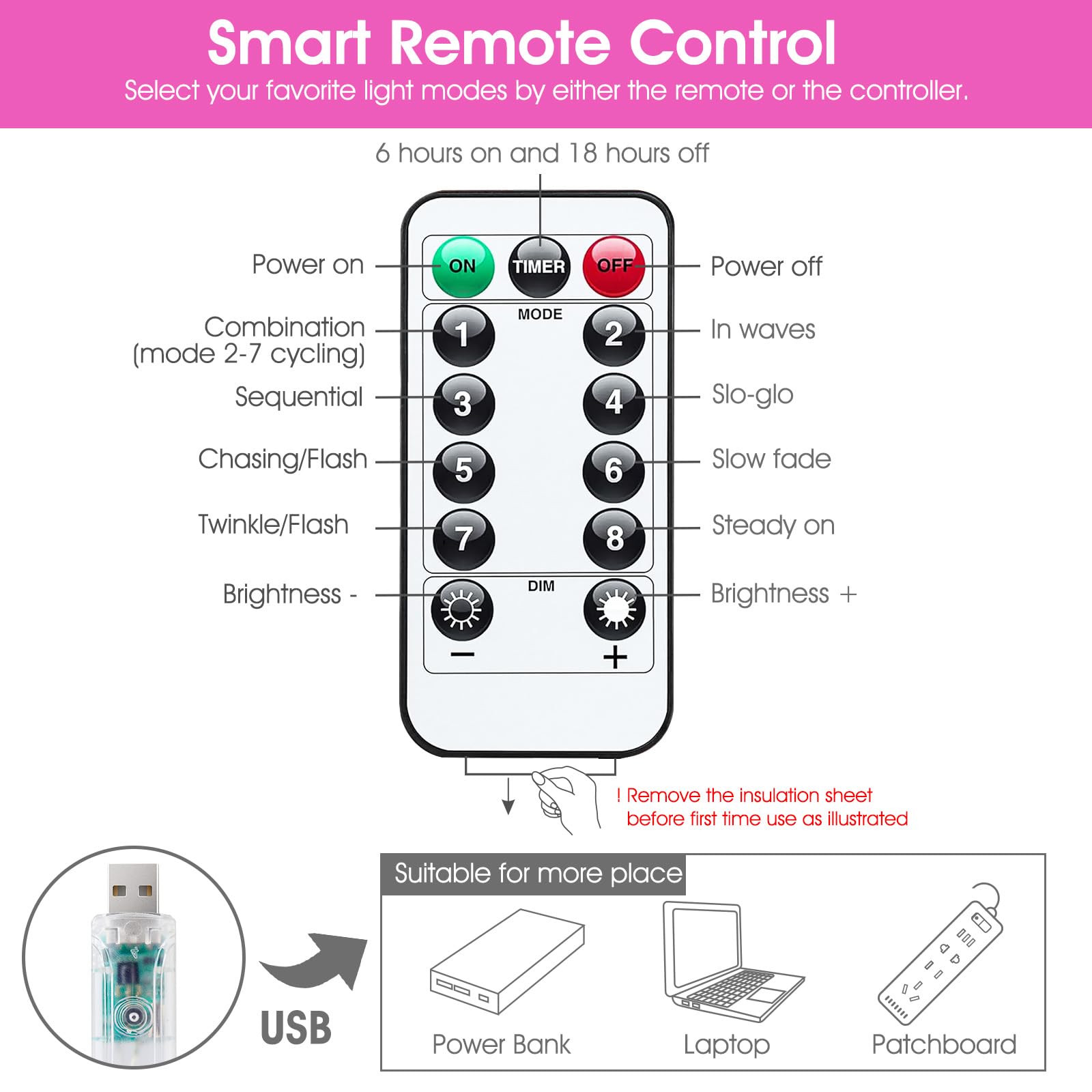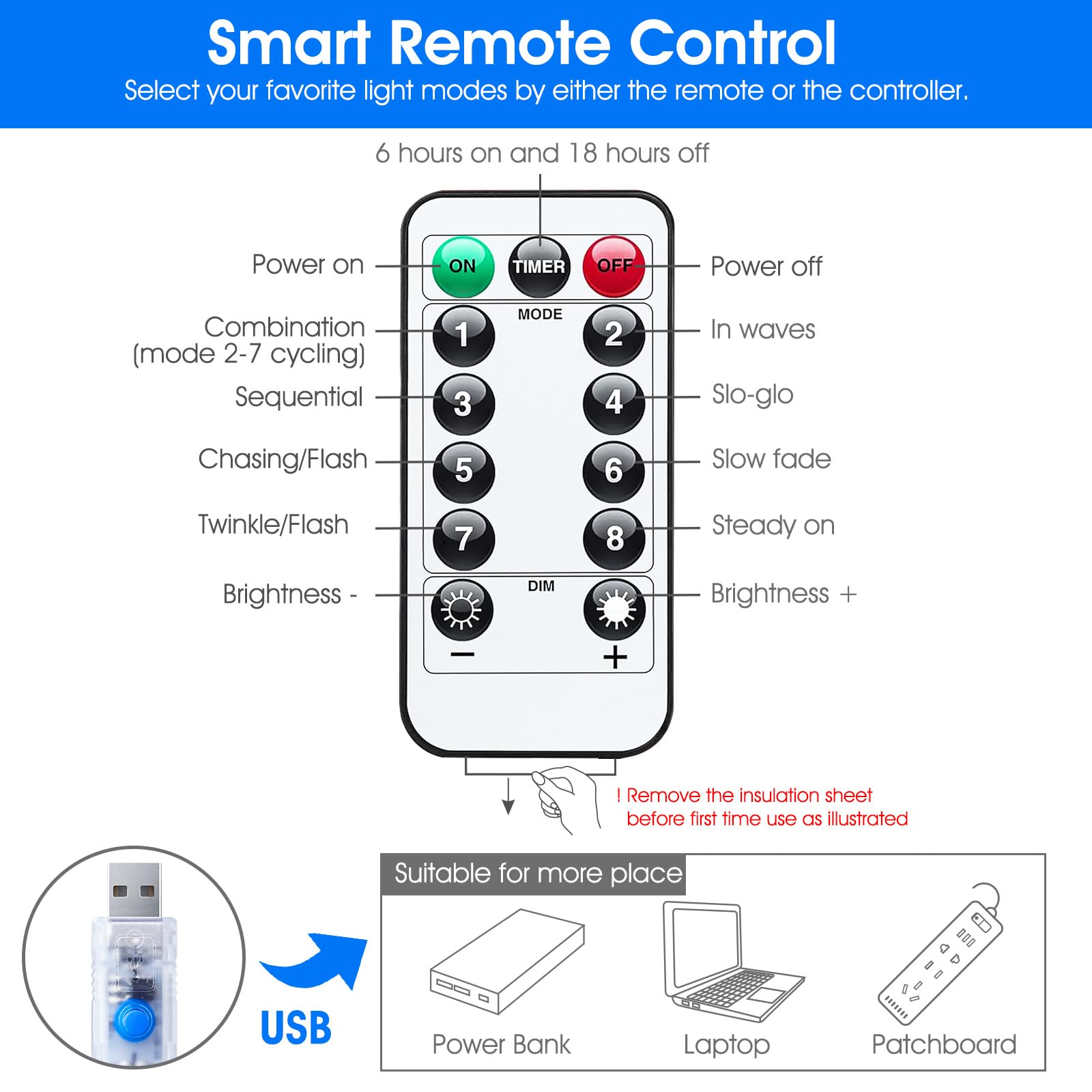 • [ USB Powered ] - Plug in with our USB charger, suitable for more places to get powered even in camping or barbecue. Or Powered by power bank, laptop, cellphone adapter and more.Start and enjoy the curtain lights anywhere you love.