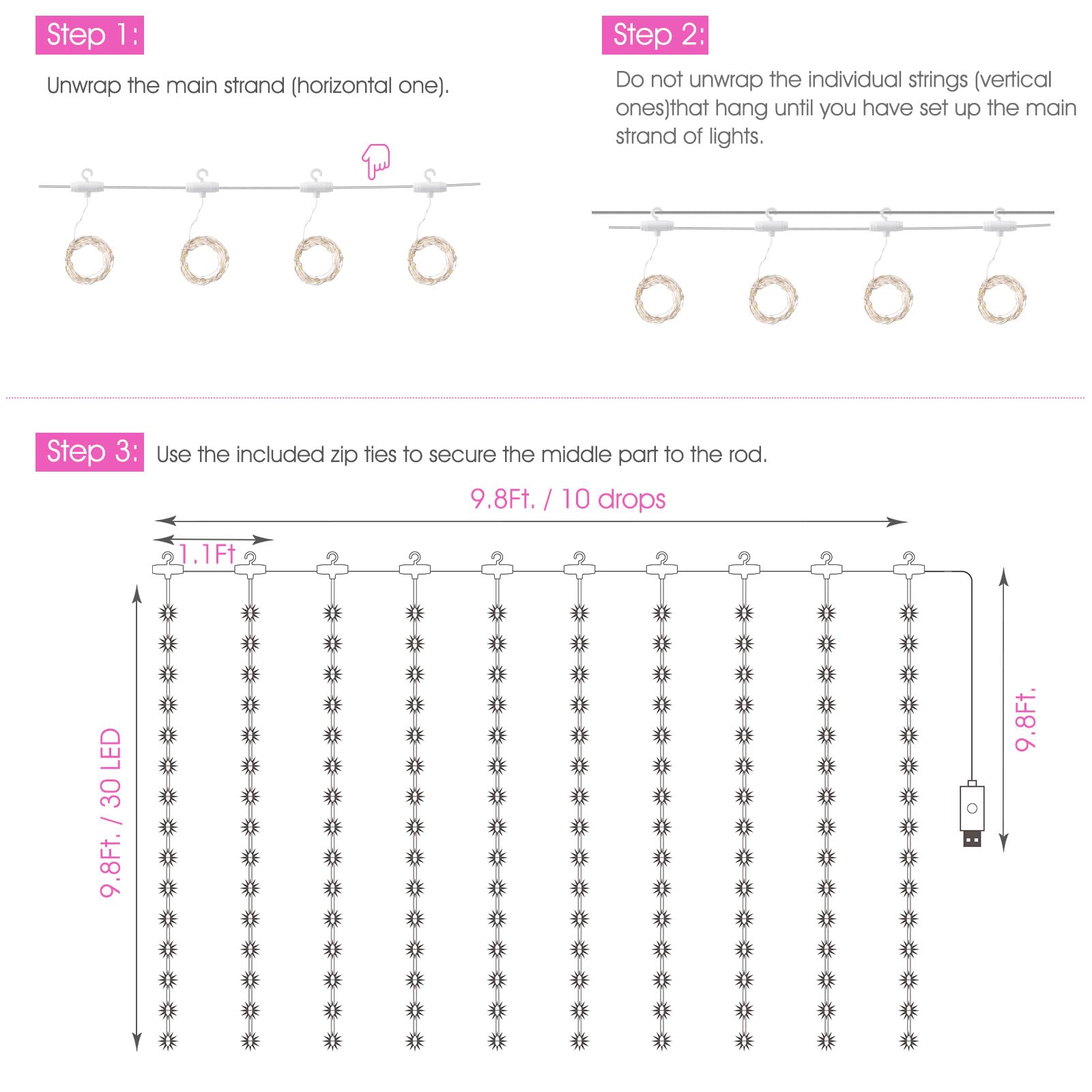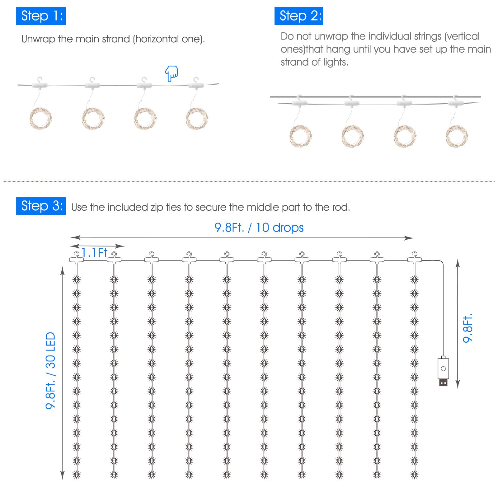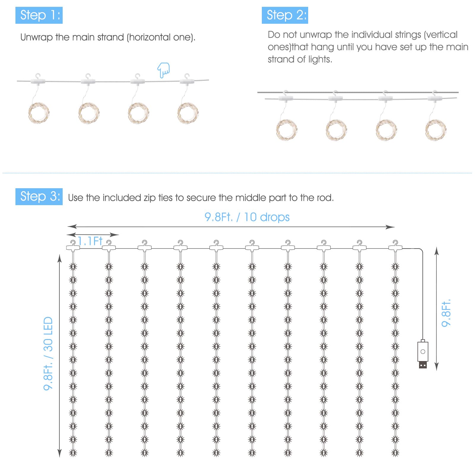 • [ Safety & Guarantee ] - Operated with 5V low voltage, our fairy curtain lights glow with low heating, and it is safe to touch; It can be safely hung on the curtains or on the wall. It is a wonderful decor for dorm, college, bedroom, party, birthday, wedding, Christmas, New Year.