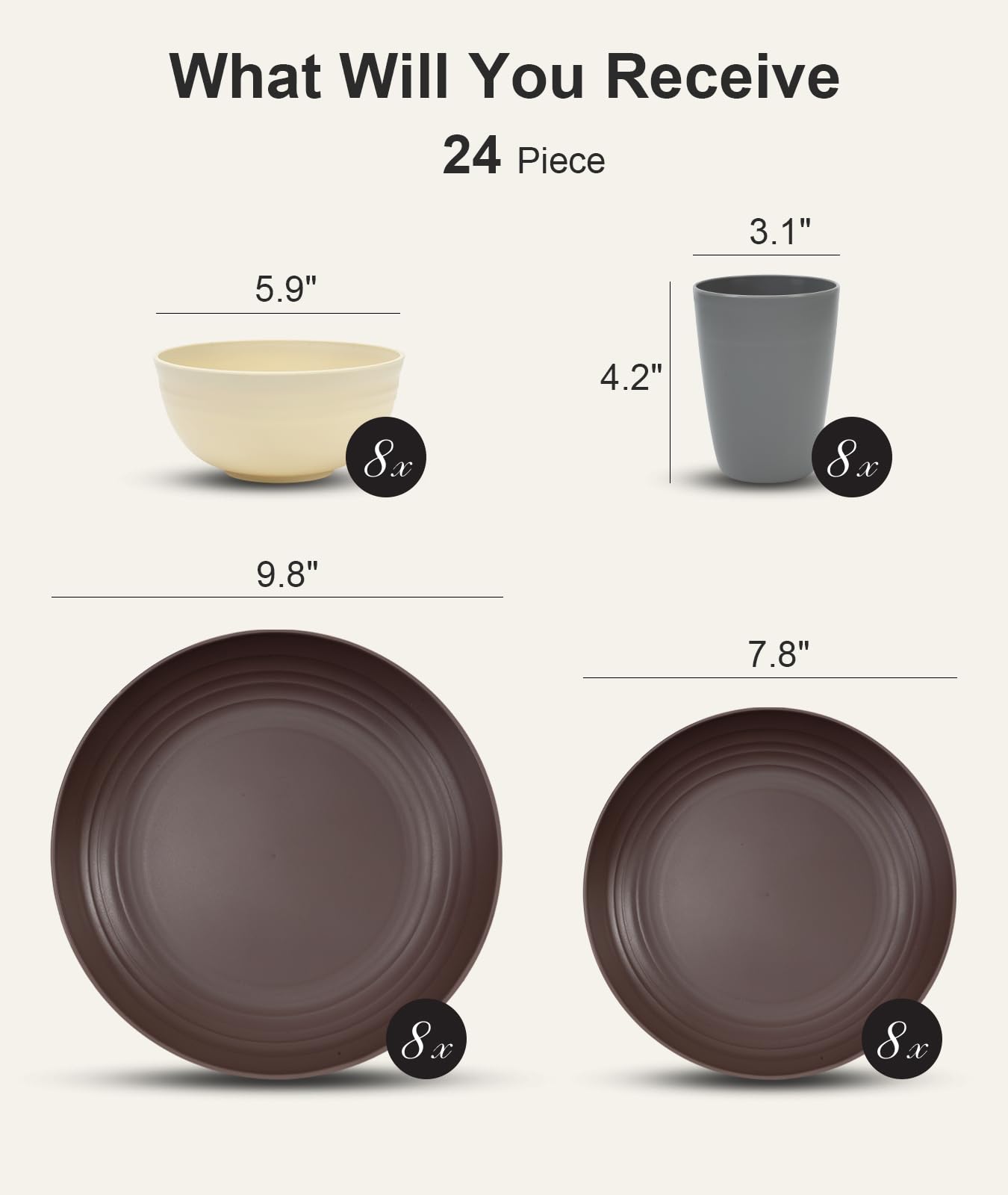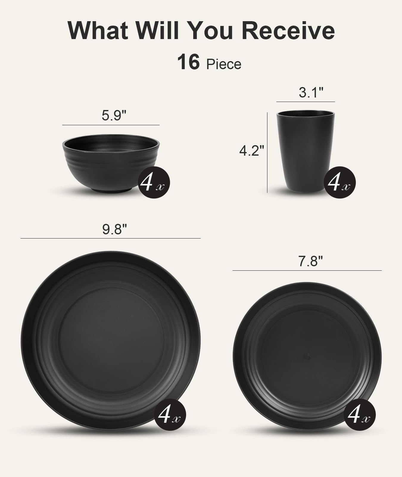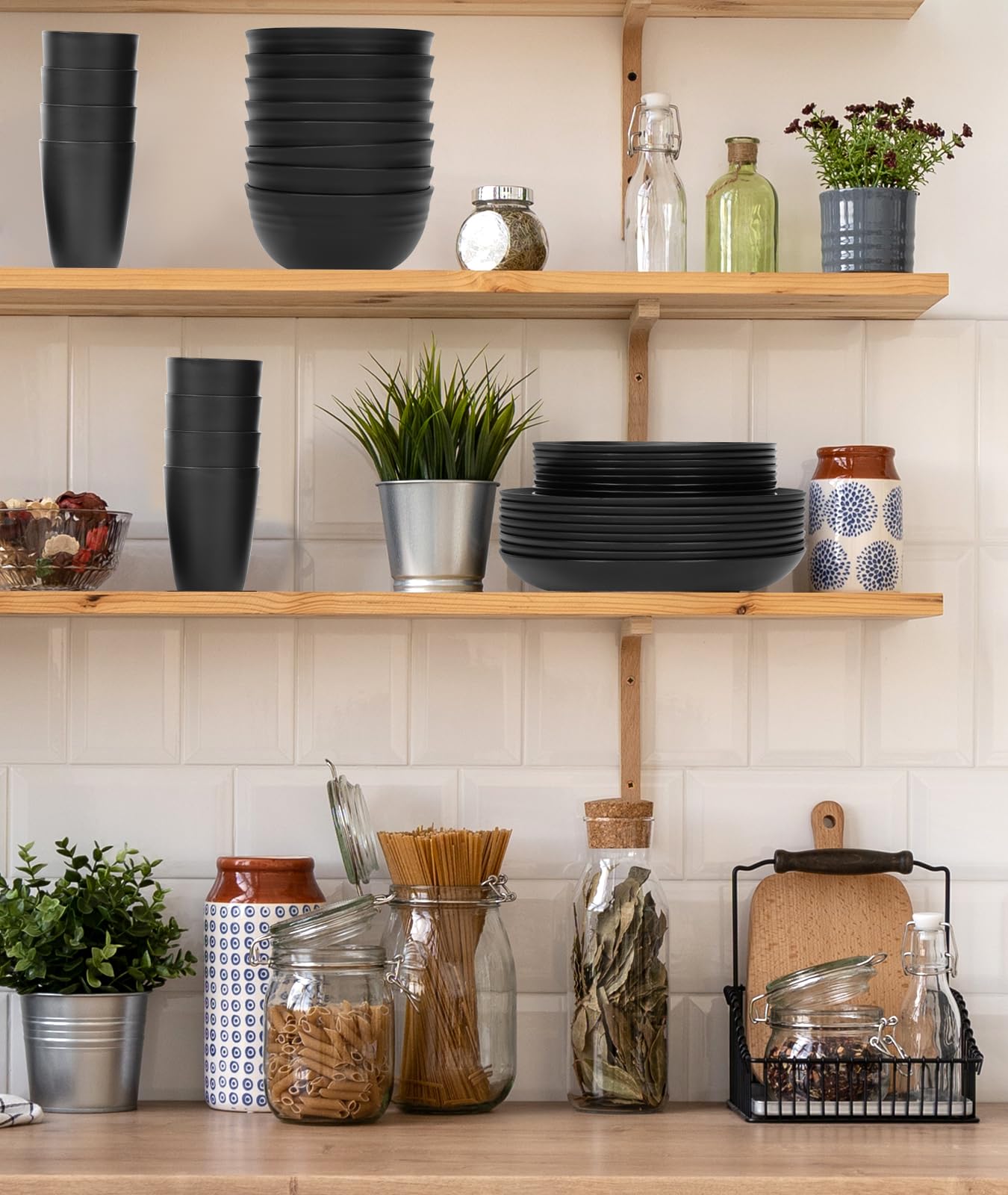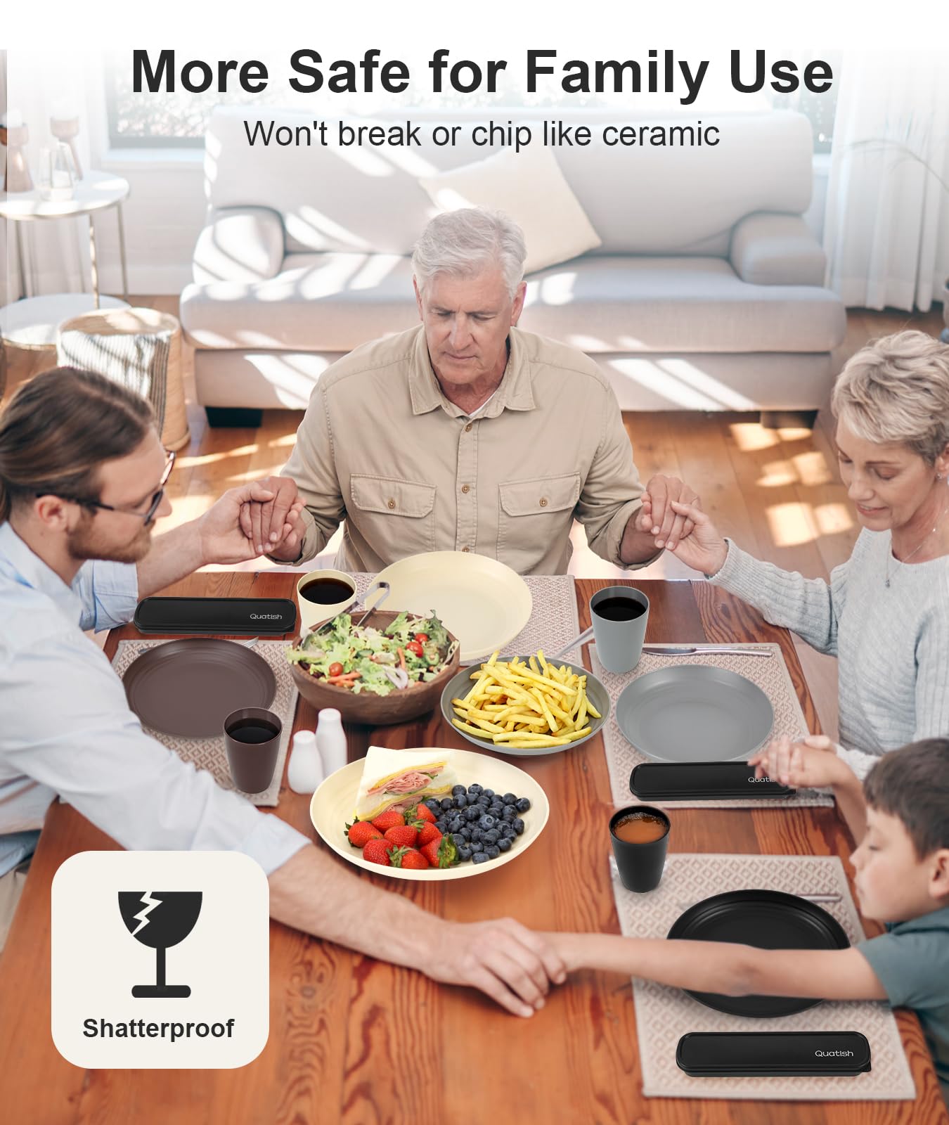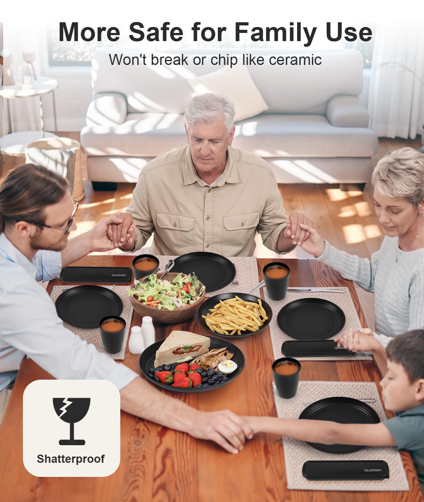 Quatish 24 Piece Plates and Bowls Sets for 6, Unbreakable Dinnerware Sets, Plastic Dish Set for Camping, Dishwasher Microwave Safe, Outdoor Kitchen and Apartment Dinning RV Essentials, Black