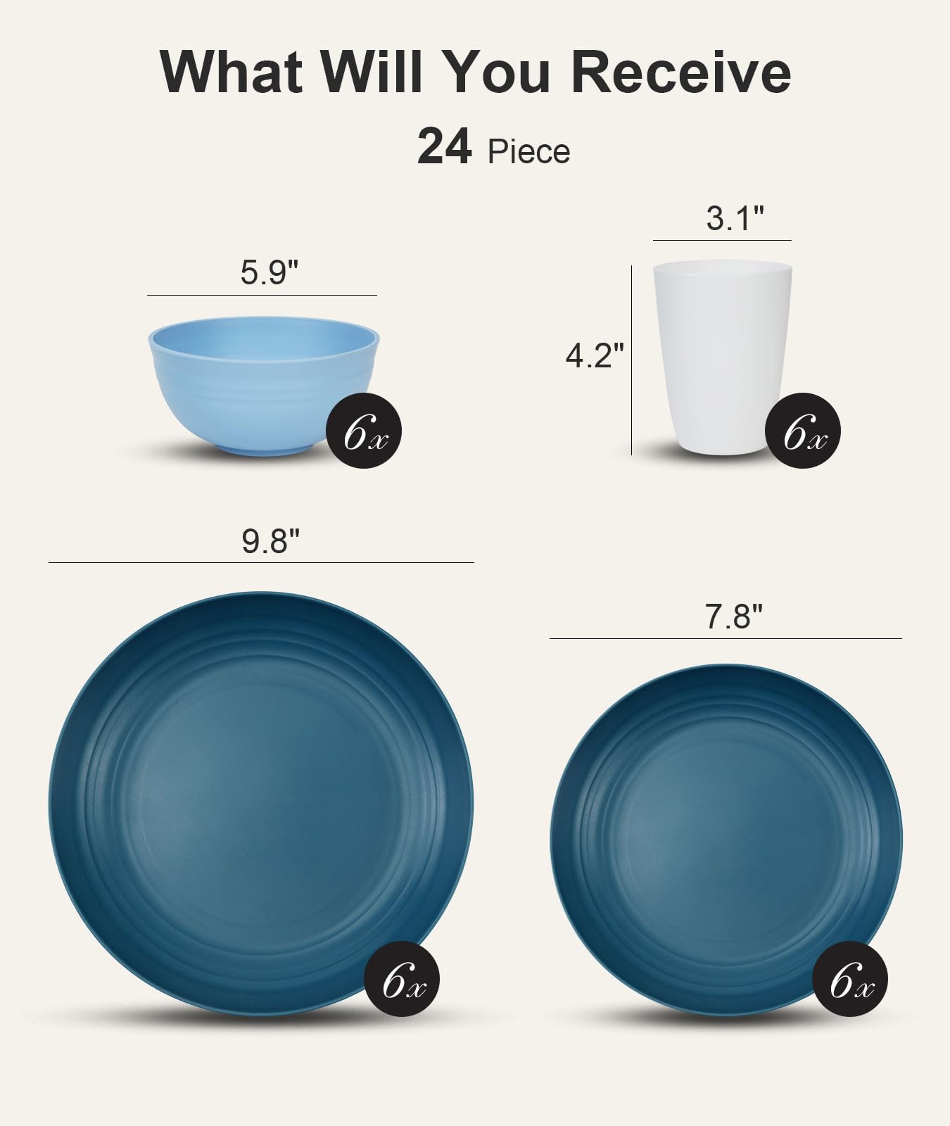 24 Piece Dinnerware Set, Service for 6: Includes 6 round dinner plates, 6 Salad plates, 6 bowls and 6 cups. With a lightweight design, perfect for creating an elegant tabletop presentation