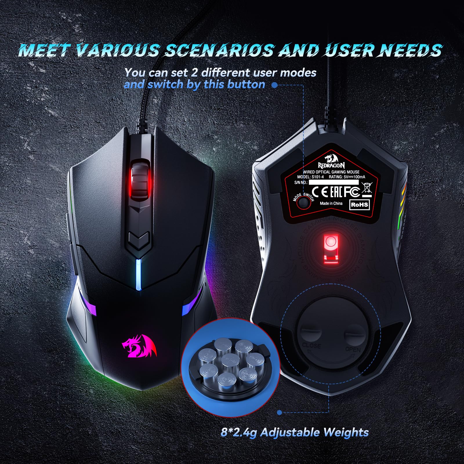 🌟WIRED PROGRAMABLE GAMING MOUSE; Ergonomic Redragon RED Backlit Gaming Mouse up to 3200 DPI (user adjustable 800/1600/2400/3200 DPI), 30G acceleration and Weight Tuning set. Total 6 Buttons of which 5 are programmable(software download on redragon.com). The High-Precision Sensor delivers Pinpoint Accuracy while the Gaming Grade Micro Switches ensure longevity, greater durability, and extreme responsiveness, giving you an even greater edge over your competition.