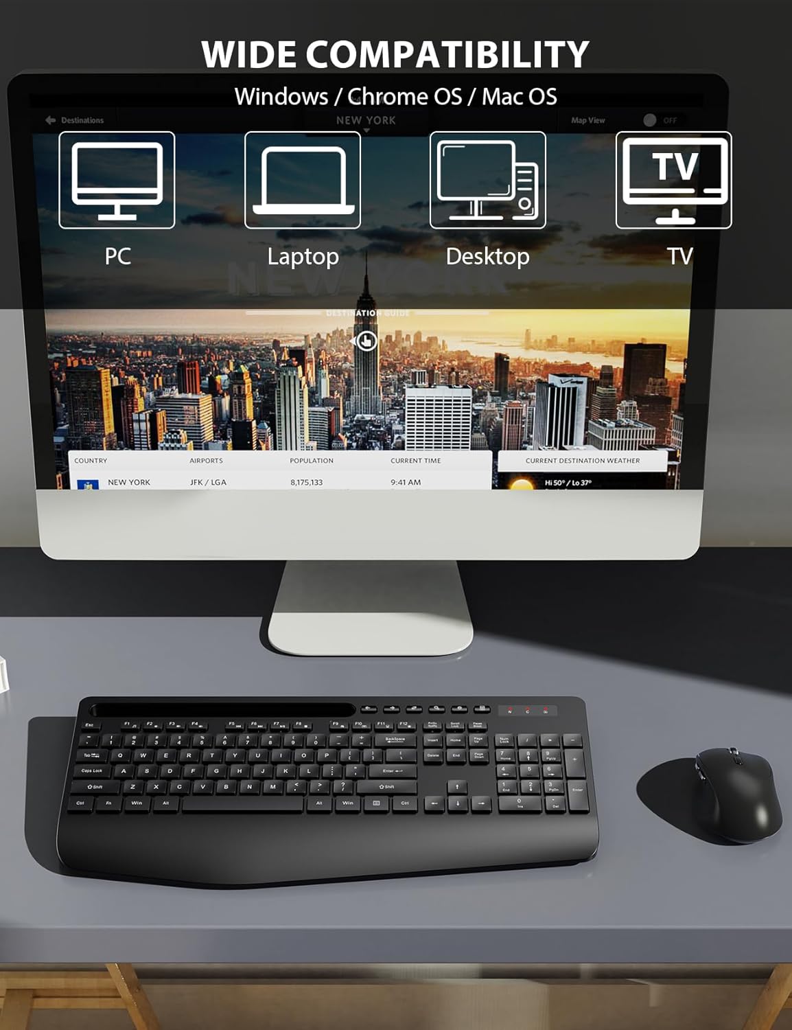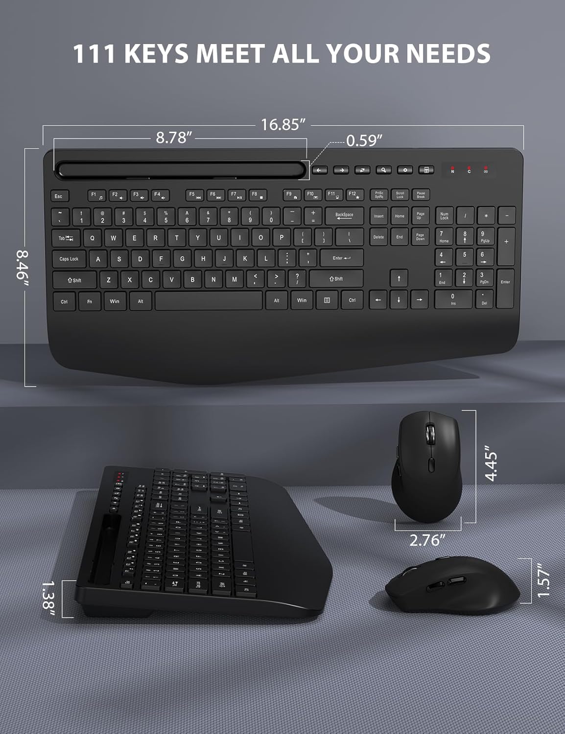 FULL-SIZE KEYBOARD WITH HOLDER - Even when working with this keyboard mouse combo, you'll never miss any messages from your phone, since the built-in cradle can prop up your phone or tablet at a perfect angle to read or watch videos.