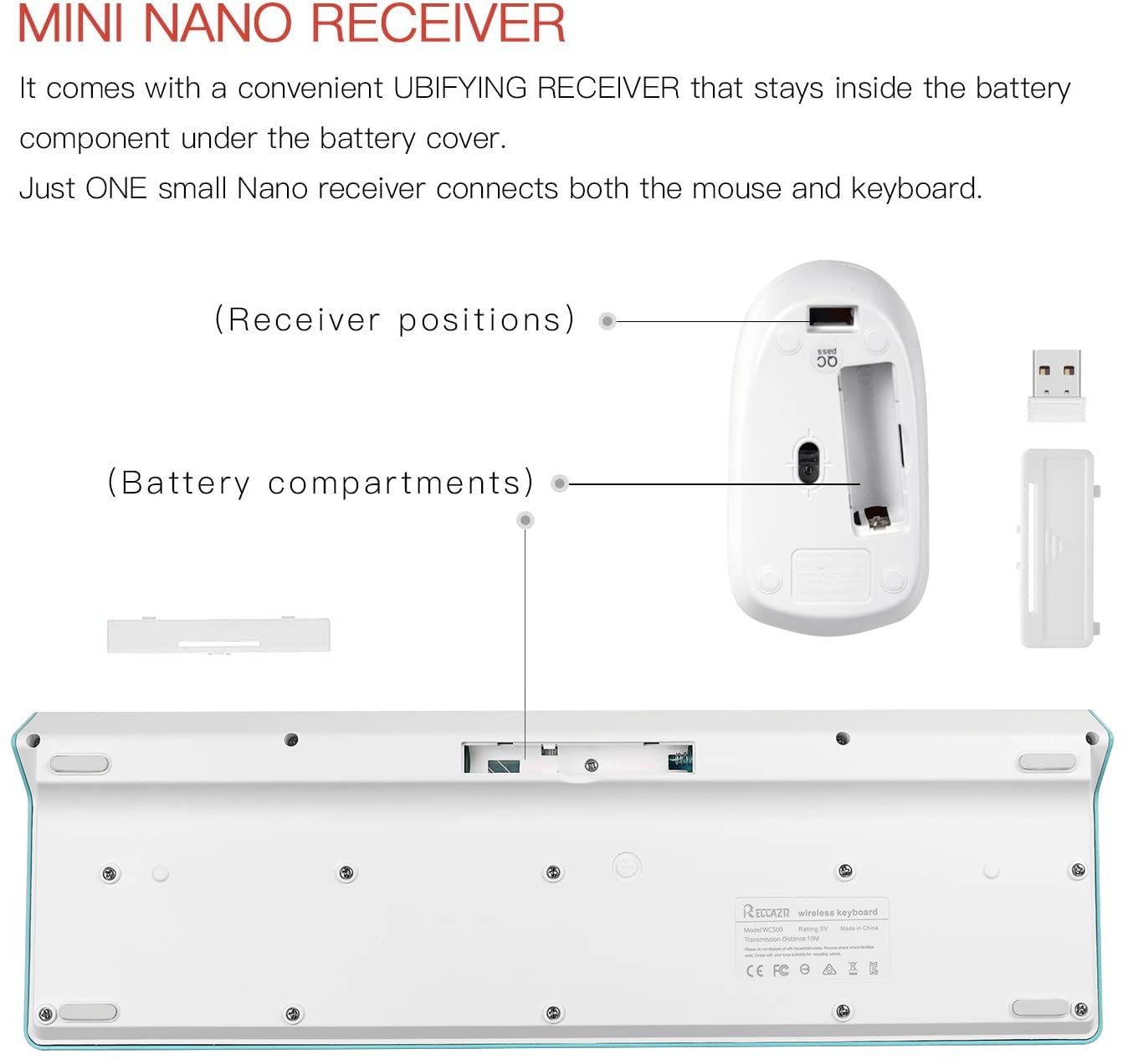 【Enjoy Wireless Freedom】A USB Nano receiver (stored under the bottom of the mouse) connects both the keyboard and mouse. Plug and Play!! keyboard and mouse combo work pretty good on Windows2000/ xp/ 2003/ 2007/ Vista/ Win7/ Win8/Win10, apple,compatible with office or home, notebook, desktop, pc computer. RECCAZR offers you a 1-year worry-free warranty and 30 days no reason refund.
