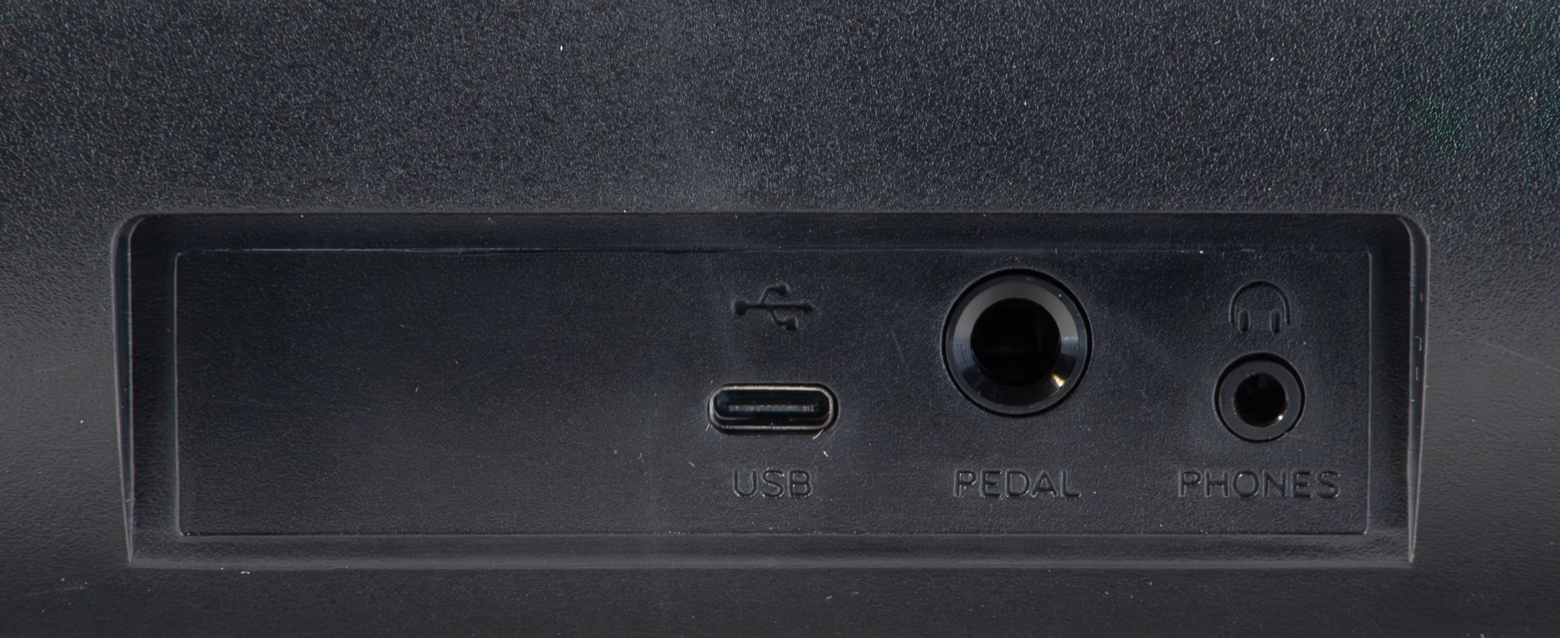 Connection is made via USB-C (USB-C to USB-A cable included) or with 6 AA batteries for portable use. Additionally, there are connections for a sustain pedal (6.3 mm jack) and headphone output (3.5 mm), allowing you to practice in silence.