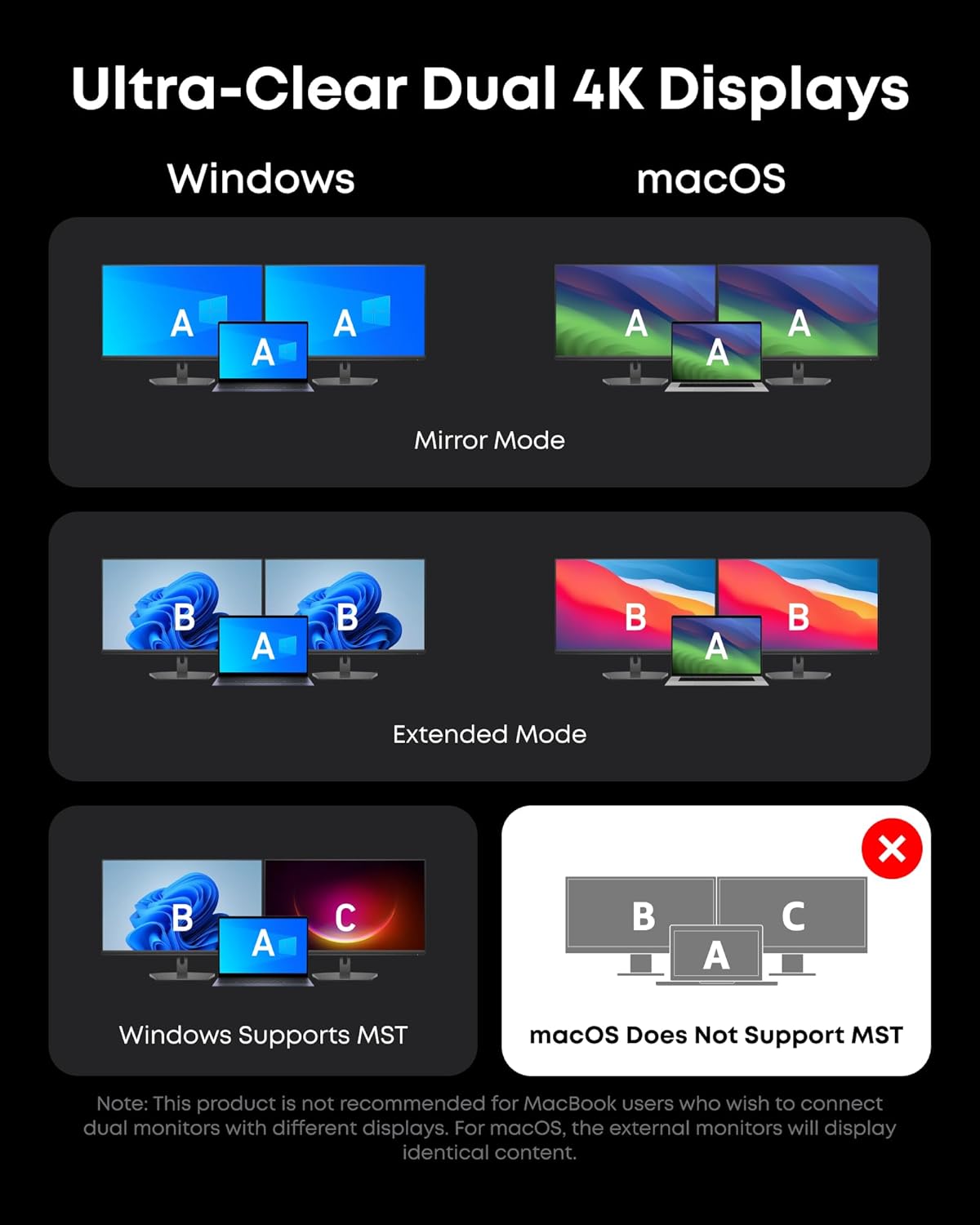 | Compatible Devices | Full Functional USB C Lenovo/HP/Dell laptops,Macbook/iMac(For macOS, the displays on the both external monitors are identical) See more |