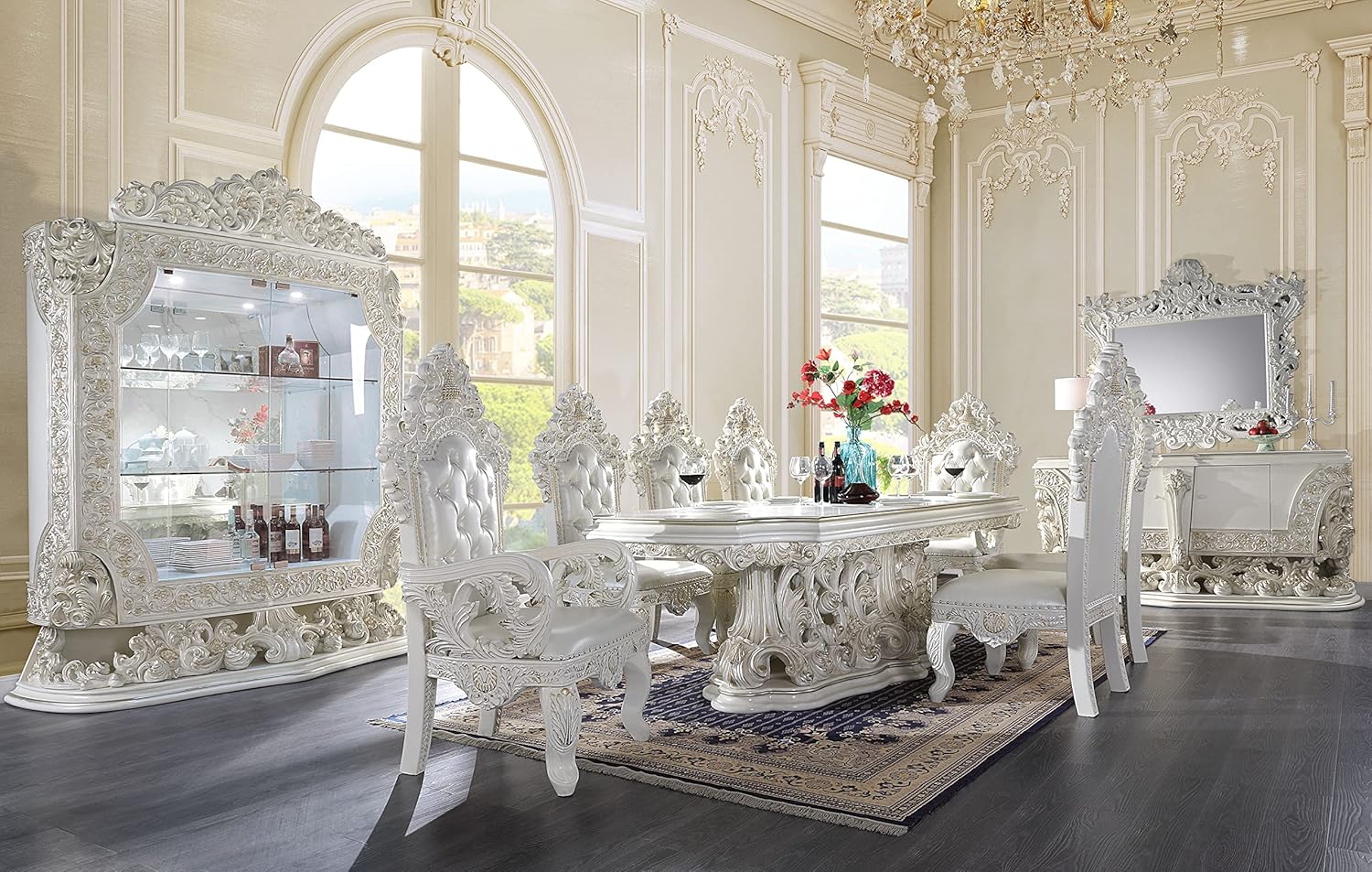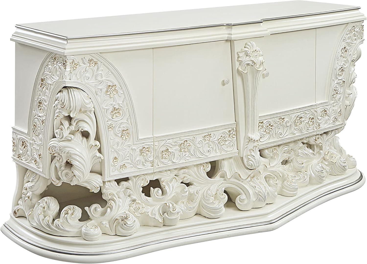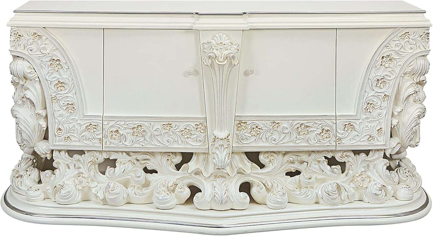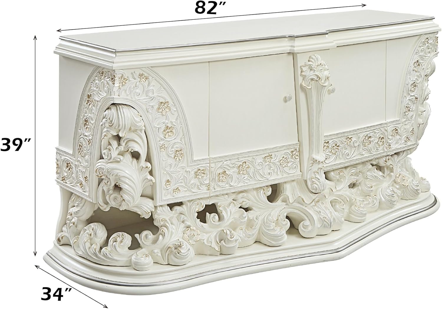 Floral and leaf motives make up the carved designed details of the table. The gold hand brushed details make the table stand out. For storage, the server has 2 doors.