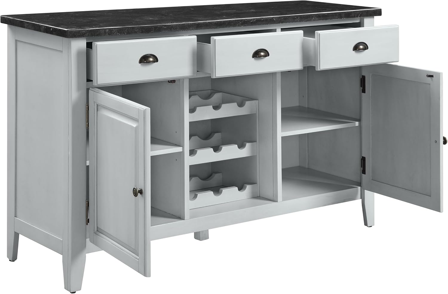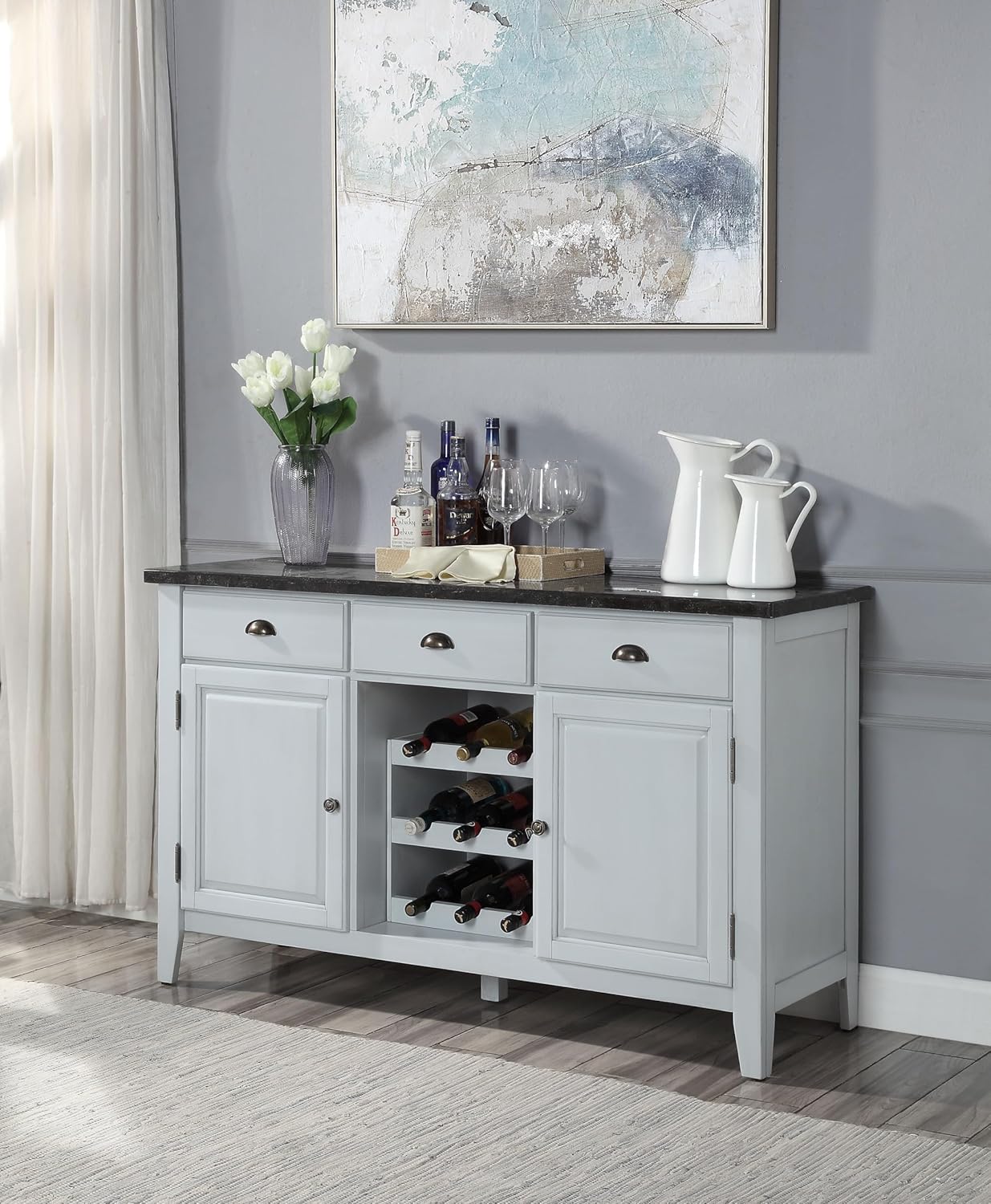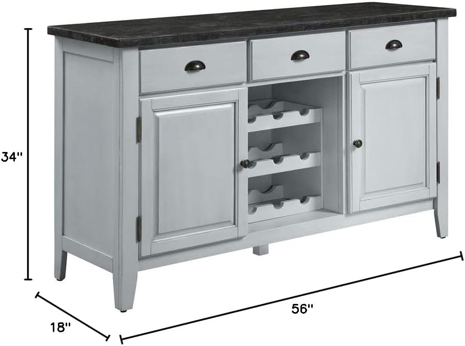 Never go out of style, this pure luxury and elegance bring uniqueness and updated style in any space. The Lanton Server features a classic black marble table top that exudes unashamed luxury and opulent touches. Understated wooden frame graced with antique white finish brings just the right amount of contrast and drama to its design. Versatile functions including felt-lined drawers, cabinets and three-tier wine rack add extra value to your dining space. Give your home that effortlessly chic with the Lanton Server.