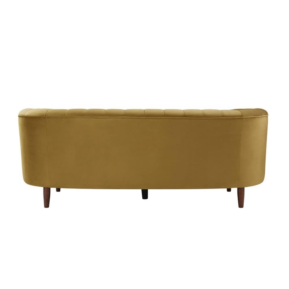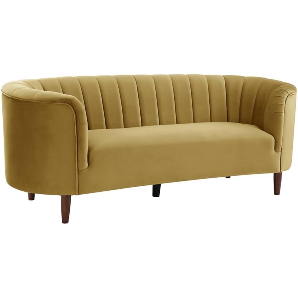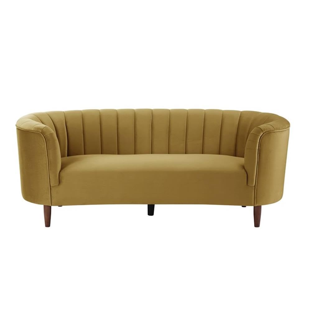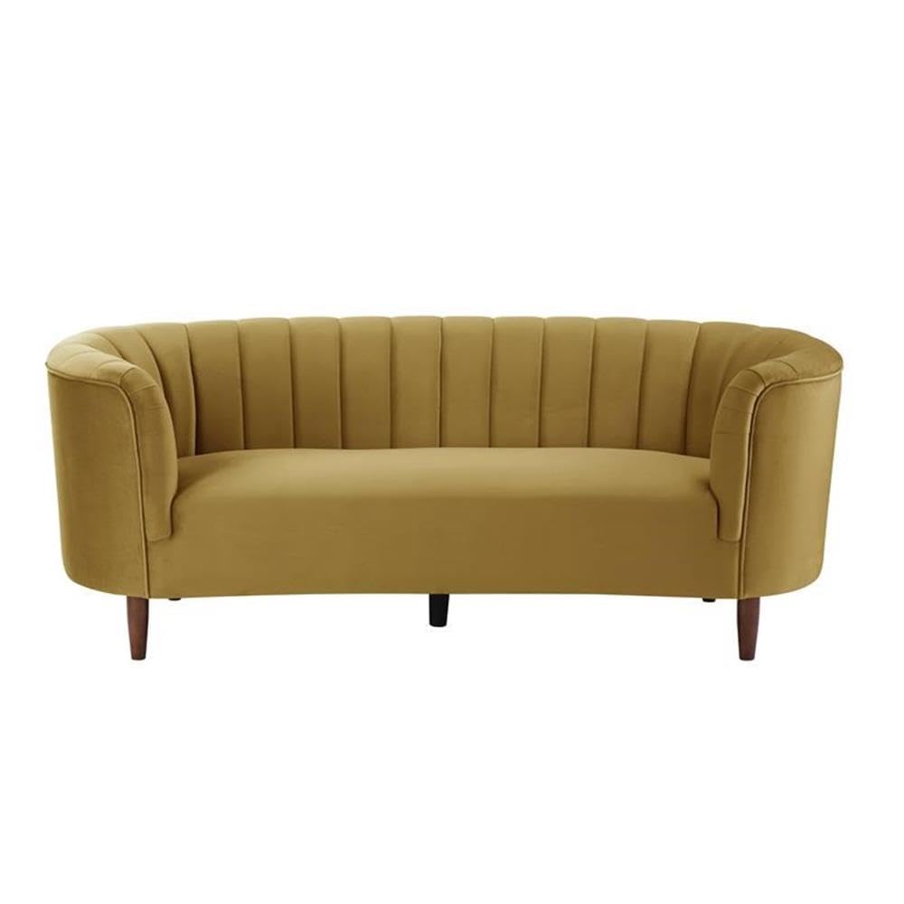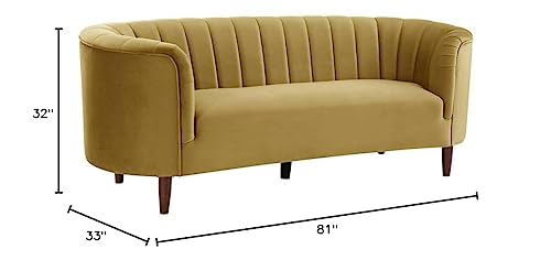 An ode to mid-century modern, the Millephri sofa will help achieve this modern aesthetic. The pocket coil foam seating gives off the feel of sitting on a plush cloud. It is upholstered in a gorgeous velvet fabric and feature deep channel tufting, for added texture and depth. The wooden legs provide stability and style. This sofa provides an instant upgrade in any room. Available in three colors, olive-yellow, gray and, blue.