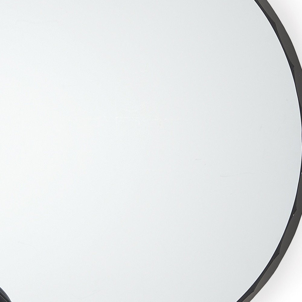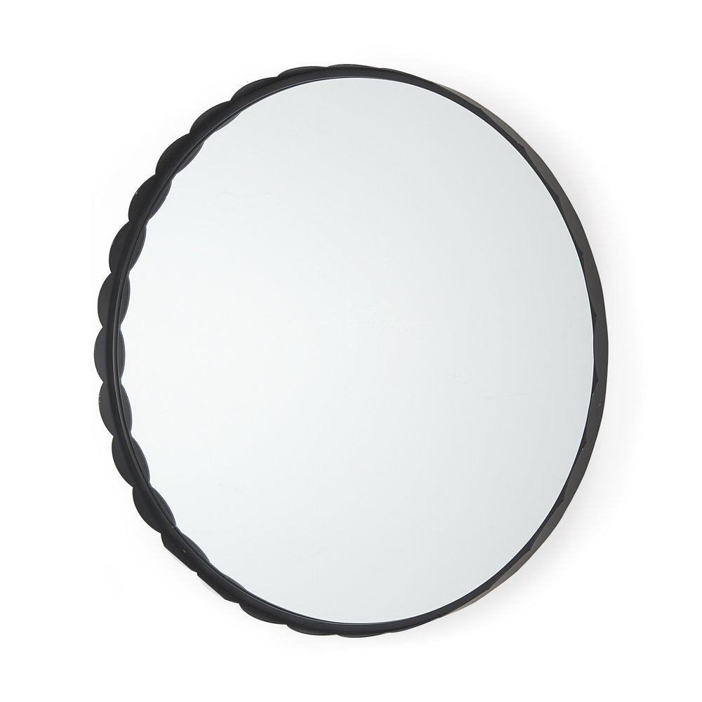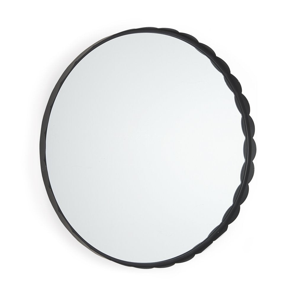 Beautify your space with this 30-inch black metal scalloped framed accent mirror. Framed with metal, this mirror will bring practical application and fashionable design to your space, adding some modern flair to your decor. This mirror will be a great useful addition to your home but will also help elevate the space in the room. Produced with premium quality glass for a beautiful reflection, this mirror will provide an exceptional visual experience. 29.72-inch h x 29.72-inch w x 1.97-inch d.