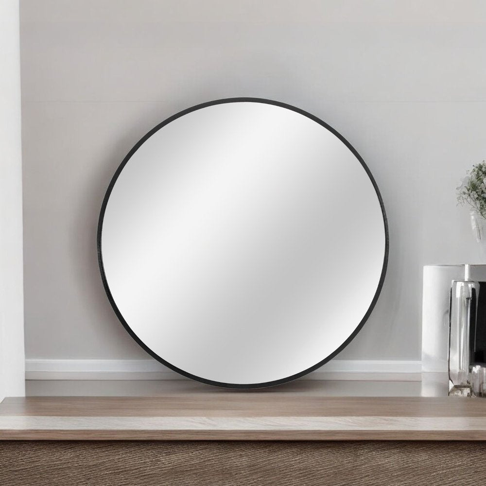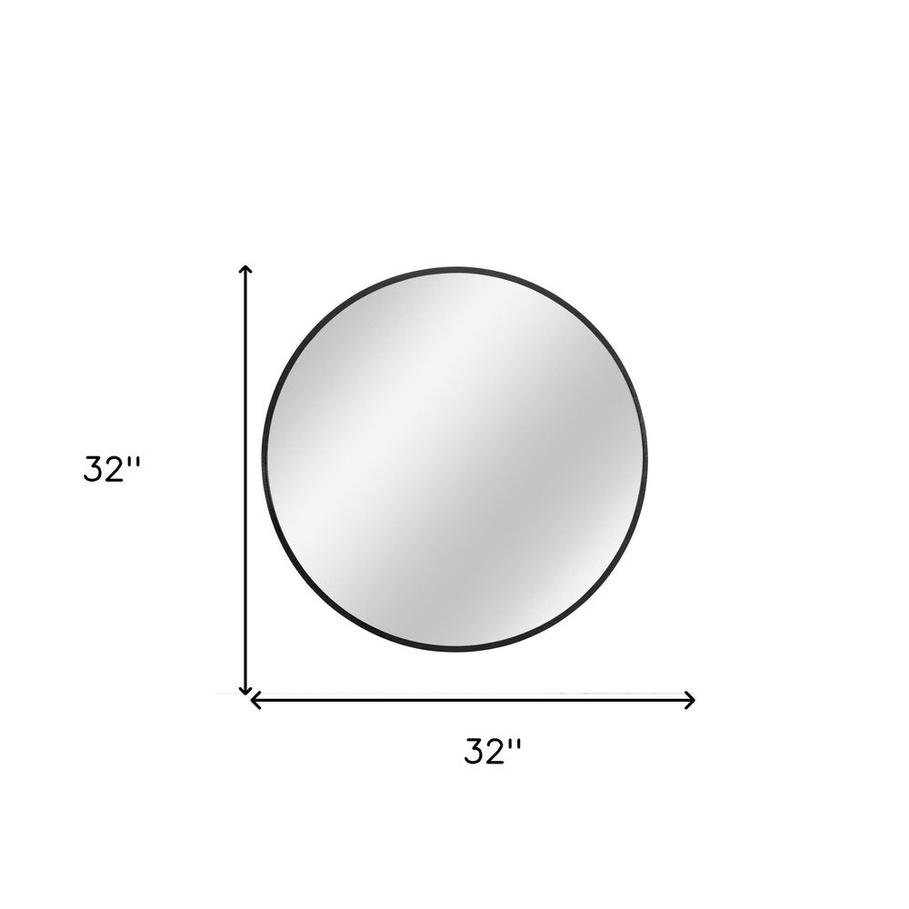 Beautify your space with this 32-inch black round metal framed accent mirror. The inlaid frame crafted of metal and finished with does not apply hue, creating an elegant appeal. Framed with metal, this mirror will bring practical style and fashionable design to your space. Featuring a transitional style that will be practical and fashionable. This mirror will be a great useful addition to your home but will also help elevate the space in the room. 32-inch h x 32-inch w x 1.6-inch d