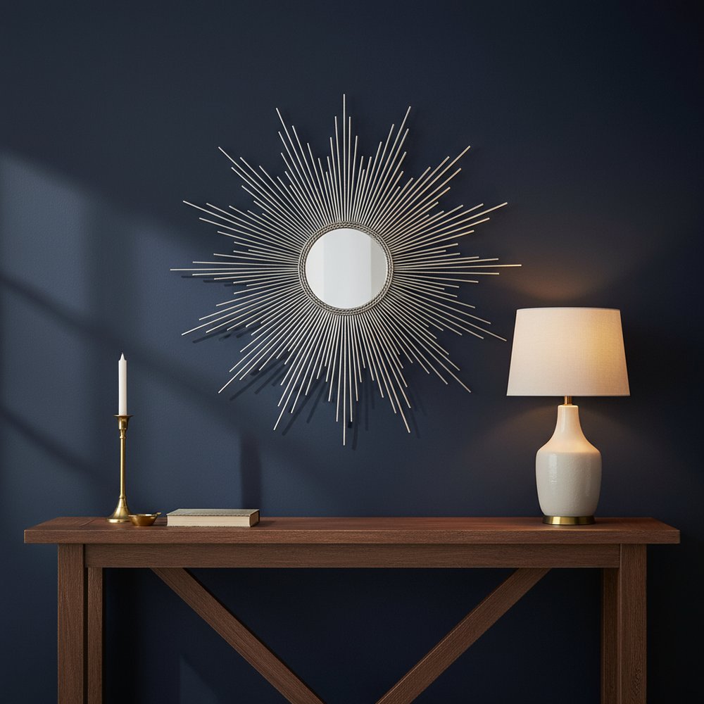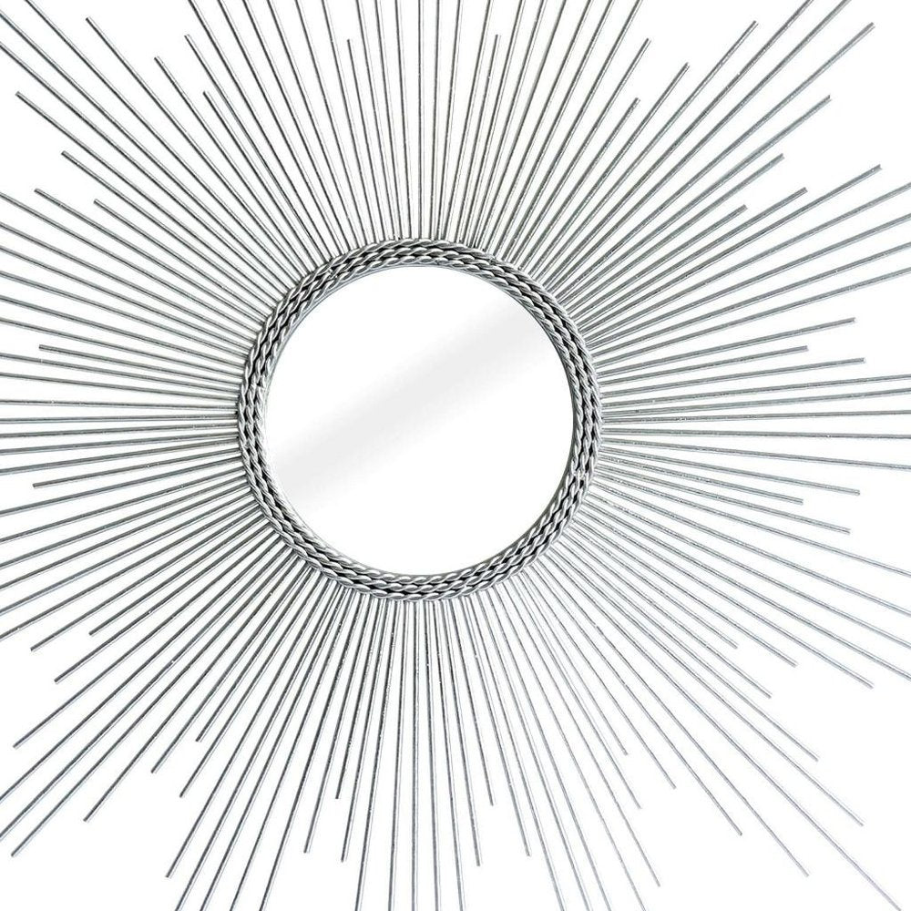 Keywords sunburst geometric framed accent mirror, geometric framed accent mirror, framed accent mirror, metal sunburst geometric framed accent, 32" silver metal sunburst geometric