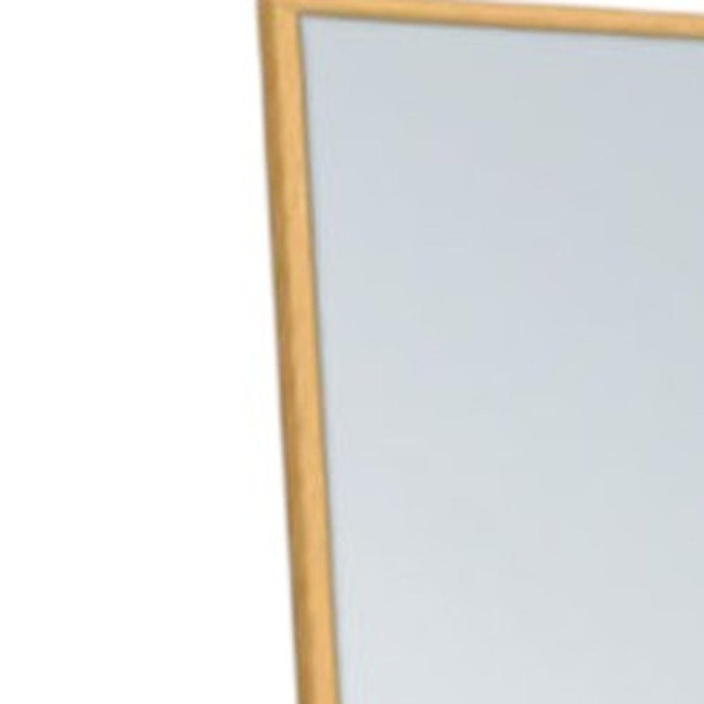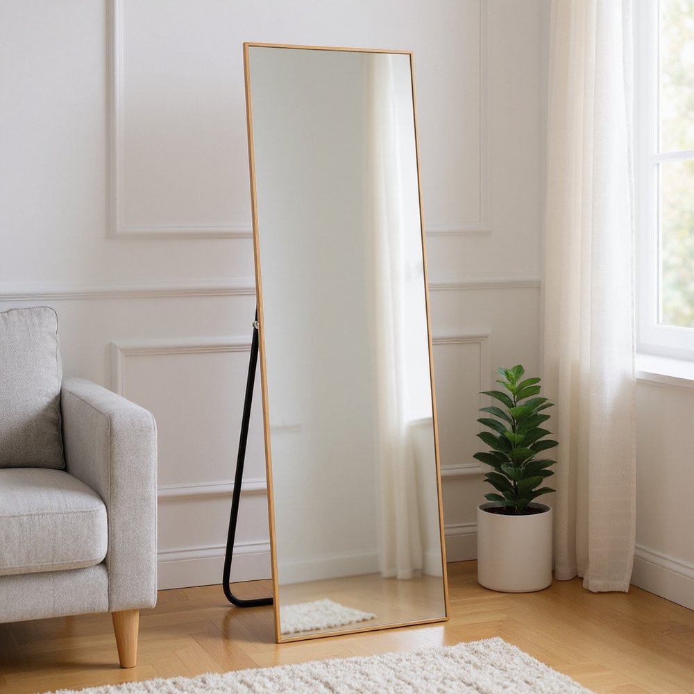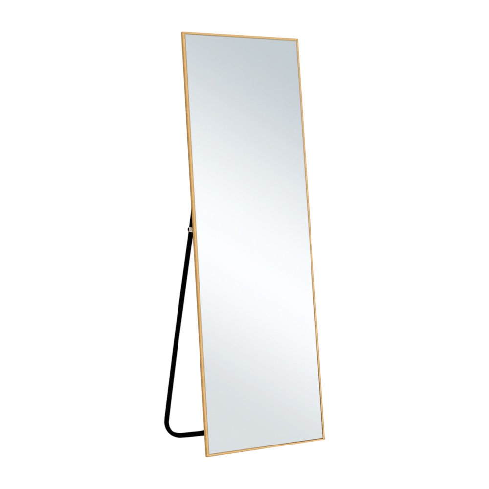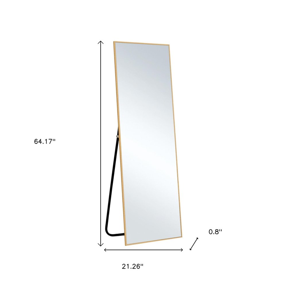Add a touch of minimal design combined with utility to any space in your home with this 64" Sleek Gold Frame Full Length Mirror. The mirror has a large rectangular shape and is encased in a thin gold frame made of aluminum alloy. This lightweight yet durable mirror can be hung vertically or horizontally, or has easel legs to stand independently or lean against the wall for a versatile contemporary look. 64.17" H x 21.26" W x 0.8" D