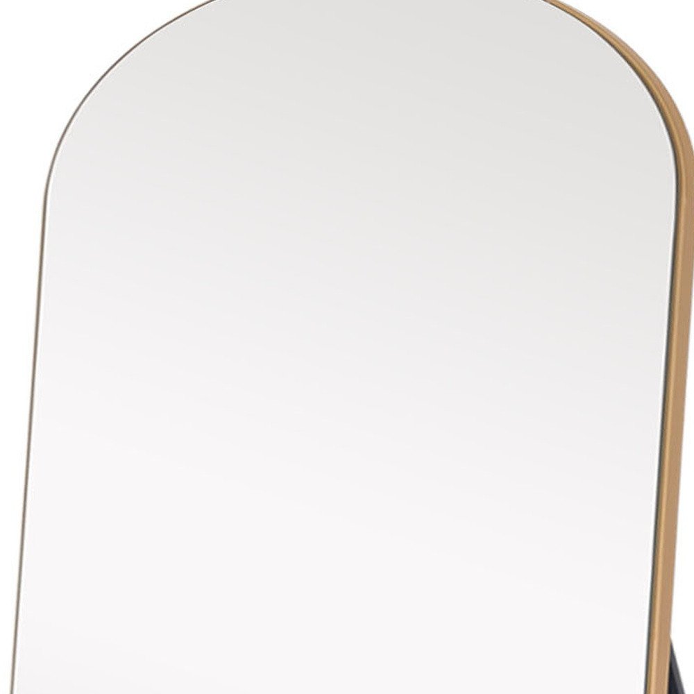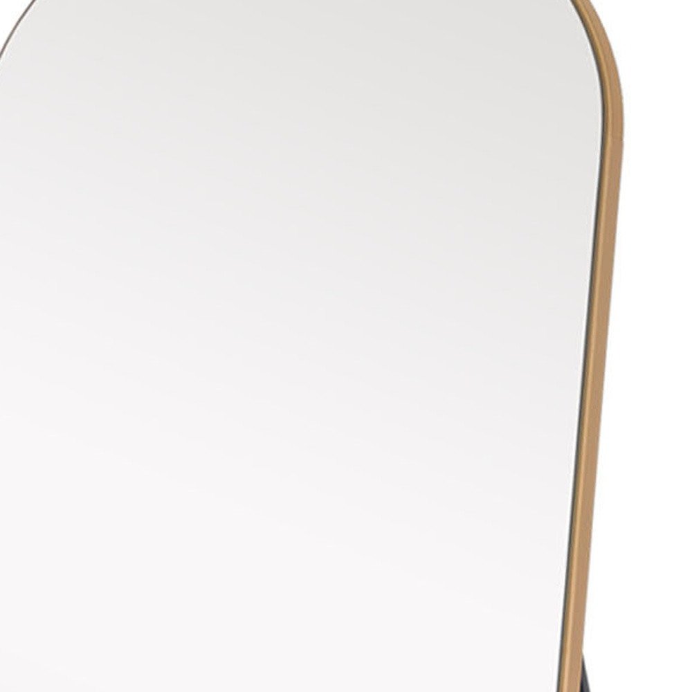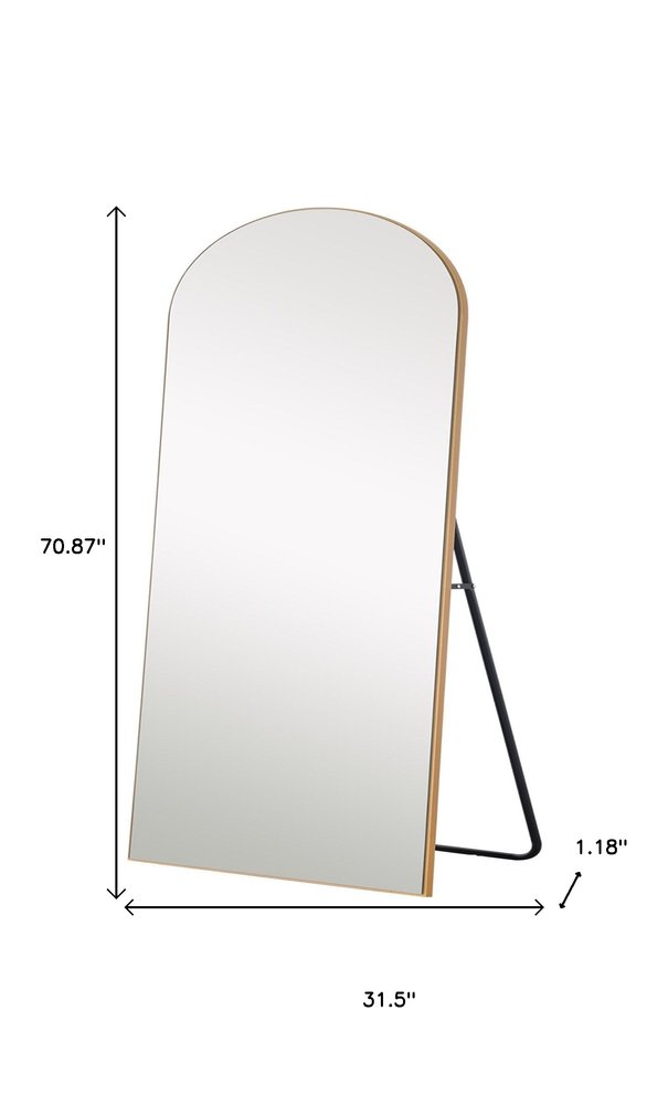 Design and utility in one, this Gold arched mirror with stand will not only elevate the look of any space in your home but will also add brightness. The large mirror has a rectangular shape with an arched top. The arched top adds character to the overall look of this mirror which is emphasized more by the thin Gold solid wood frame around it. At the back there is an aluminum stand that allows the mirror to stand freely wherever it is placed. Use it anywhere in your home as a practical mirror and striking decor piece. 70.9" H x 23.6" W x 0.9" D