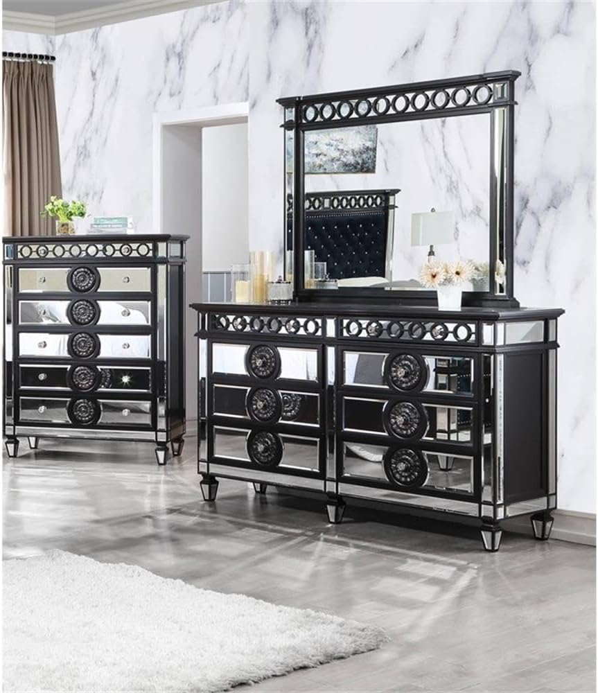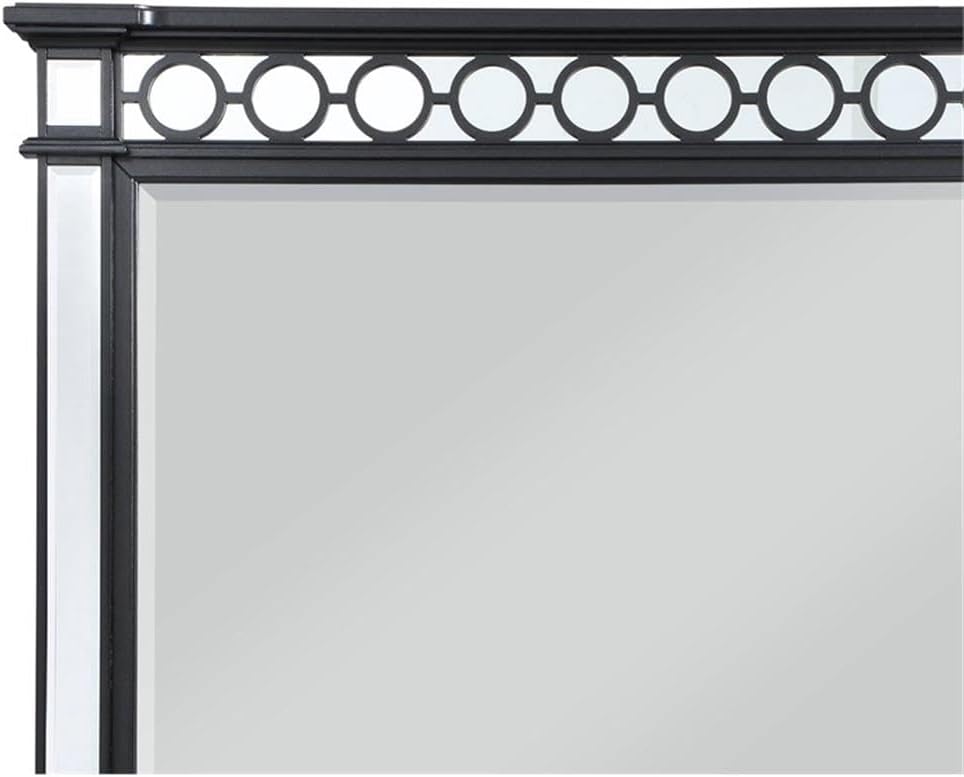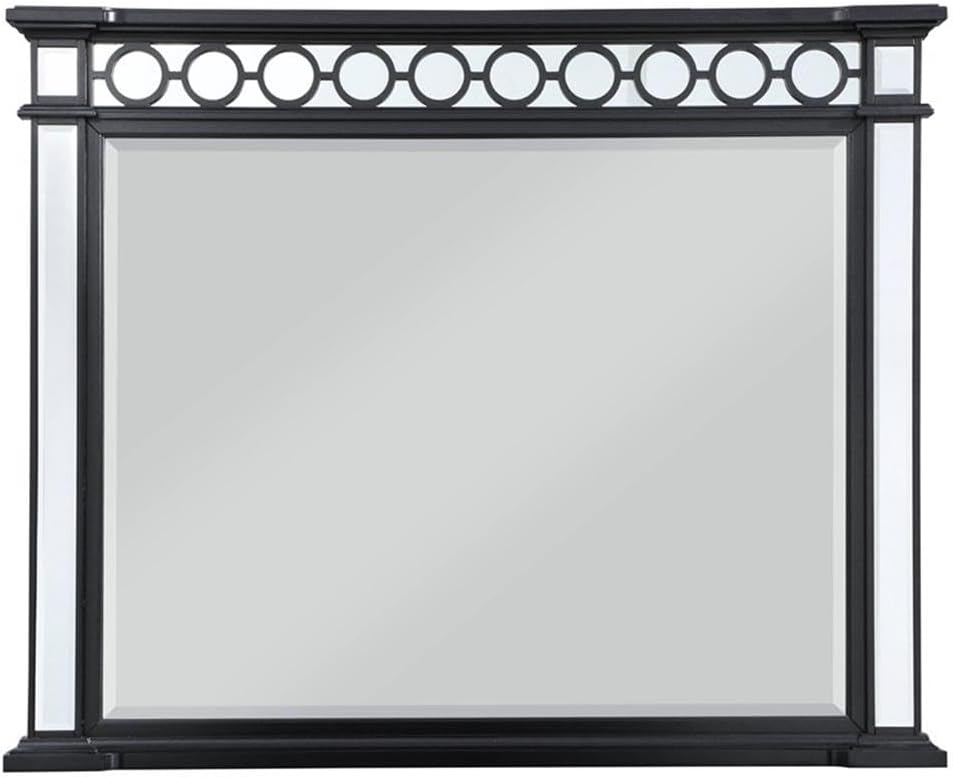 Mount this stunning contemporary mirror on top of a dresser for a glamorous touch. With a rectangular shape outlined in a black frame with classic crown molding and geometric trim accents, this modern glam mirror makes itself at home in sleek, romantic bedroom interiors. Beveled mirror tile and trim outline the edges of the large beveled mirror, as ringlets top it all off to create a wonderful retro-inspired flair.