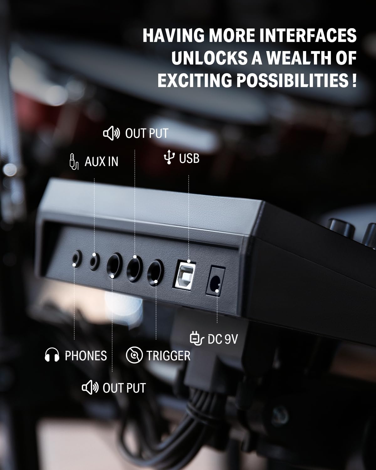 【Diverse Sounds Selection】With faithful real drum sampling, the electric drum kit offers 450 sounds and 31 classic and modern drum kits that are more than enough to deliver an exciting performance.
