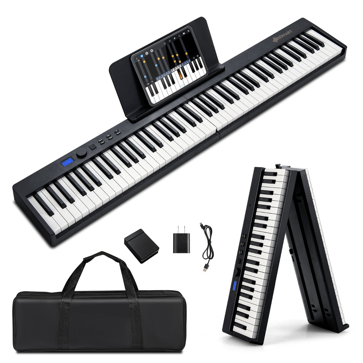 This electric piano has all the indispensable functions of recording, metronome, vibrato & sustain, drum kit, transpose, and 2 chords that you need to compose your melodies. The semi-weighted key makes the timbre and sound more musically expressive, displaying the most delicate differences. It can be split for duet play. And the blue-tooth MIDI function adds the assistance of phone apps, and laptops while the blue-tooth audio function delivers the online songs through the speakers with a flawless sound. It is fun to play with 128 tones, 128 rhythms, and 20 demos. With 2 teaching modes, this portable piano is beginner-friendly, but also suitable for senior players to operate and play music through an LCD, control buttons, and an encoder. The full set packs with a carry bag, sustain pedal, Type-C USB cable, and a 5V1A adaptor. Bullet Point: Foldable Keyboard with Rechargeable Battery: This portable piano easily folds out 180°in a backpack size after releasing the button lock for more flexible use, which redefines the portable piano. And it weighs only 10.4 lbs to provide convenience and efficiency for travelling musical enthusiasts. It has a 7-hour battery life after a full charge. Blue-Tooth MIDI & Audio: The Blue-tooth MIDI function allows a fast and stable connection to Laptop, and phone apps to practice a wide range of accomplishments and record your original music, which is way cooler than a MIDI socket. And the blue-tooth audio function plays your favourite online songs through keyboard speakers. Semi-Weight 88 Keys: 88-key full-size keyboard with 1:1 ratio keys closely replicates the feel of the traditional piano. The semi-weighted key with adjustable touch response suits your preferred playing style and accurately reflects the nuance of your playing. This keyboard also supports a split function and 2 educational modes to teach novices and beginners. Lossless Sound with Useful Features: The stereo speaker enables you to hear the full dynamic range of 128 tones, 128 Rhythms, and 20 demos. There are indispensable features of recording, metronome, vibrato& sustain, drum kit, transpose, and 2 chords functions that help you to mix and enrich your musical works. Easy Control with Full Kits: Includes a carry bag, sustain pedal, Type-C USB cable, and a 5V1A adaptor. The LCD informs the musical sequences and indicates volumes with an easy-control encoder. There are multiple jacks on the back to be compatible with power, earphones, microphones, and sustain pedal. Features: The foldable electric keyboard fits into a backpack for travel, tours, and more Battery-powered piano lasts 7 hours for on-the-go performances. Carry bag, sustain pedal, Type-C USB cable, 5V1A adaptor included MIDI function & wireless audio for a wide range of practice 88Full-size semi-weighted keys for rich timbre It supports a split function for duet playing Premium speakers deliver lossless sounds with 128 tones, 128 rhythms, 20 demos Recording, metronome, vibrato&sustain, drum kit, transpose, 2 chords LCD, control buttons, and an encoder for easy use Instruments for beginners and seasoned pros Multifunctional internal jacks for power, earphones, microphones, and sustain pedal Specifications: Colour: Black/White Material: PVC+ABS + 600D Oxford Fabric Product Dimension: 122.5 x21.5 x 6.5 cm (L x W x H) Folding Dimension: 61.5 x 21.5 x 13 cm (L x W x H) Bag Dimension: 66 x 14 x 25 cm (L x W x H) Type-C USB Cable: 123 cm Sustain Pedal Cable: 150 cm Charging Time: 2.5 h Playing Time: 6-7h Battery: 3.7V/1800 mAh Net Weight: 5 kg Package Includes: 1 x 88-Key Portable Piano 1 x Instruction 1 x Carry Bag 1 x Sustain Pedal 1 x Type-C USB Cable 1 x 5V1A Adaptor Box Qty:1(May vary by batch)
