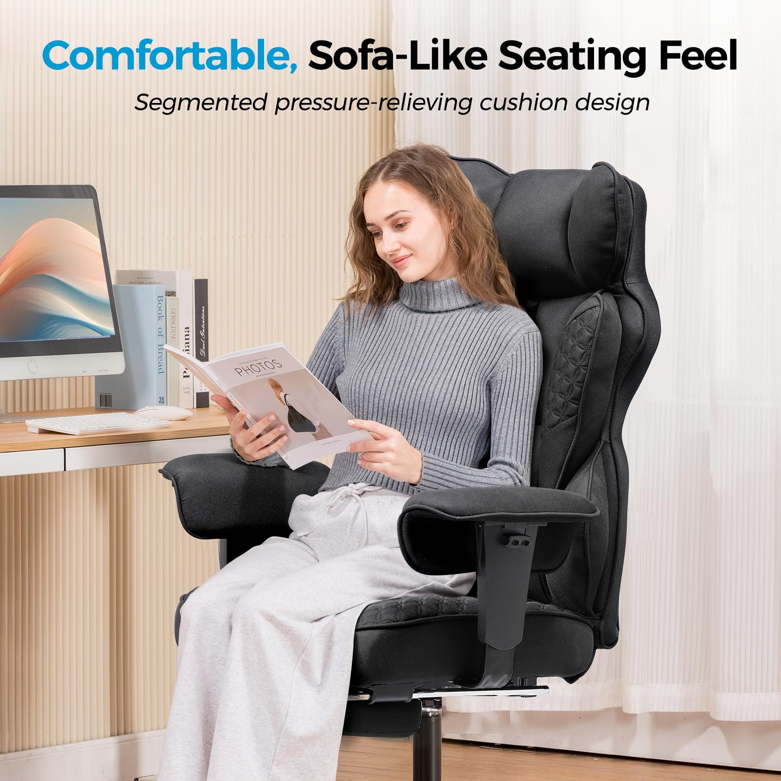 Sofa-Like Seating: This executive chair features pocket spring lumbar support, maintaining elasticity and breathability for long hours of sitting. The widened seat has no restrictive side wings, while the wraparound wing-back design provides a cozy, hugged feeling. With an adjustable footrest, you can sit comfortably in any position—just like relaxing on your own sofa.