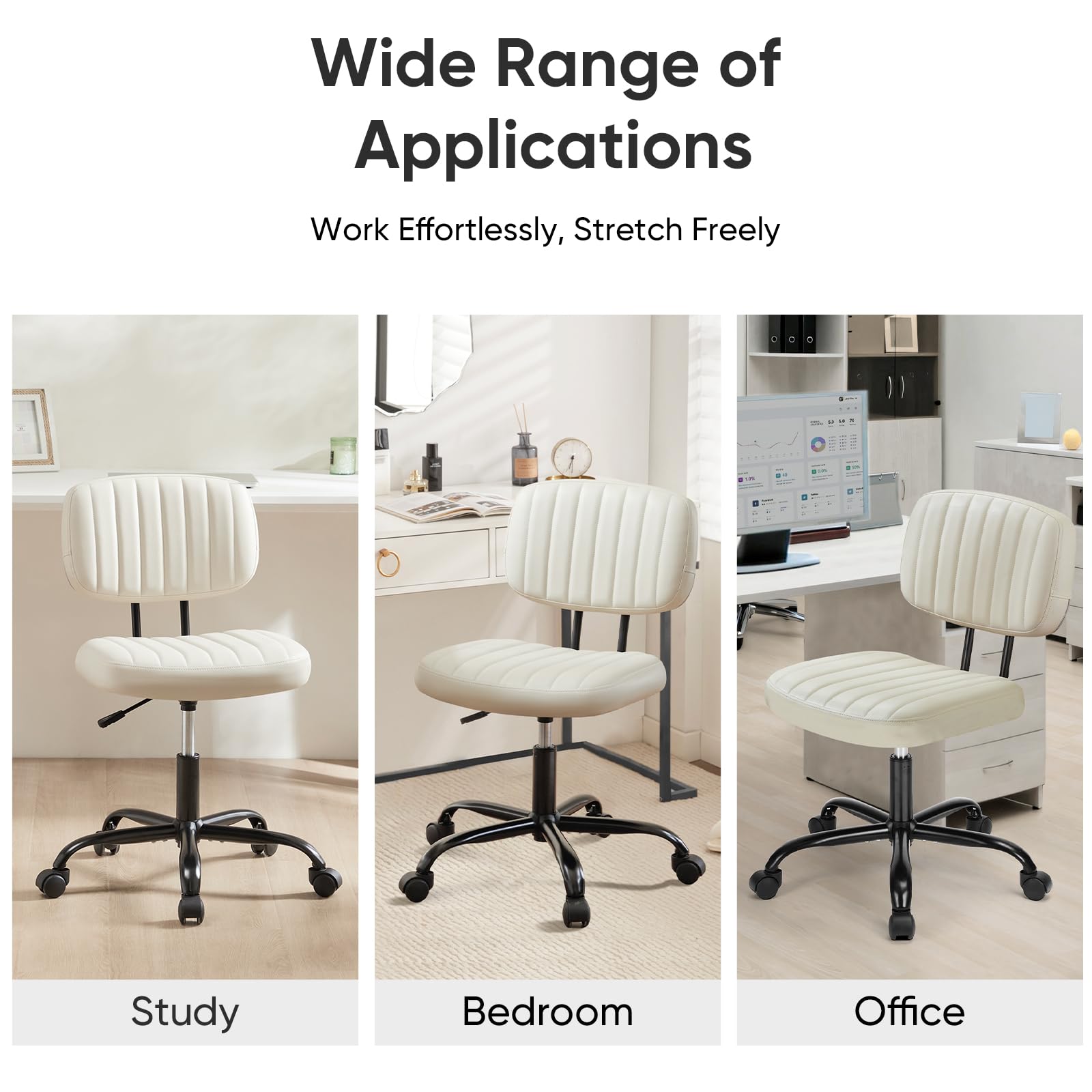 PREMIUM MATERIALS - This small office chair without an armrest is constructed with top-notch materials to guarantee maximum comfort and longevity. It features a high-density, thickened sponge cushion (2.5 inches), that provides exceptional comfort and resilience. The chair is upholstered with high-quality PU leather, ensuring both waterproof protection and breathability through its twill design.