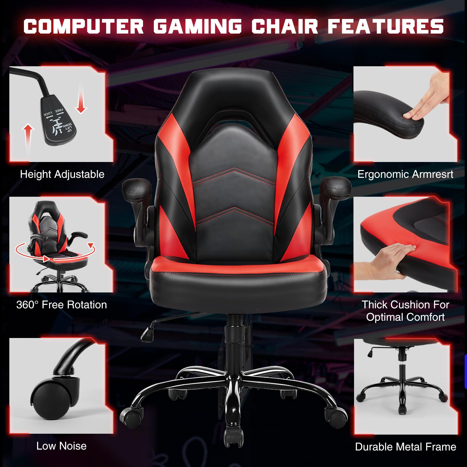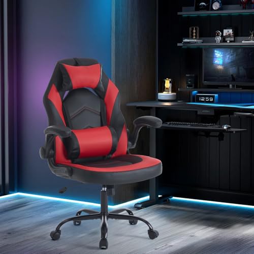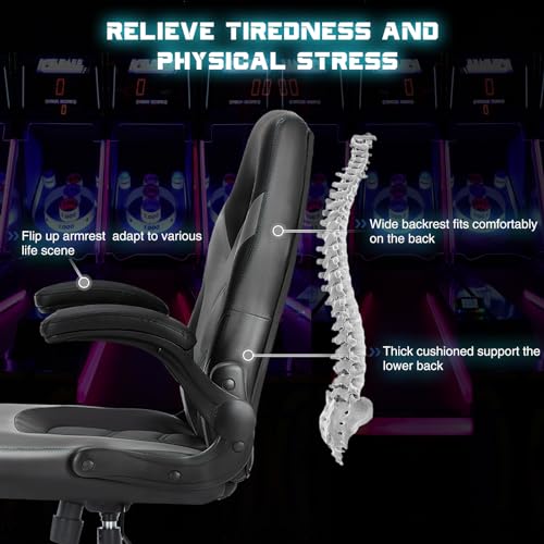 DUMOS Gaming Ergonomic Office Chair for Adults, Height Adjustable Computer Desk Chair with Flip-up Armrests, PU Leather Swivel Video Game Chair with 360° Rolling Wheels, Grey