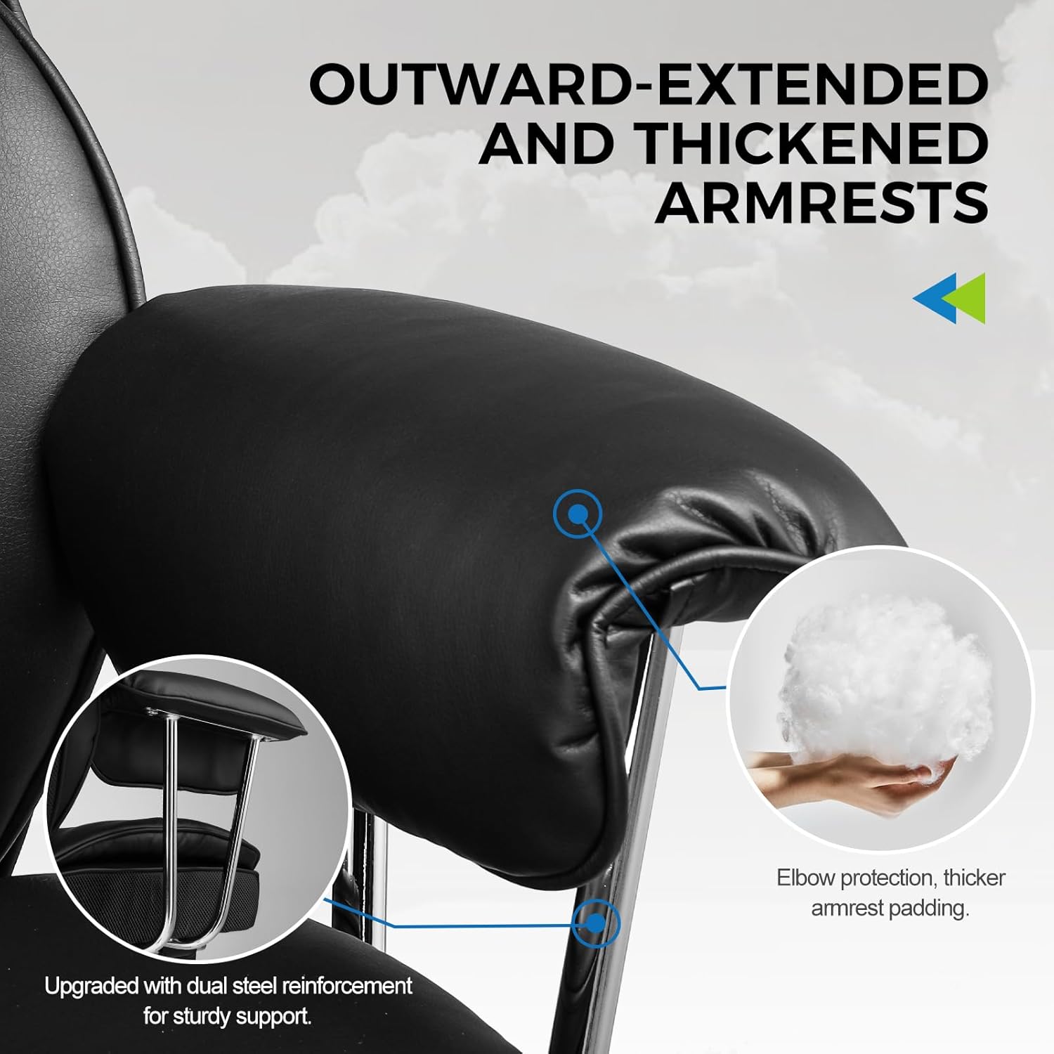 【Built to Last】 The BIFMA-tested five-star base withstands static pressure with a load capacity of 300lbs, and the SGS-3 gas lift passes 120,000+ lift tests. The chair base's diameter is enlarged for stability during maximum recline. The metal armrest frame, in contrast to nylon armrests in other desk chairs, provides enhanced strength and durability.